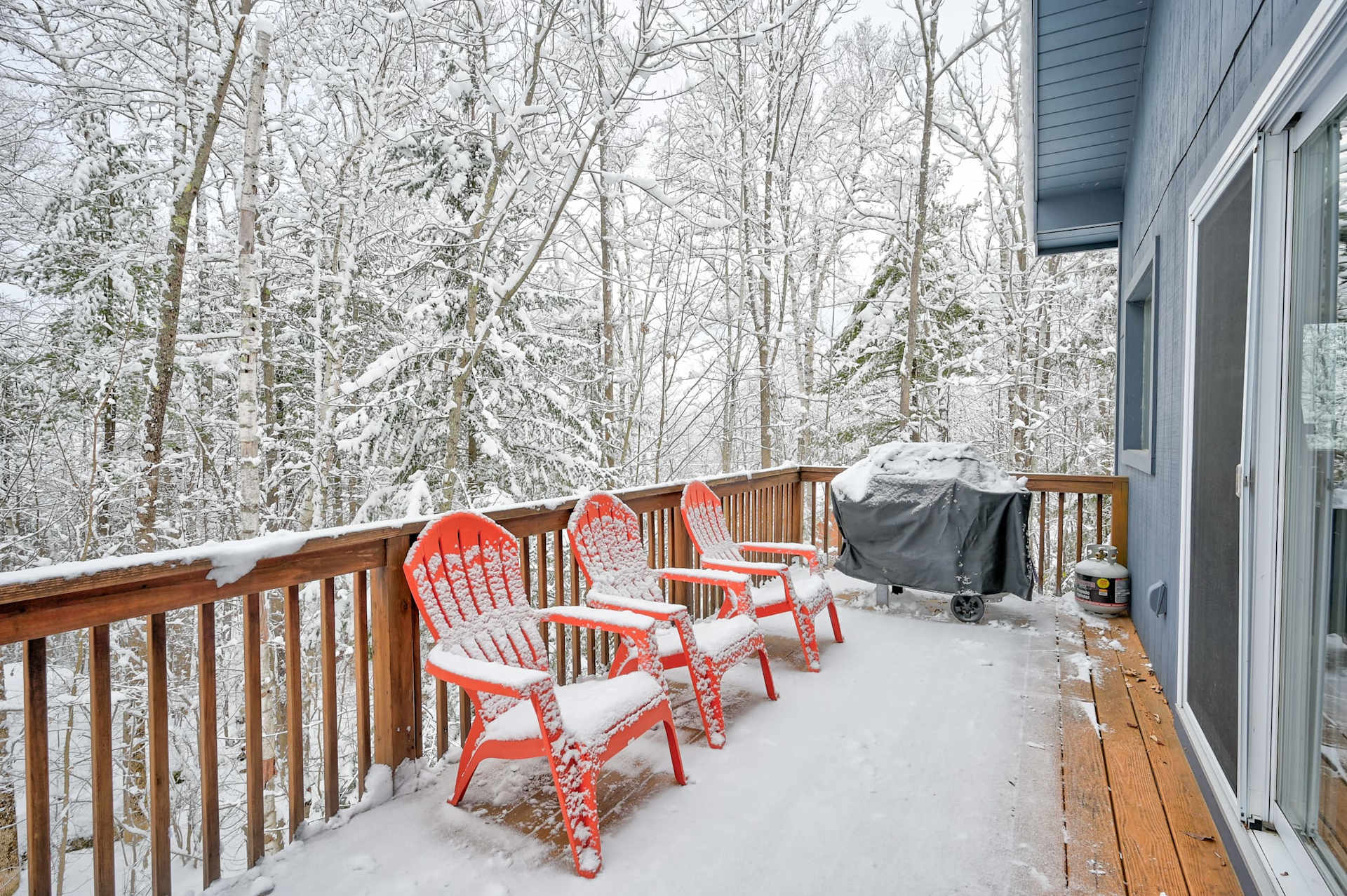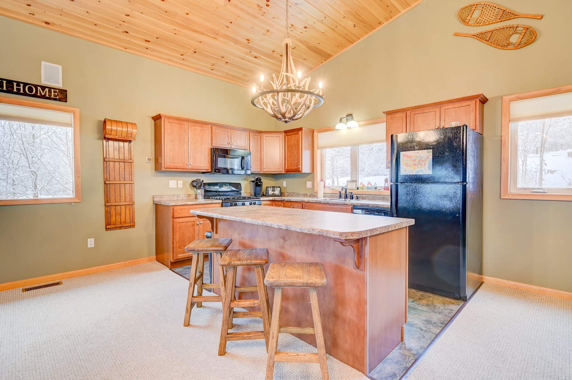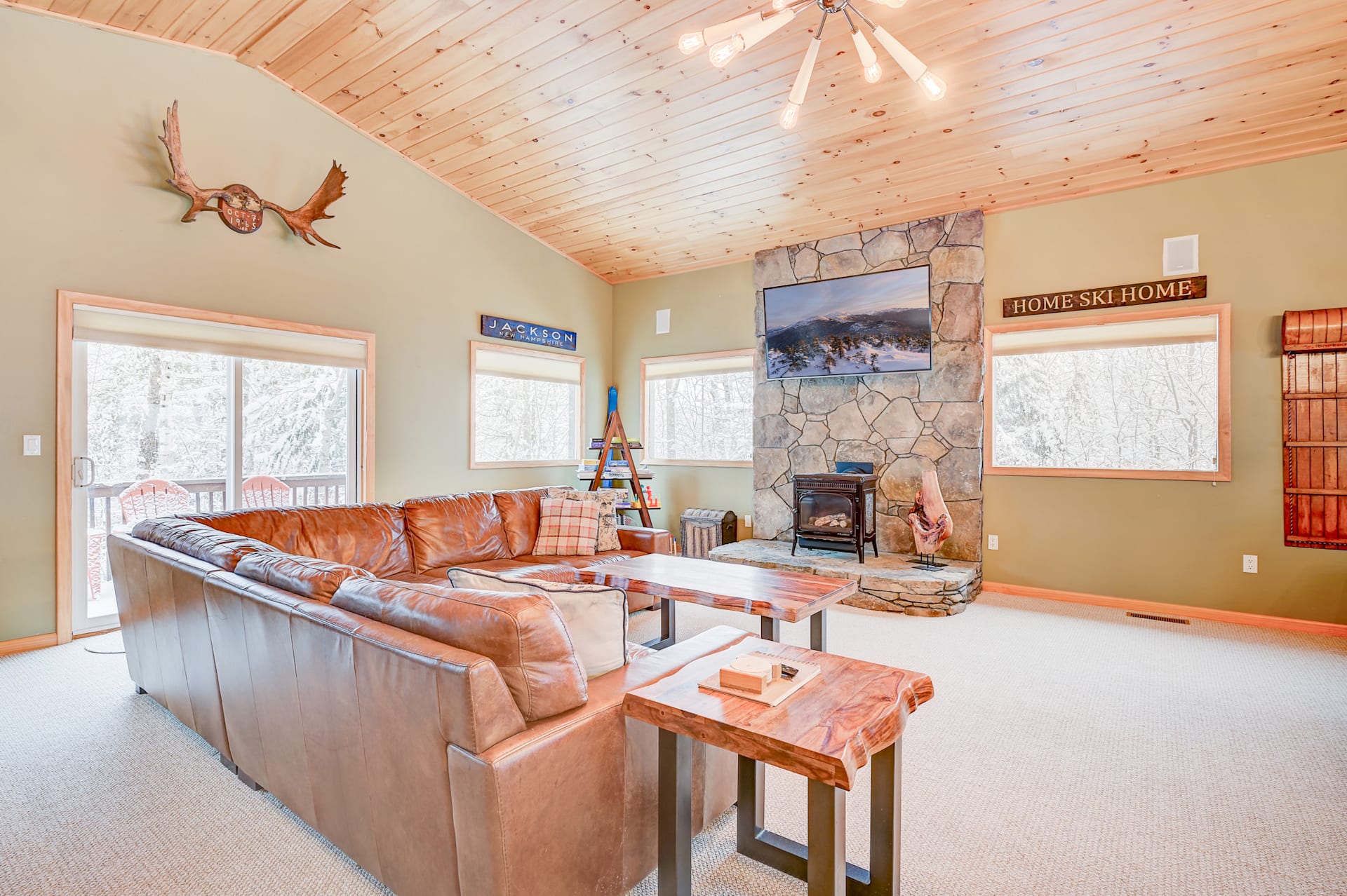 Heading upstairs, the main living level offers an open layout with cathedral ceilings and large picture windows open to the surrounding views. Amenities on this level include a half bathroom, media closet with surround sound, high-end lighting fixtures, a glass slider which opens to an elevated deck in the backyard, and a cozy propane stove set on a stone hearth, perfect for gathering around after a chilly day on the slopes.