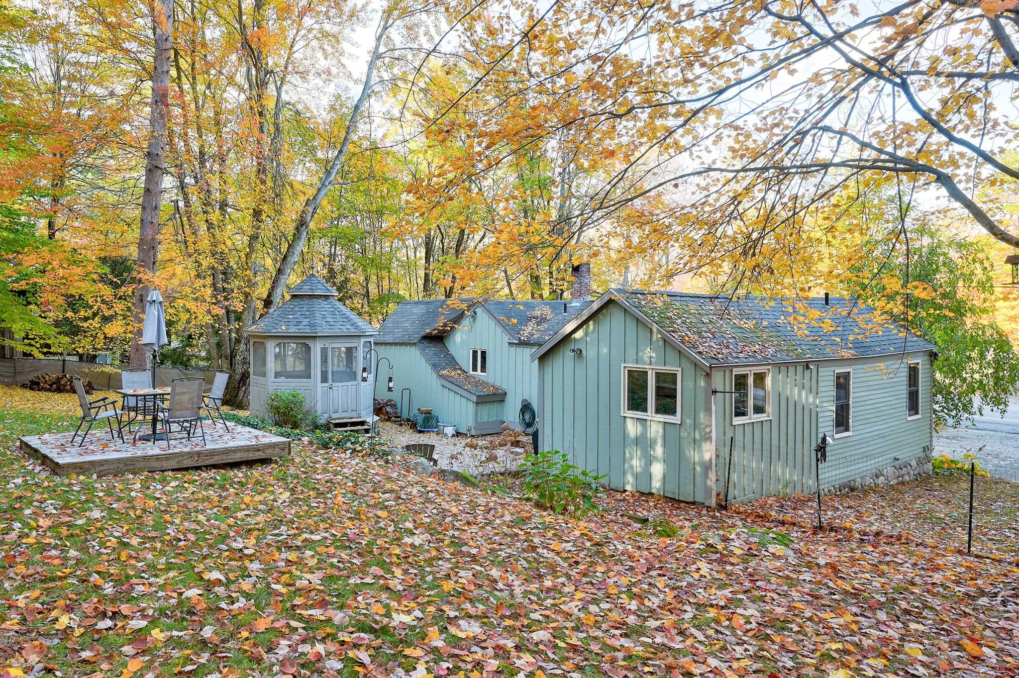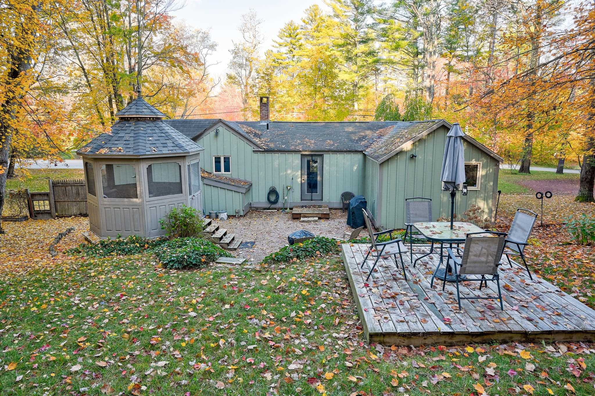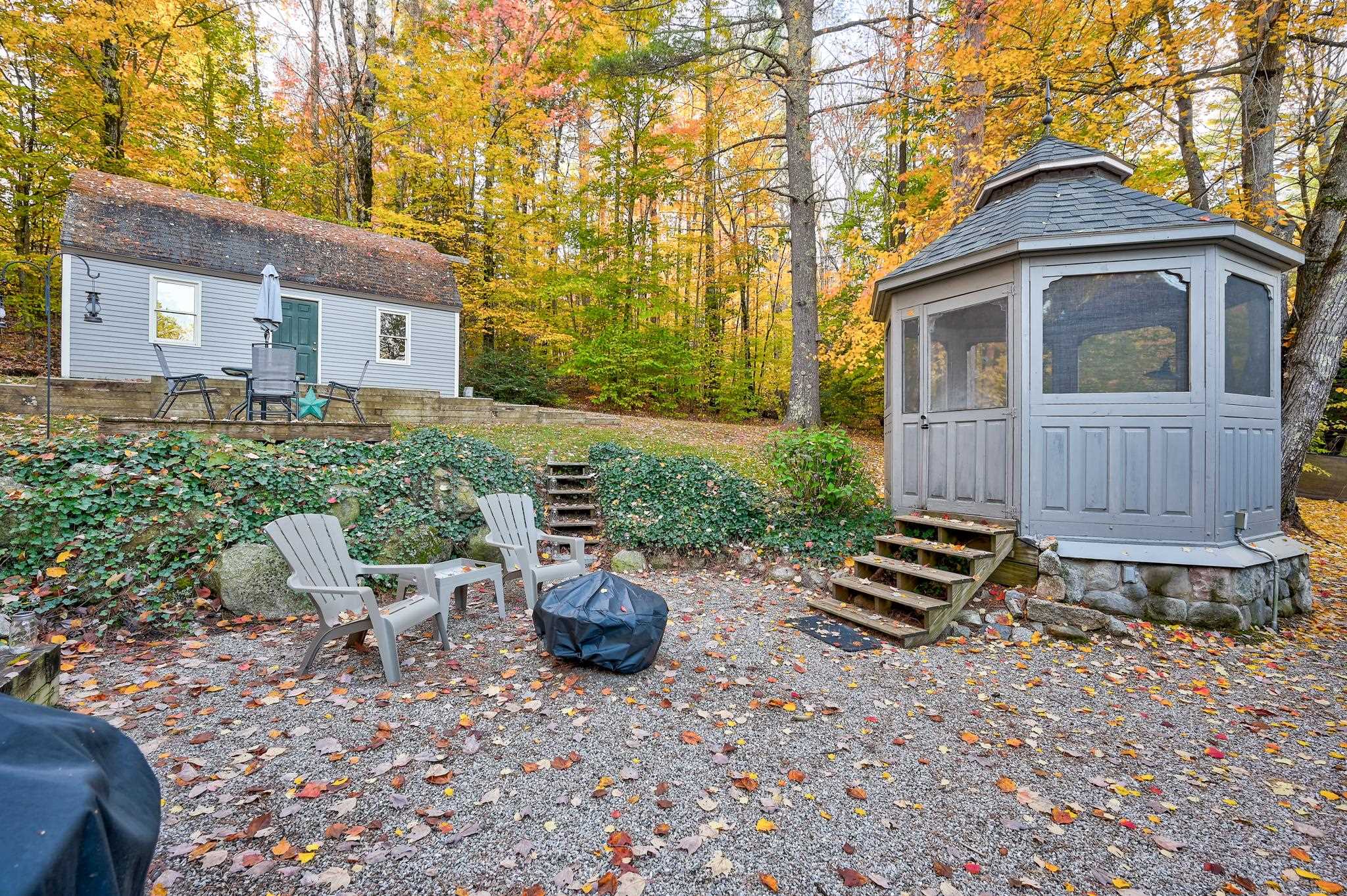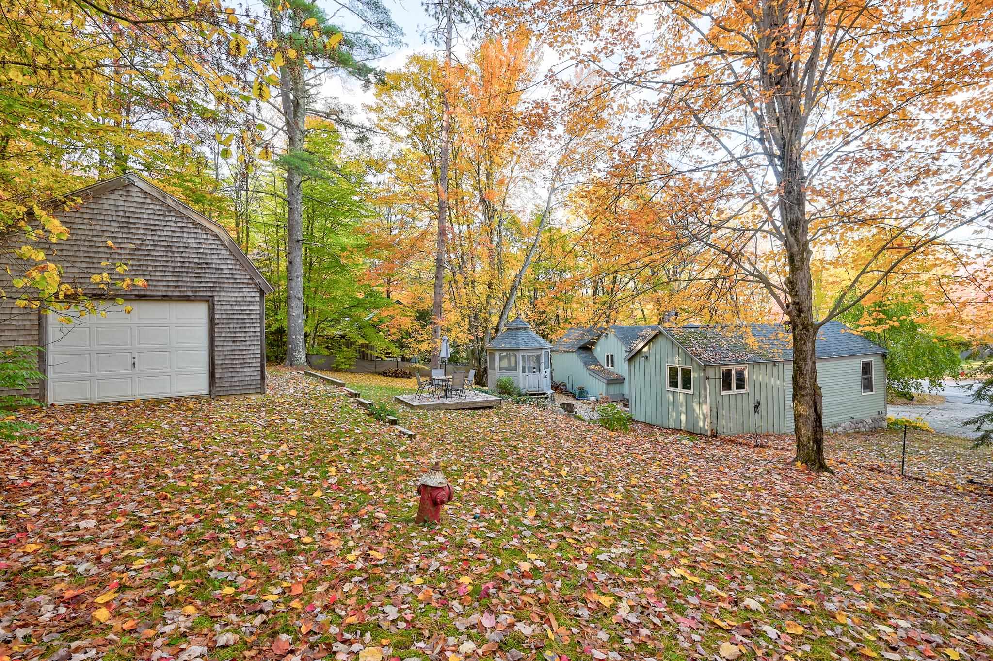 Cozy North Conway bungalow with storybook charm and modern comfort. Located on the North Conway Village side of convenient West Side Road, this 2-bedroom, 1-bath home captures the best of White Mountains living. Enter in through the mudroom with room to store your gear, then into the home. The bright kitchen feels both nostalgic and fresh, with just the right mix of character and updates. Tall ceilings, brick chimney, beadboard cabinets, stainless steel appliances, and an apron sink all lend to the charm. The living room has wide pine floors, a cozy woodstove with a floor-to-ceiling stone hearth, and custom built-in bookshelves. Perfect space to grab a book and curl up by the fire and watch the snow fall through the glass door facing towards the backyard. A laundry room and full bathroom separate the 2 bedrooms. Step outside to find a spacious yard surrounded by mature trees, which is truly the highlight of the property! With .67 acres, there's room for gardens, a firepit area to watch the stars, and a gazebo with seating (also wired for a hot tub!) Can't forget to mention the barn/garage in the fully fenced backyard with 2 doors to pull through with a car, lawnmower, snowmobiles, and any toys you want! Or use it as a game room or hangout space. Good things come in small packages! Sold fully furnished.