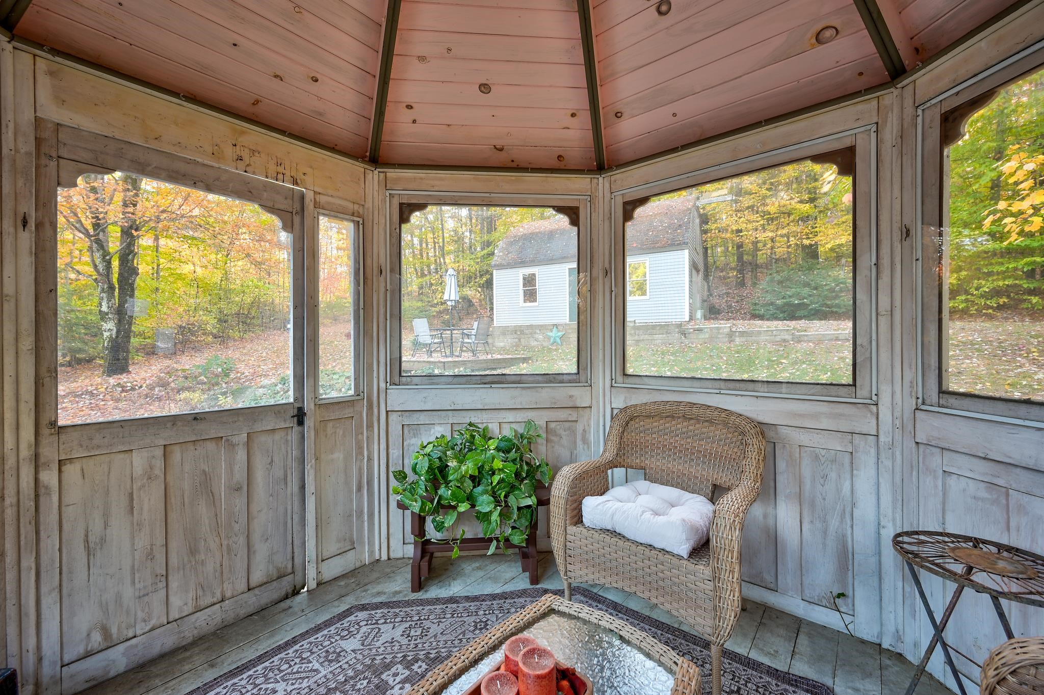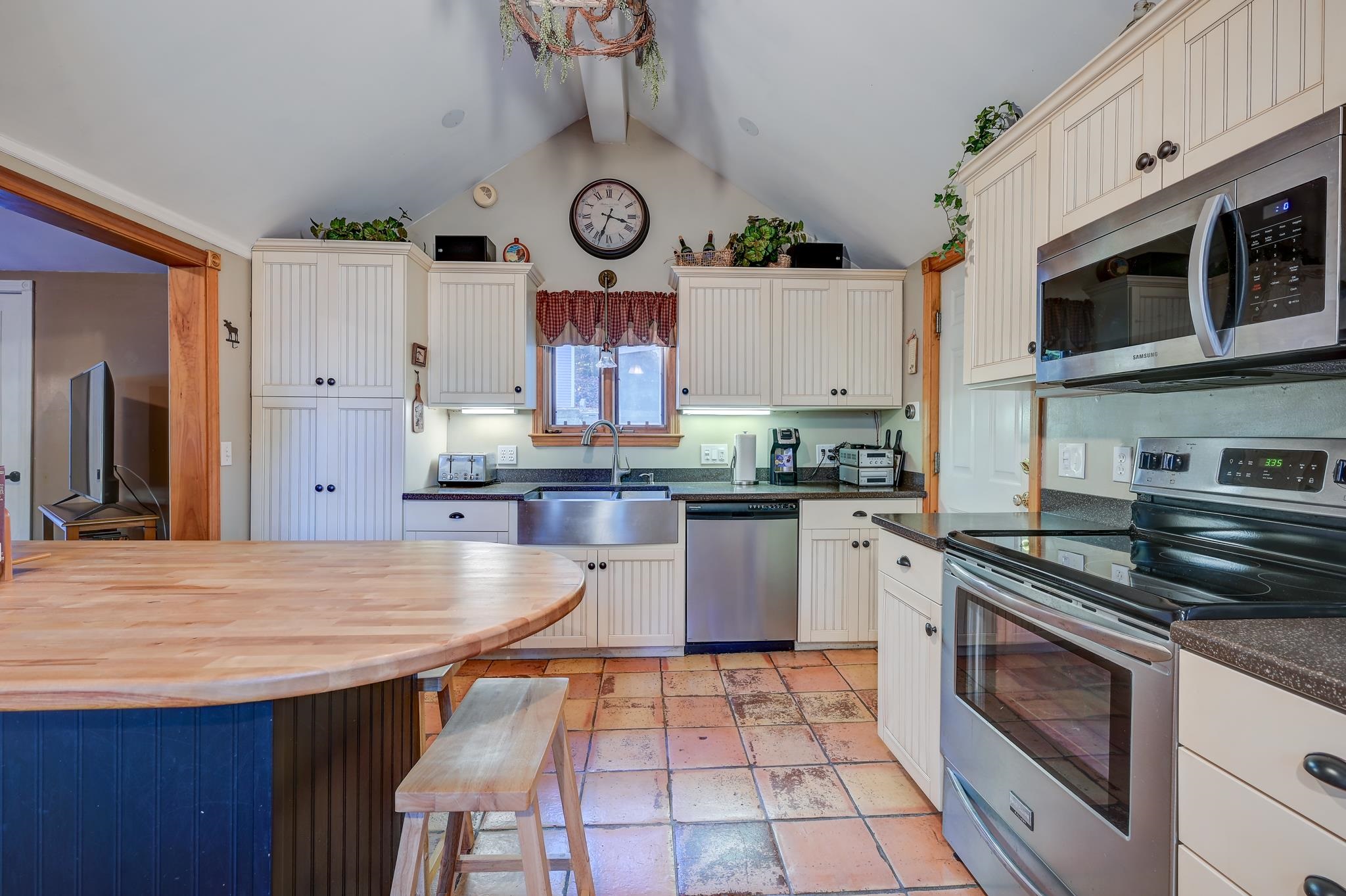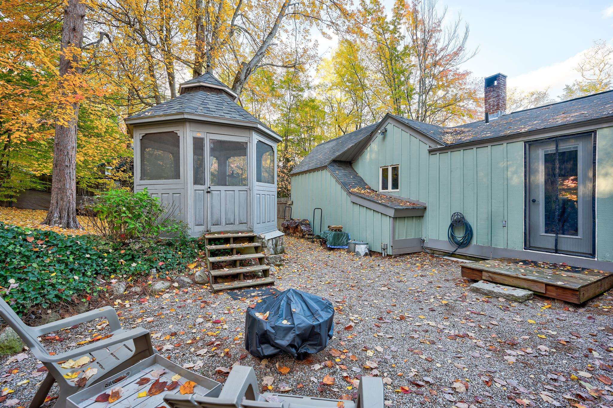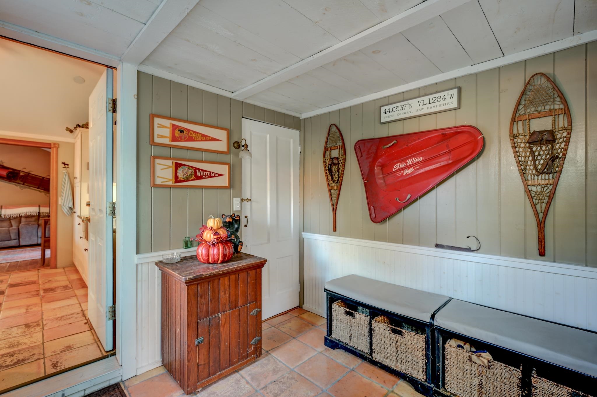 Cozy North Conway bungalow with storybook charm and modern comfort. Located on the North Conway Village side of convenient West Side Road, this 2-bedroom, 1-bath home captures the best of White Mountains living. Enter in through the mudroom with room to store your gear, then into the home. The bright kitchen feels both nostalgic and fresh, with just the right mix of character and updates. Tall ceilings, brick chimney, beadboard cabinets, stainless steel appliances, and an apron sink all lend to the charm. The living room has wide pine floors, a cozy woodstove with a floor-to-ceiling stone hearth, and custom built-in bookshelves. Perfect space to grab a book and curl up by the fire and watch the snow fall through the glass door facing towards the backyard. A laundry room and full bathroom separate the 2 bedrooms. Step outside to find a spacious yard surrounded by mature trees, which is truly the highlight of the property! With .67 acres, there's room for gardens, a firepit area to watch the stars, and a gazebo with seating (also wired for a hot tub!) Can't forget to mention the barn/garage in the fully fenced backyard with 2 doors to pull through with a car, lawnmower, snowmobiles, and any toys you want! Or use it as a game room or hangout space. Good things come in small packages! Sold fully furnished.