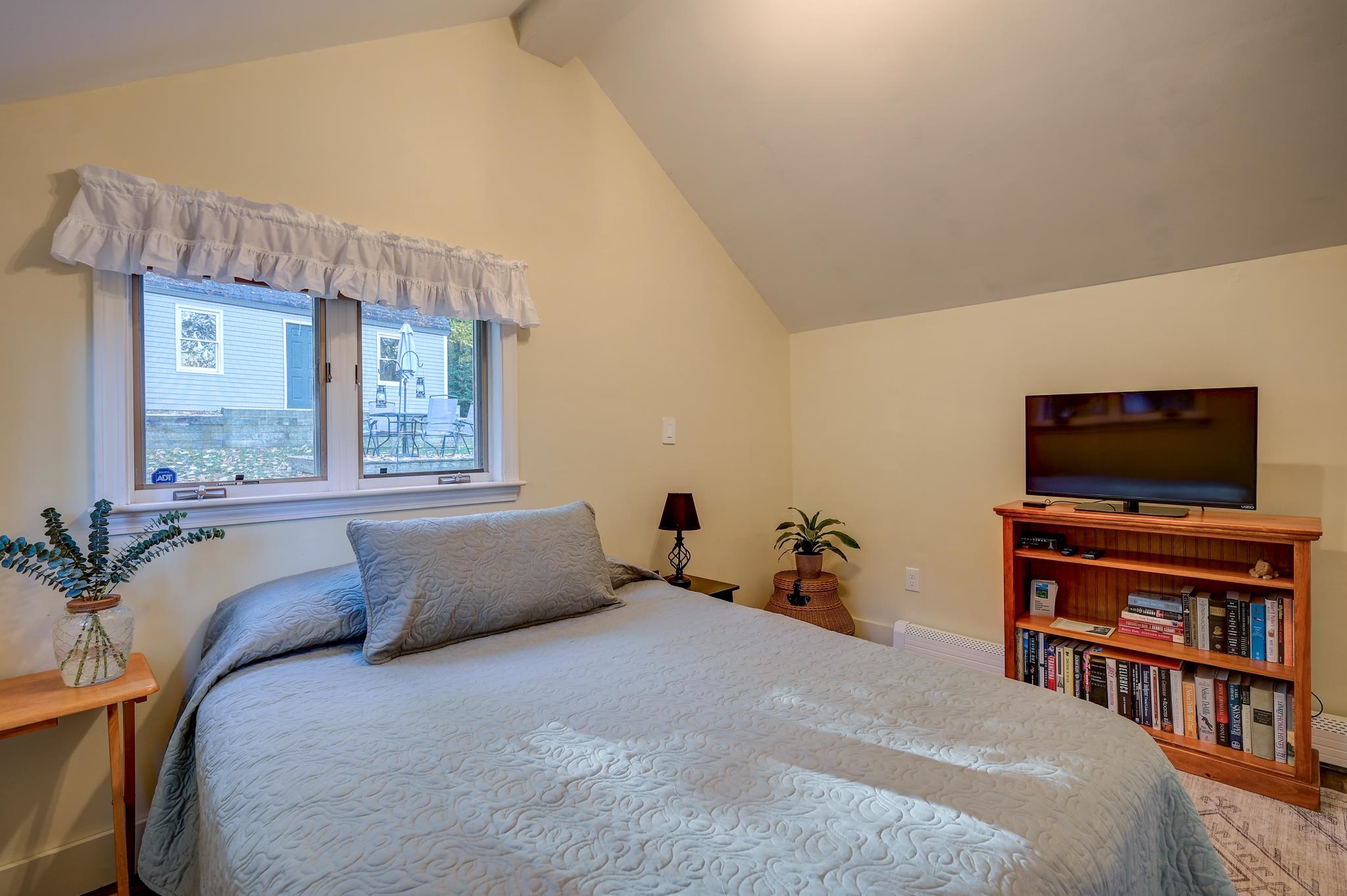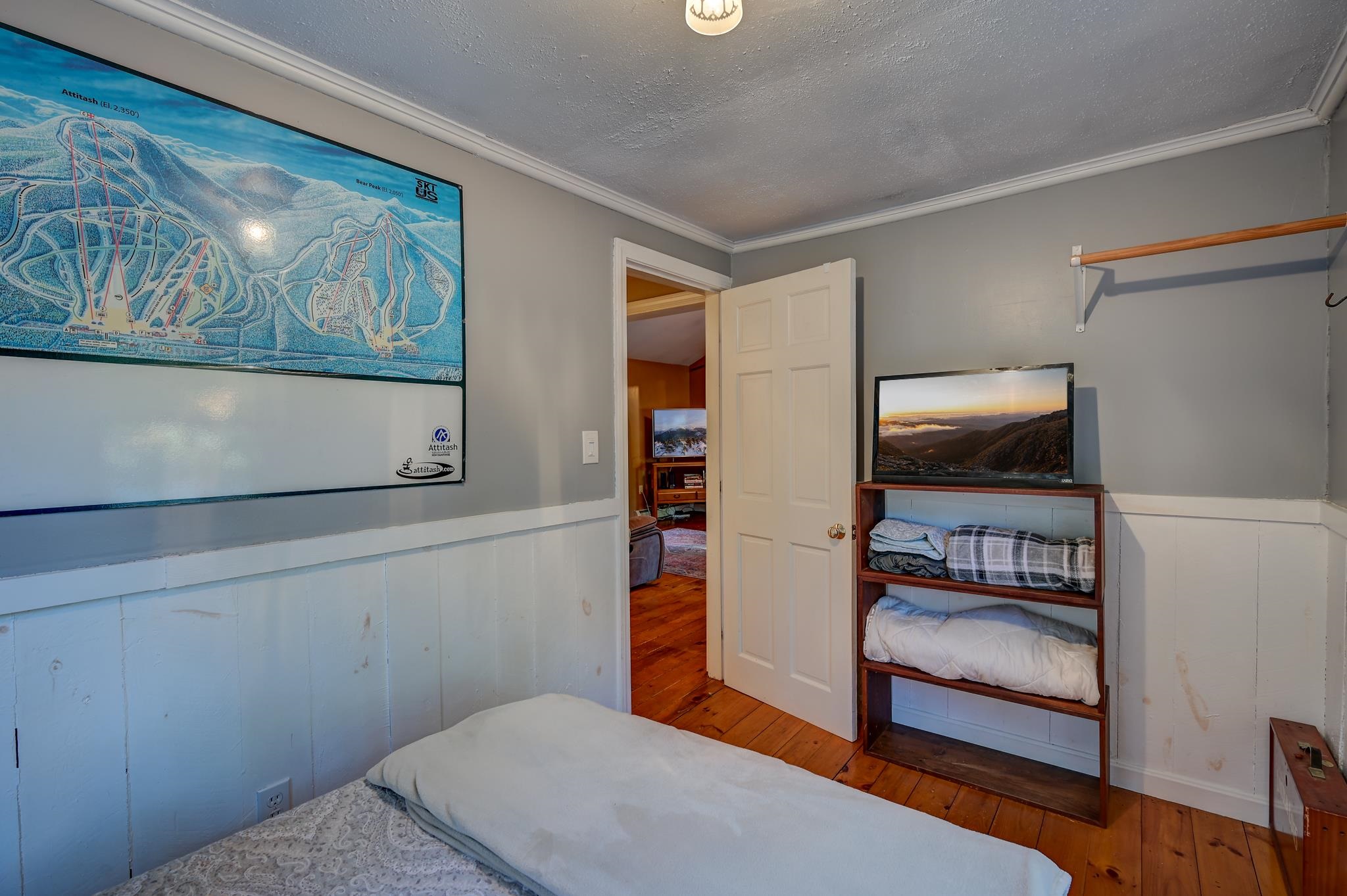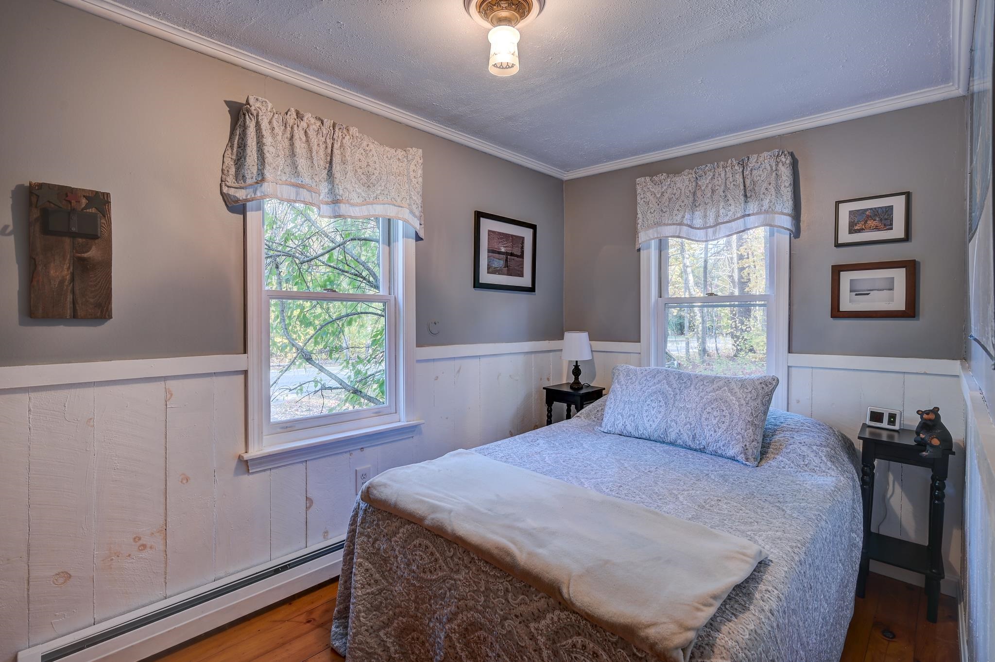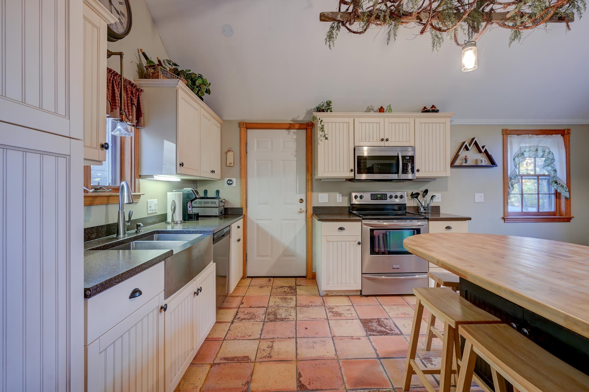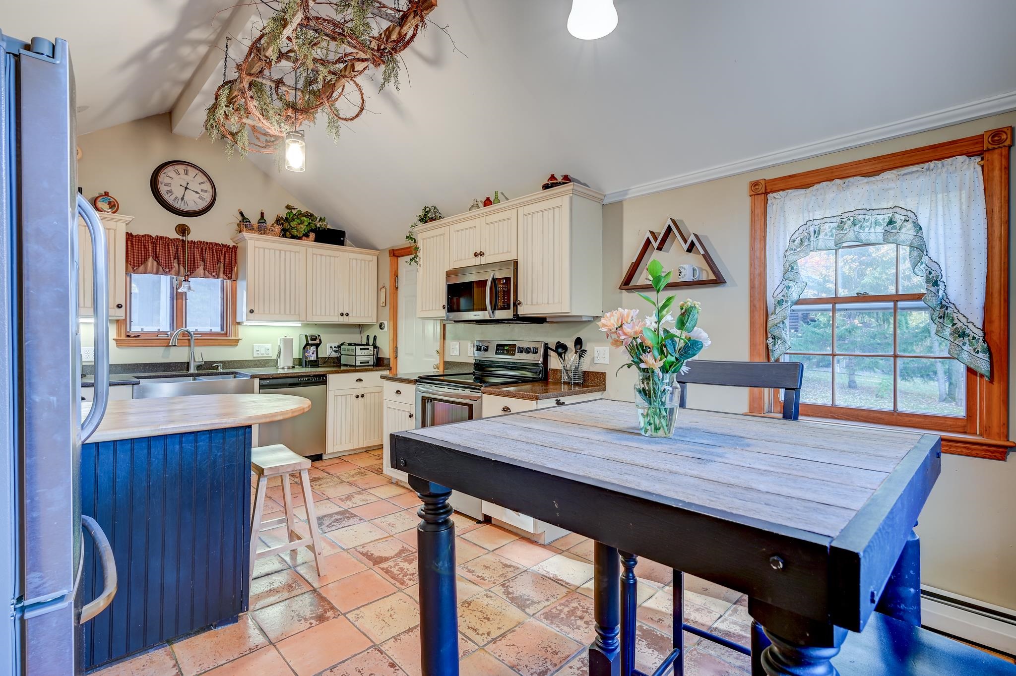 Cozy North Conway bungalow with storybook charm and modern comfort. Located on the North Conway Village side of convenient West Side Road, this 2-bedroom, 1-bath home captures the best of White Mountains living. Enter in through the mudroom with room to store your gear, then into the home. The bright kitchen feels both nostalgic and fresh, with just the right mix of character and updates. Tall ceilings, brick chimney, beadboard cabinets, stainless steel appliances, and an apron sink all lend to the charm. The living room has wide pine floors, a cozy woodstove with a floor-to-ceiling stone hearth, and custom built-in bookshelves. Perfect space to grab a book and curl up by the fire and watch the snow fall through the glass door facing towards the backyard. A laundry room and full bathroom separate the 2 bedrooms. Step outside to find a spacious yard surrounded by mature trees, which is truly the highlight of the property! With .67 acres, there's room for gardens, a firepit area to watch the stars, and a gazebo with seating (also wired for a hot tub!) Can't forget to mention the barn/garage in the fully fenced backyard with 2 doors to pull through with a car, lawnmower, snowmobiles, and any toys you want! Or use it as a game room or hangout space. Good things come in small packages! Sold fully furnished.
