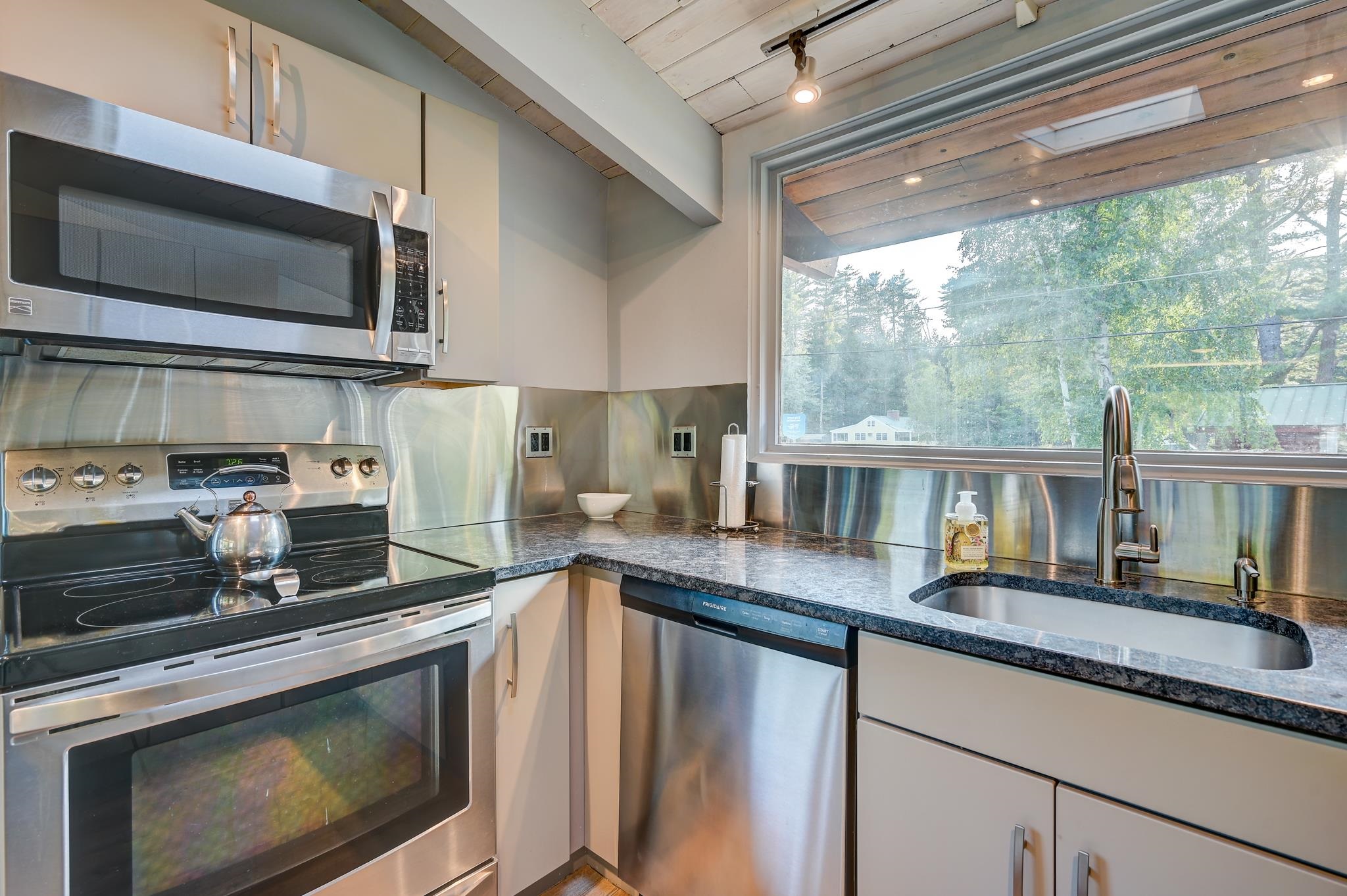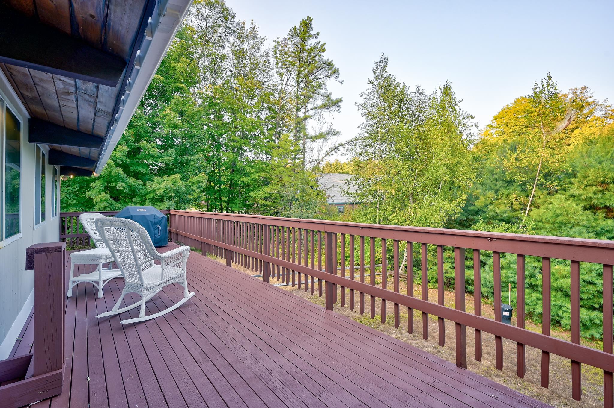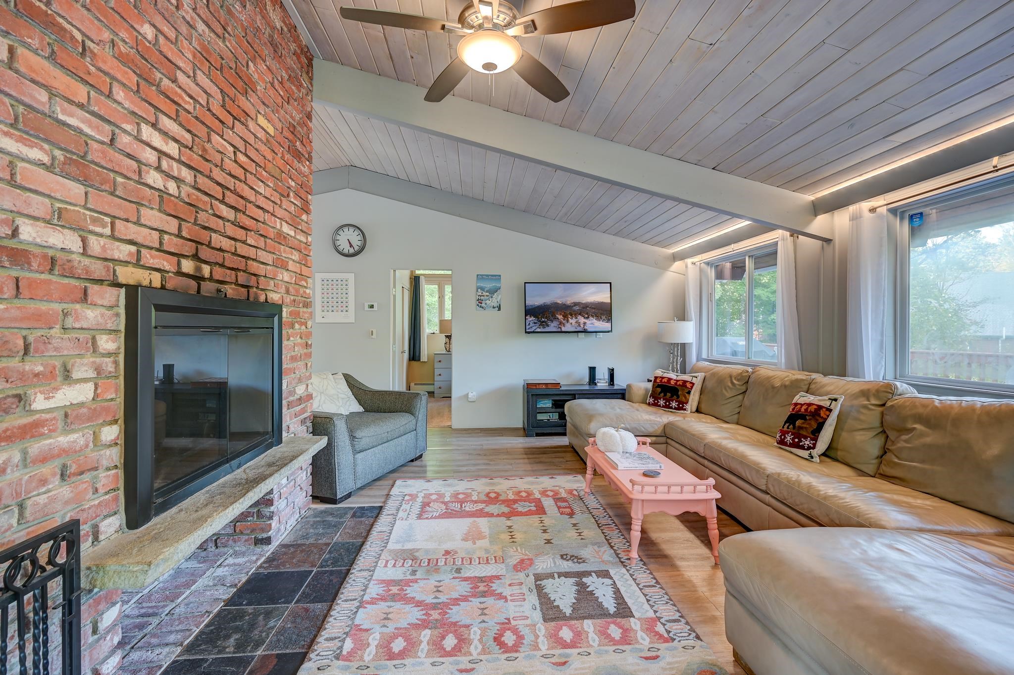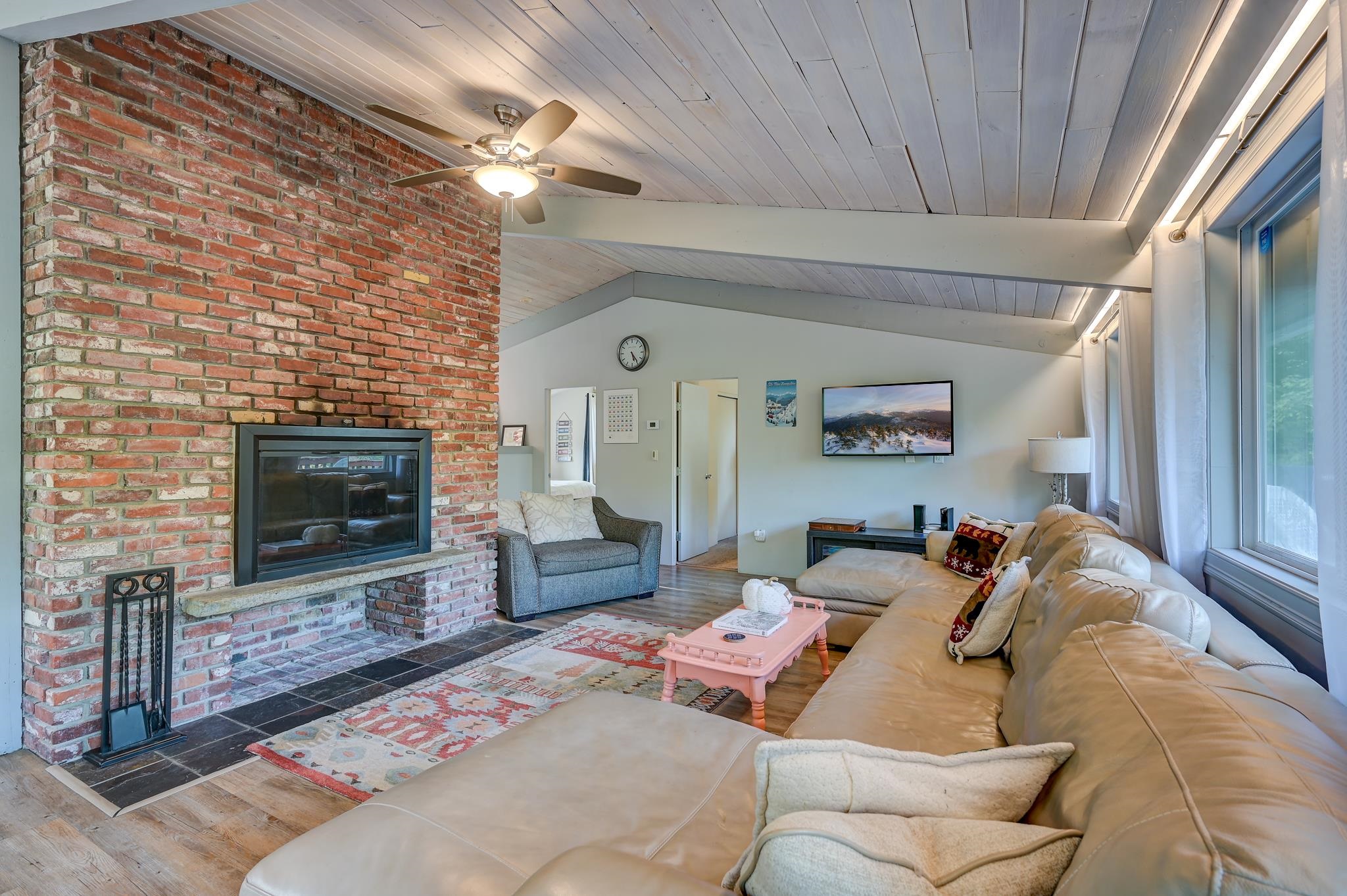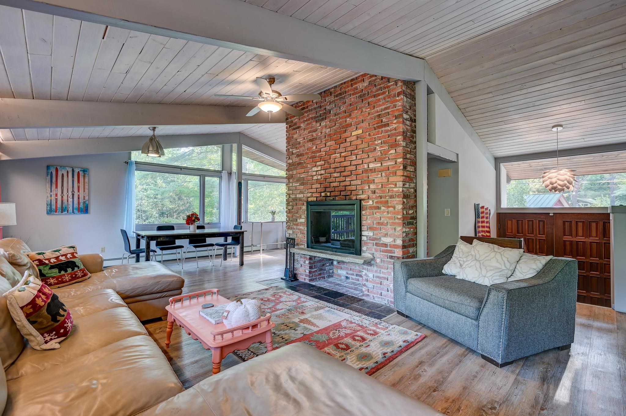 If you've been looking for your Cranmore Mountain home base, you've found it! This charming contemporary is set in one of North Conway's most enviable locations, 749 steps (seriously!) from the chairlift line at Cranmore! Designed as the dream vacation getaway, this home has two stories, each designed to function as a separate unit, with 4 total bedrooms, plenty of space for guests. On the main upper level, you'll find a bright and open living space with cathedral ceilings, plenty of oversized windows that pour in natural light, a cozy wood-burning fireplace tucked into a floor-to-ceiling brick surround, a full kitchen equipped with granite countertops, stainless steel appliances, and ample cabinet space. Sliders lead out to a freshly painted deck. There are two nice-sized bedrooms upstairs, both kept airy and bright by tall ceilings. A full bathroom with stacked laundry is in the hall. Downstairs, you'll find a similar layout with a second wood-burning fireplace in the cozy living area, a kitchen with an electric range, dishwasher, and mini-fridge, plus two additional bedrooms. The backyard has plenty of level space for games, and a large storage shed for your off-season toys. Enjoy year-round recreation at the mountain, including the paved 2.9 mile MWV Rec Path. Come and enjoy North Conway's fastest-growing area at a fraction of the price of the new construction homes that surround it!