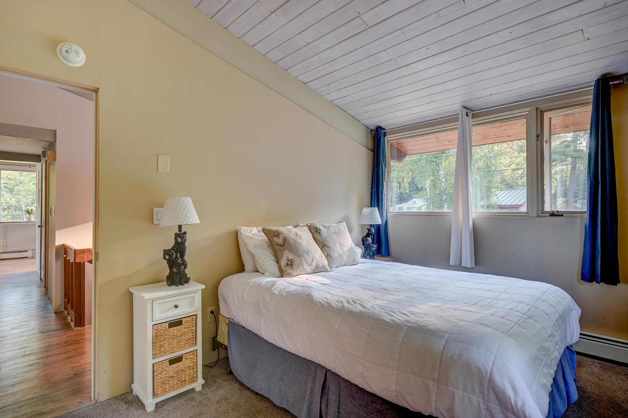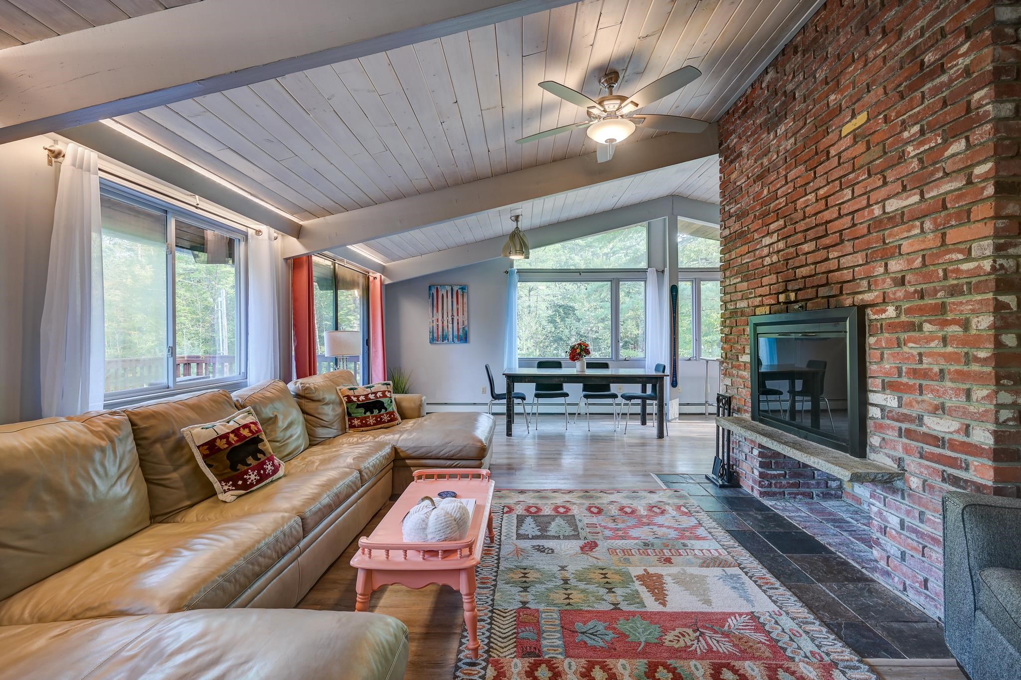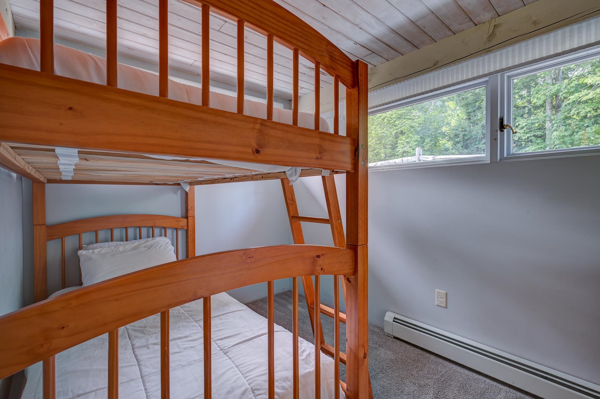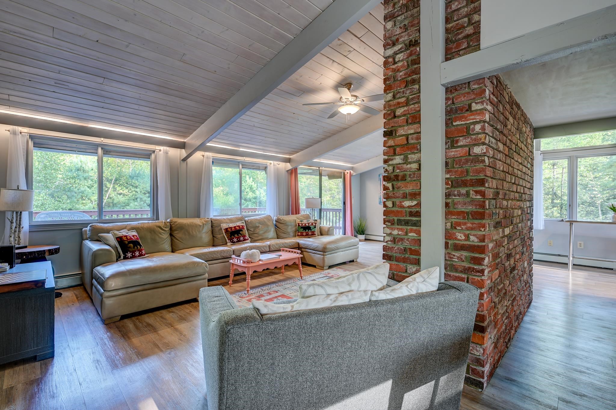 If you've been looking for your Cranmore Mountain home base, you've found it! This charming contemporary is set in one of North Conway's most enviable locations, 749 steps (seriously!) from the chairlift line at Cranmore! Designed as the dream vacation getaway, this home has two stories, each designed to function as a separate unit, with 4 total bedrooms, plenty of space for guests. On the main upper level, you'll find a bright and open living space with cathedral ceilings, plenty of oversized windows that pour in natural light, a cozy wood-burning fireplace tucked into a floor-to-ceiling brick surround, a full kitchen equipped with granite countertops, stainless steel appliances, and ample cabinet space. Sliders lead out to a freshly painted deck. There are two nice-sized bedrooms upstairs, both kept airy and bright by tall ceilings. A full bathroom with stacked laundry is in the hall. Downstairs, you'll find a similar layout with a second wood-burning fireplace in the cozy living area, a kitchen with an electric range, dishwasher, and mini-fridge, plus two additional bedrooms. The backyard has plenty of level space for games, and a large storage shed for your off-season toys. Enjoy year-round recreation at the mountain, including the paved 2.9 mile MWV Rec Path. Come and enjoy North Conway's fastest-growing area at a fraction of the price of the new construction homes that surround it!