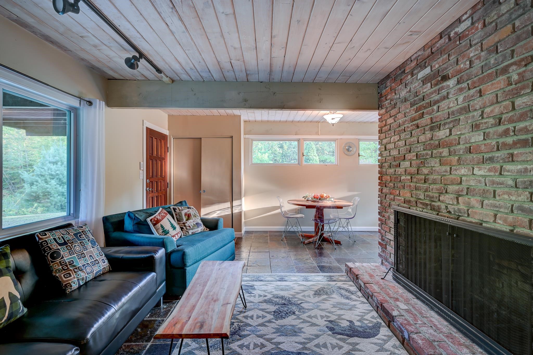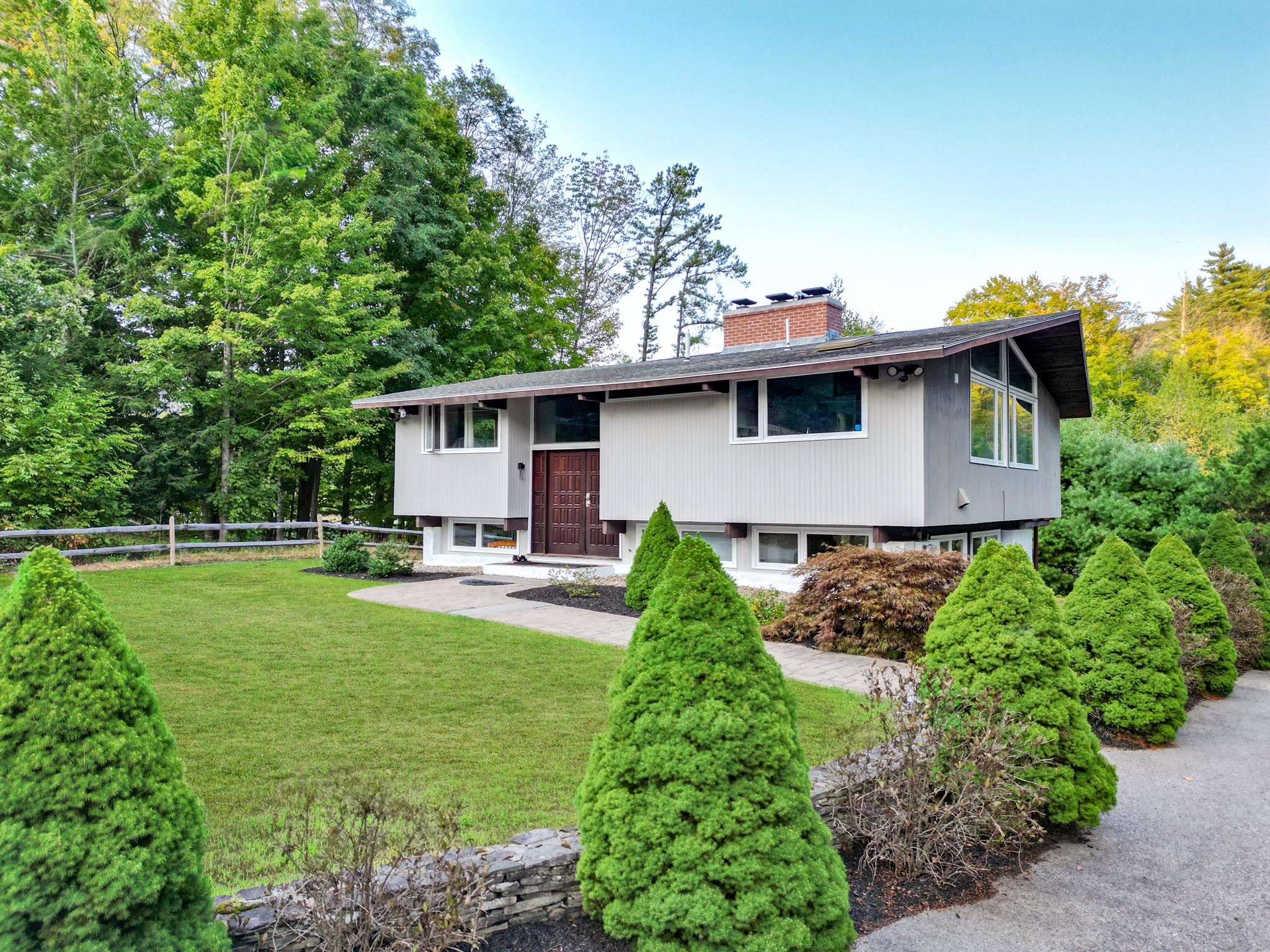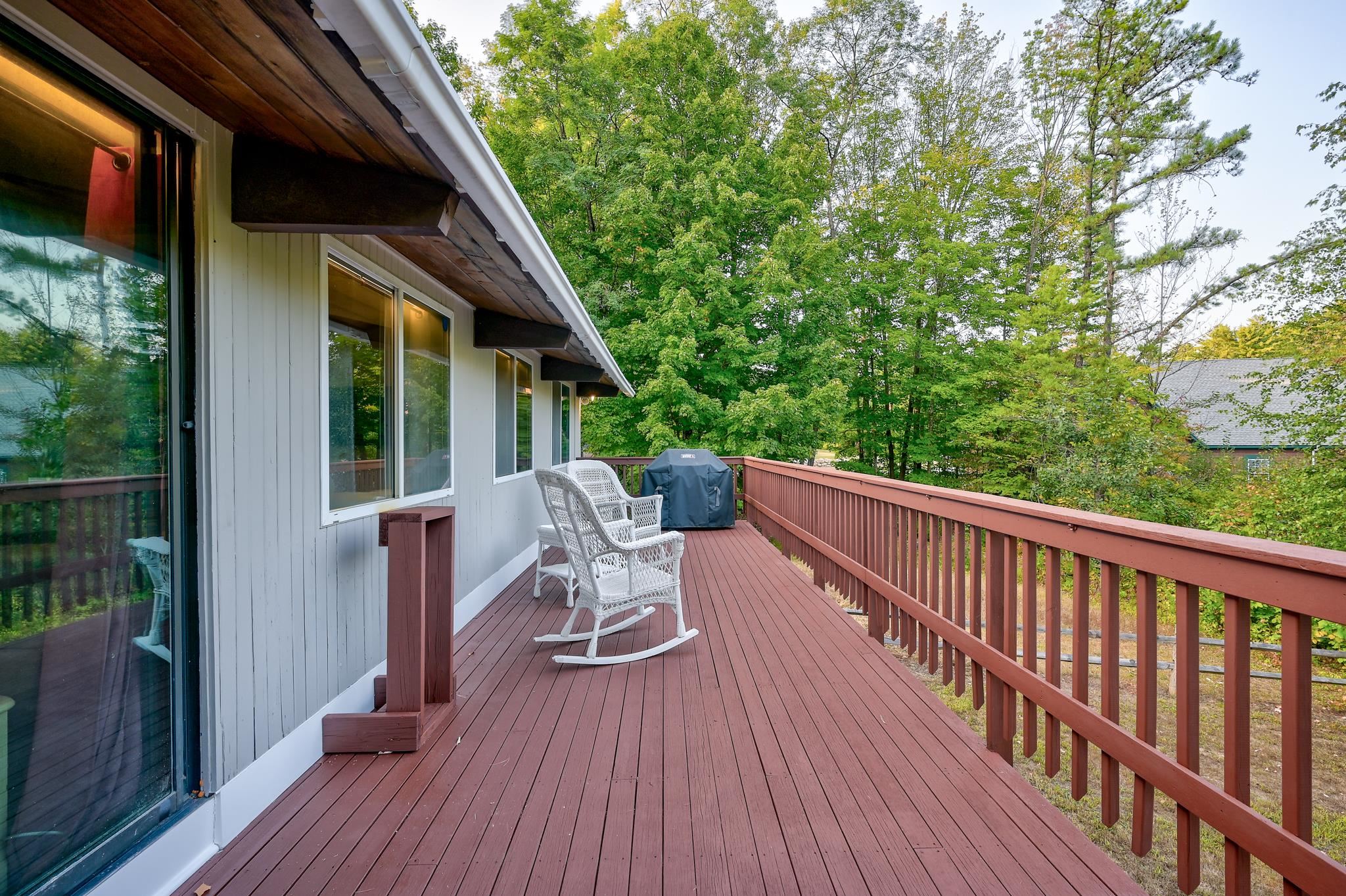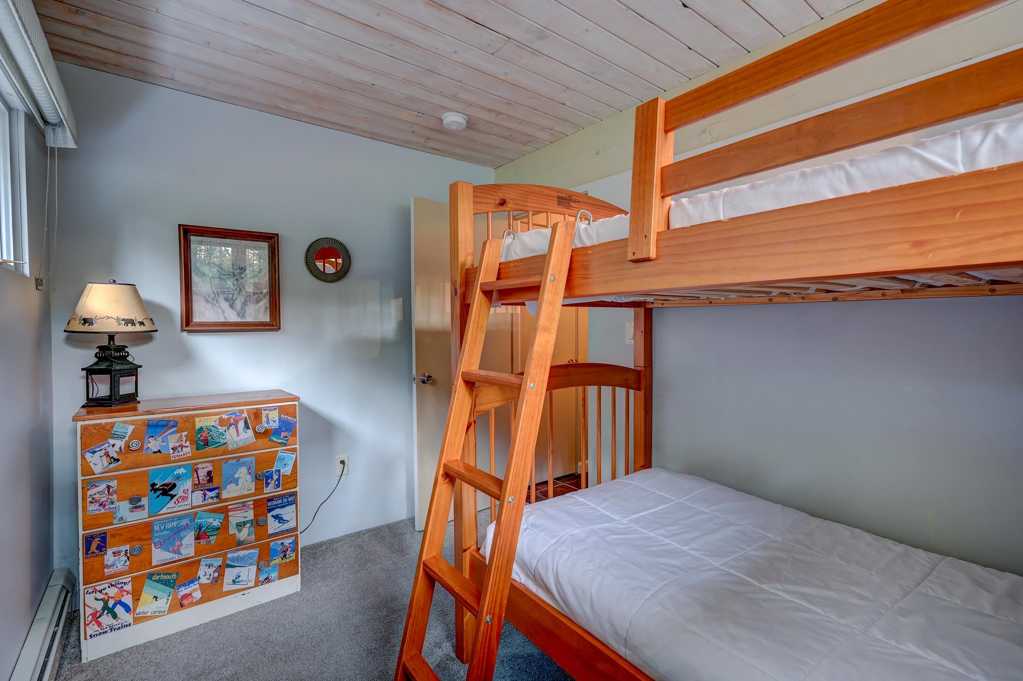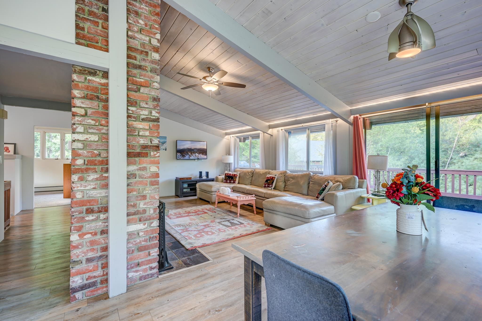 If you've been looking for your Cranmore Mountain home base, you've found it! This charming contemporary is set in one of North Conway's most enviable locations, 749 steps (seriously!) from the chairlift line at Cranmore! Designed as the dream vacation getaway, this home has two stories, each designed to function as a separate unit, with 4 total bedrooms, plenty of space for guests. On the main upper level, you'll find a bright and open living space with cathedral ceilings, plenty of oversized windows that pour in natural light, a cozy wood-burning fireplace tucked into a floor-to-ceiling brick surround, a full kitchen equipped with granite countertops, stainless steel appliances, and ample cabinet space. Sliders lead out to a freshly painted deck. There are two nice-sized bedrooms upstairs, both kept airy and bright by tall ceilings. A full bathroom with stacked laundry is in the hall. Downstairs, you'll find a similar layout with a second wood-burning fireplace in the cozy living area, a kitchen with an electric range, dishwasher, and mini-fridge, plus two additional bedrooms. The backyard has plenty of level space for games, and a large storage shed for your off-season toys. Enjoy year-round recreation at the mountain, including the paved 2.9 mile MWV Rec Path. Come and enjoy North Conway's fastest-growing area at a fraction of the price of the new construction homes that surround it!