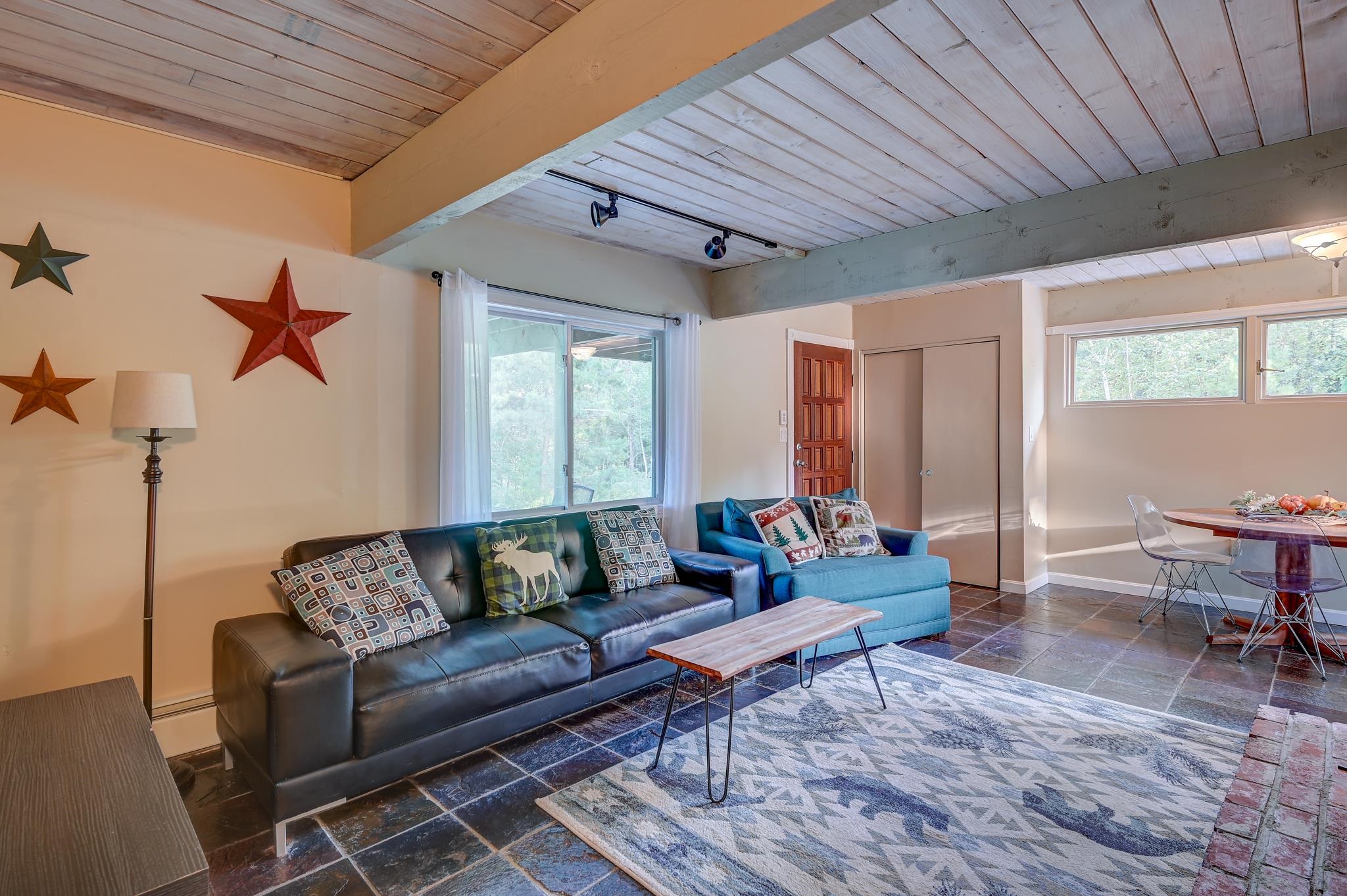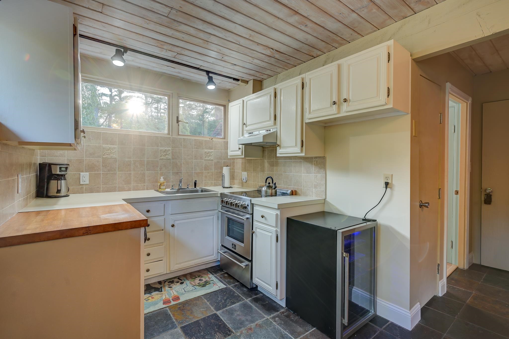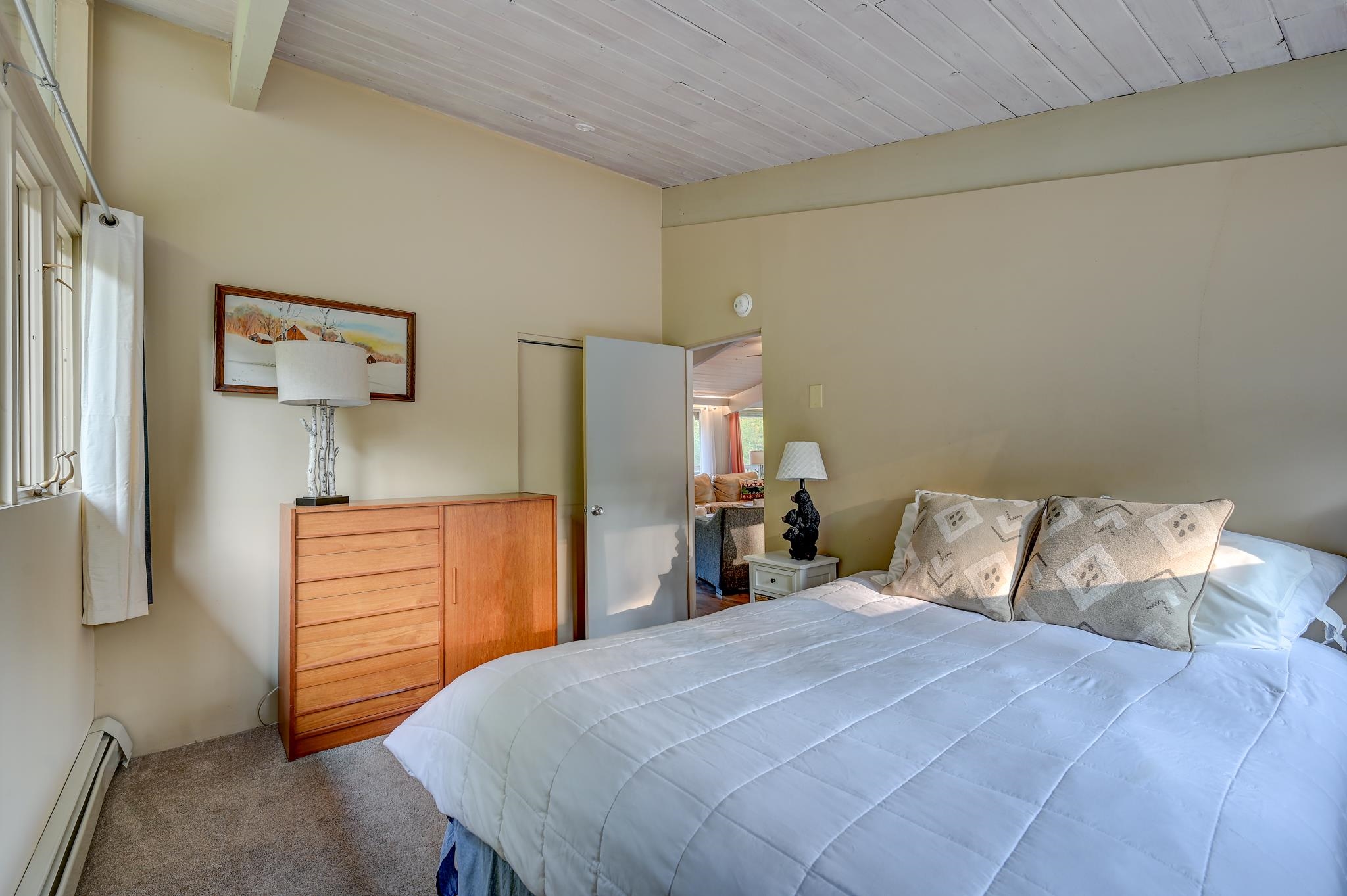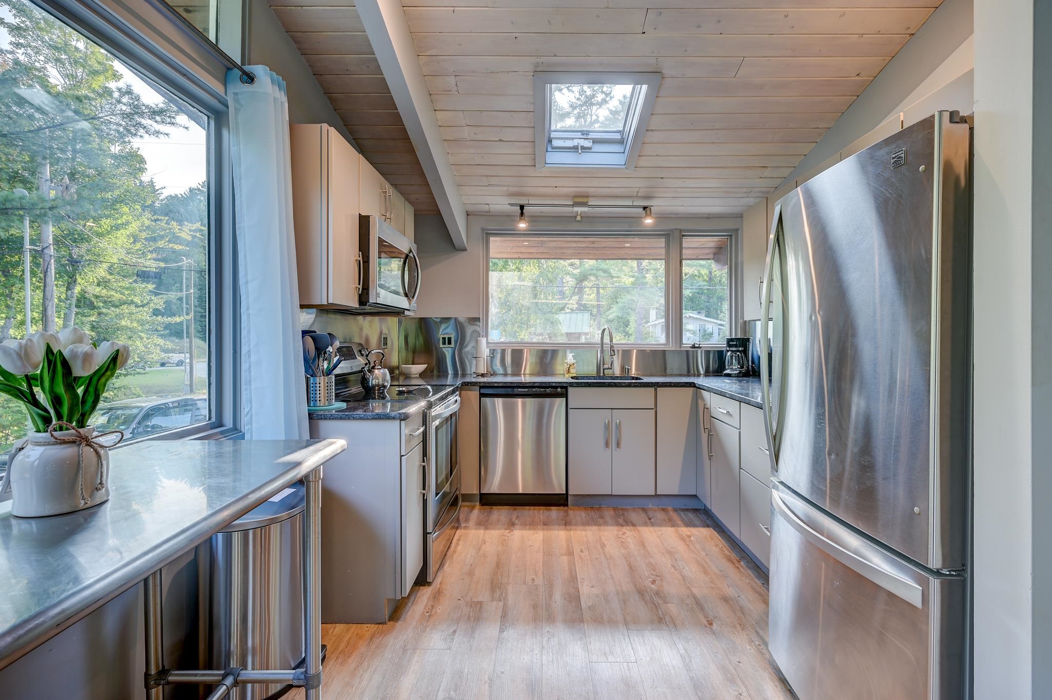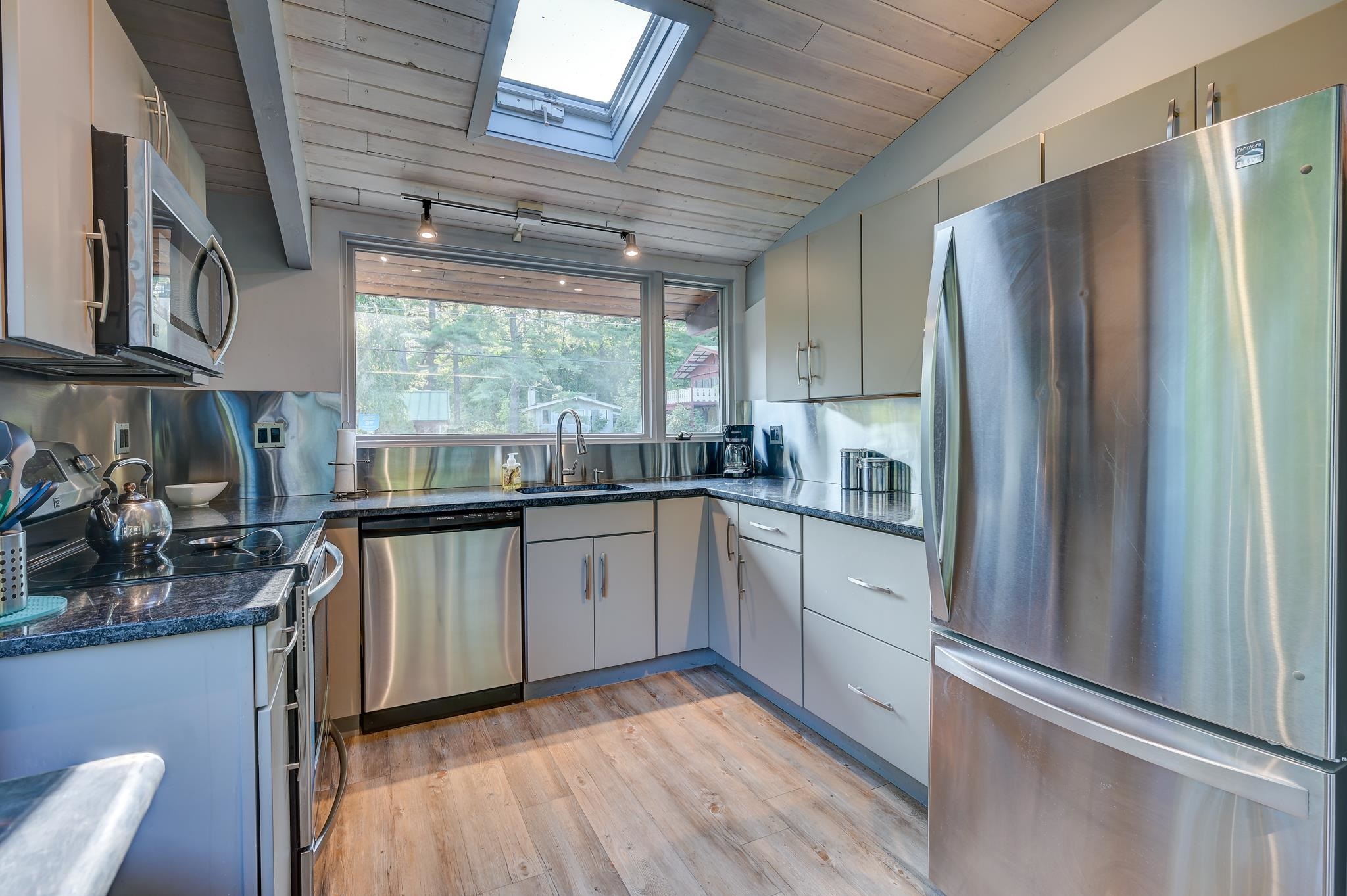 If you've been looking for your Cranmore Mountain home base, you've found it! This charming contemporary is set in one of North Conway's most enviable locations, 749 steps (seriously!) from the chairlift line at Cranmore! Designed as the dream vacation getaway, this home has two stories, each designed to function as a separate unit, with 4 total bedrooms, plenty of space for guests. On the main upper level, you'll find a bright and open living space with cathedral ceilings, plenty of oversized windows that pour in natural light, a cozy wood-burning fireplace tucked into a floor-to-ceiling brick surround, a full kitchen equipped with granite countertops, stainless steel appliances, and ample cabinet space. Sliders lead out to a freshly painted deck. There are two nice-sized bedrooms upstairs, both kept airy and bright by tall ceilings. A full bathroom with stacked laundry is in the hall. Downstairs, you'll find a similar layout with a second wood-burning fireplace in the cozy living area, a kitchen with an electric range, dishwasher, and mini-fridge, plus two additional bedrooms. The backyard has plenty of level space for games, and a large storage shed for your off-season toys. Enjoy year-round recreation at the mountain, including the paved 2.9 mile MWV Rec Path. Come and enjoy North Conway's fastest-growing area at a fraction of the price of the new construction homes that surround it!