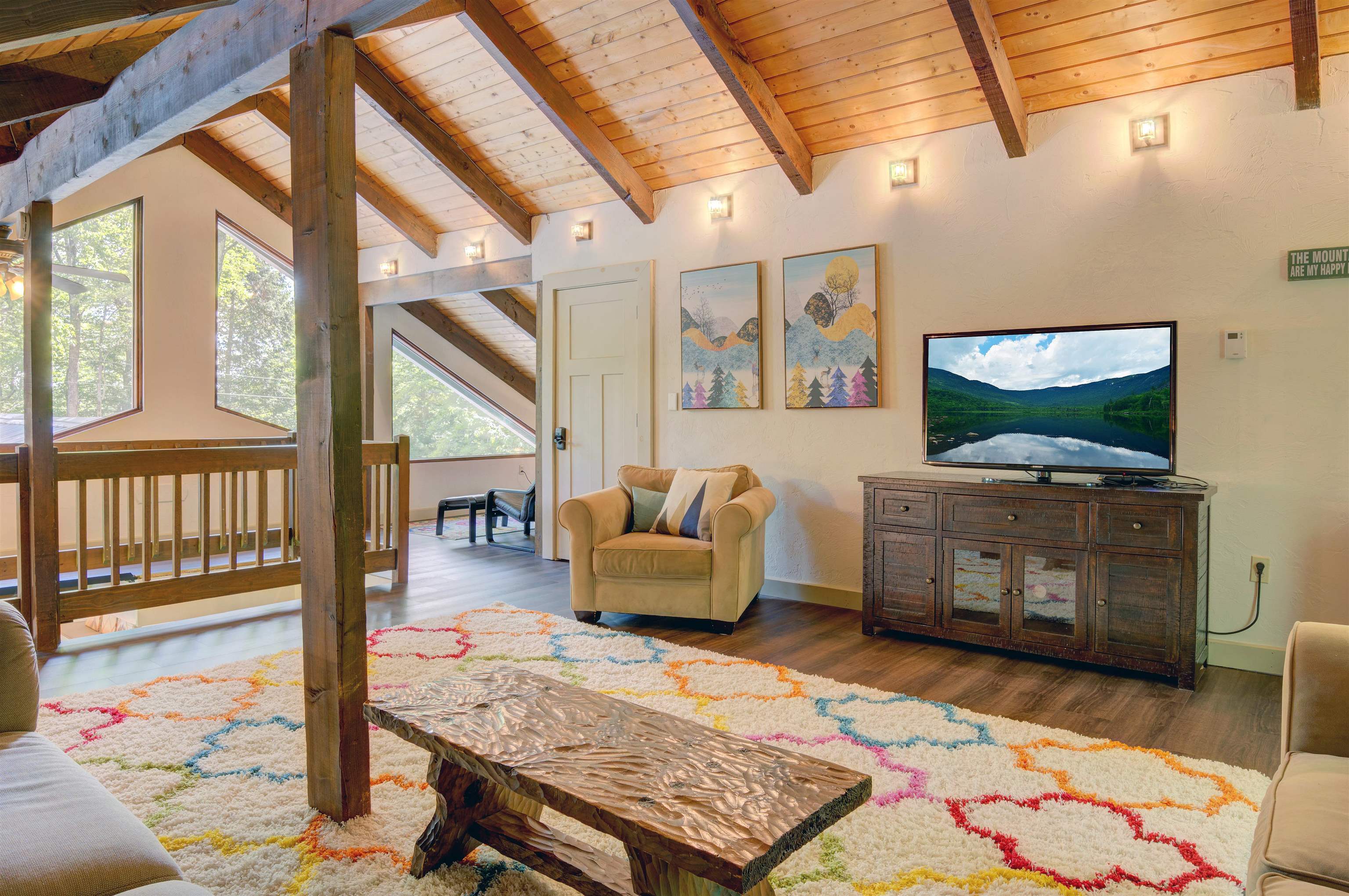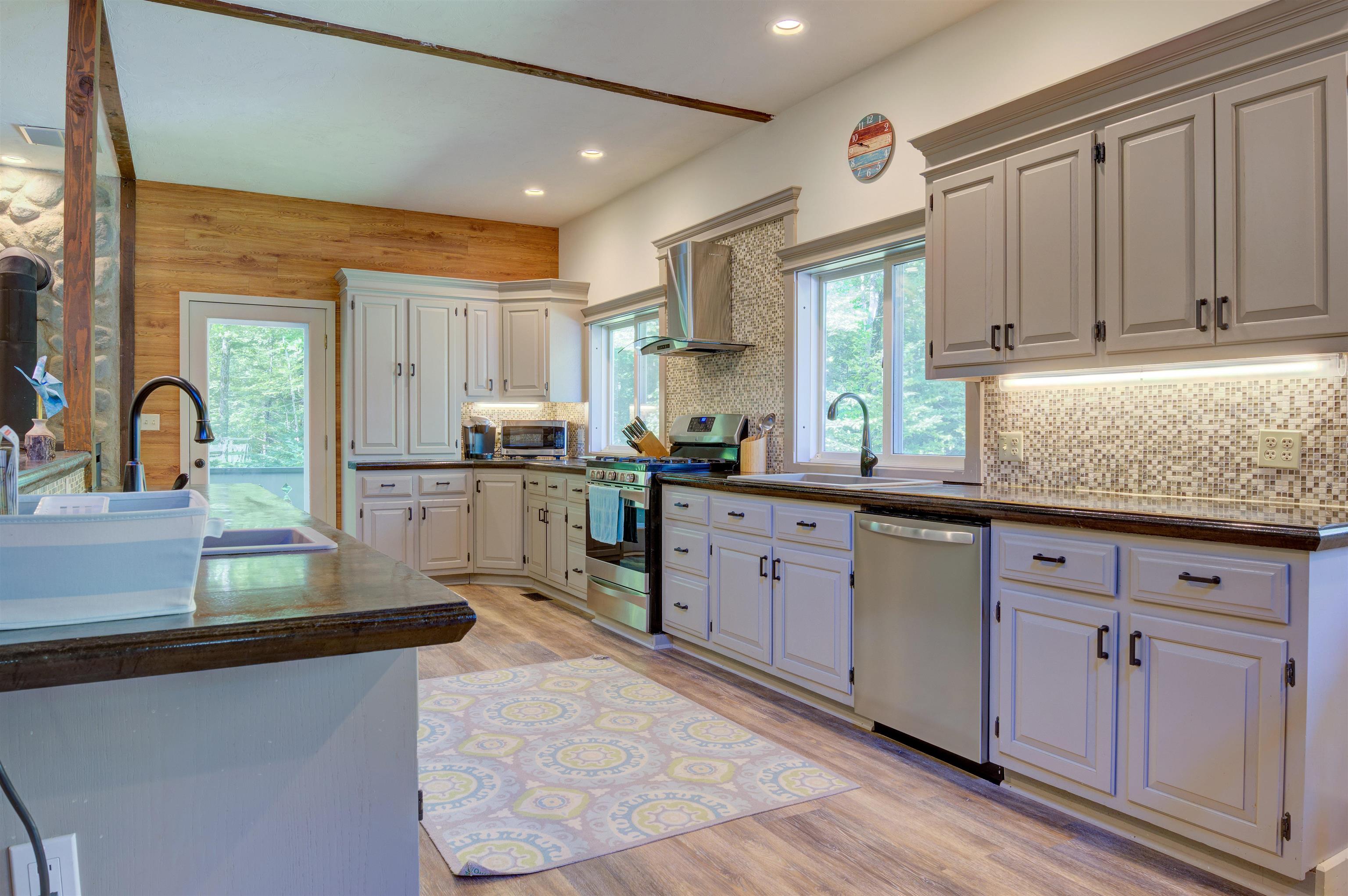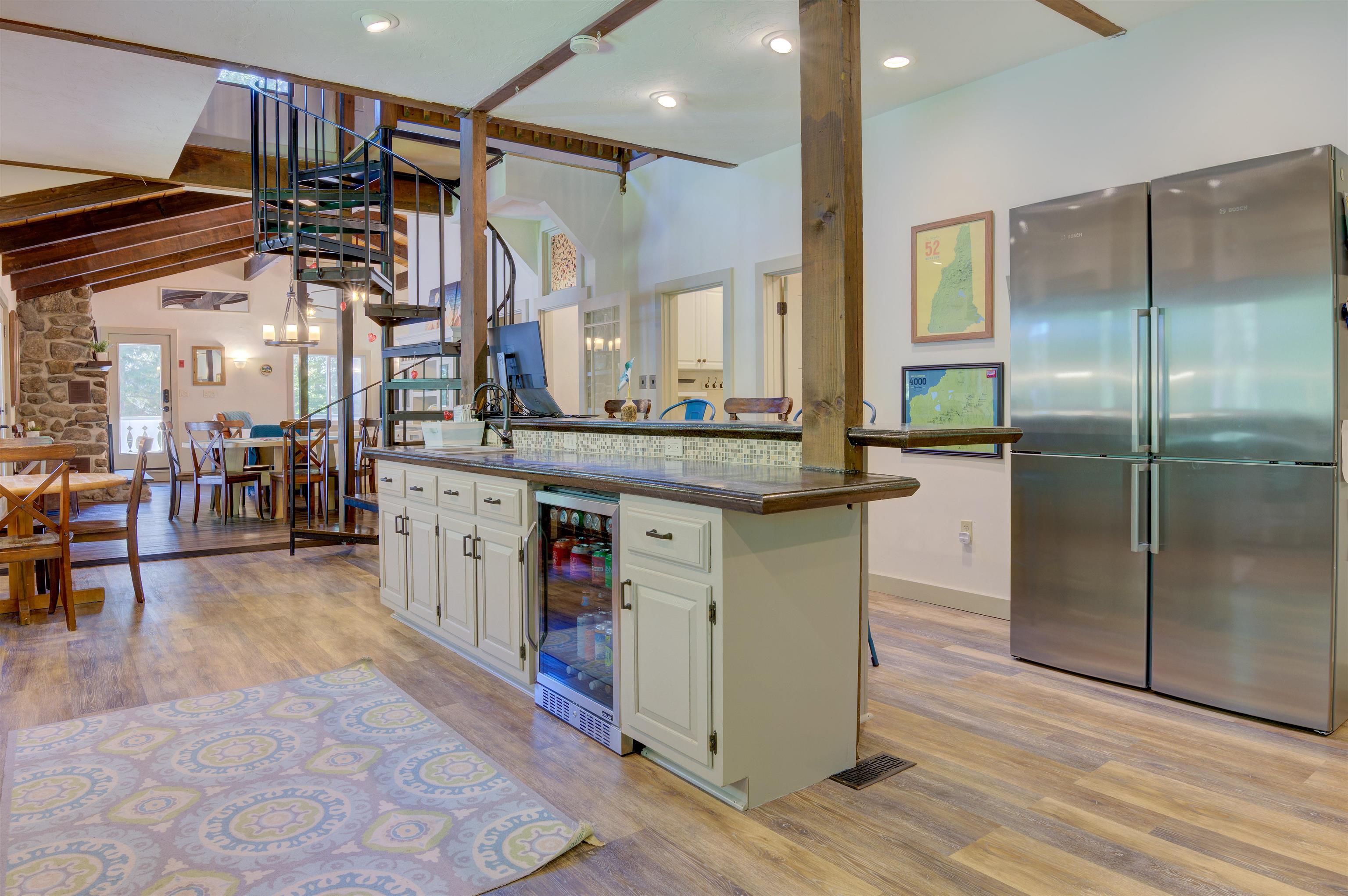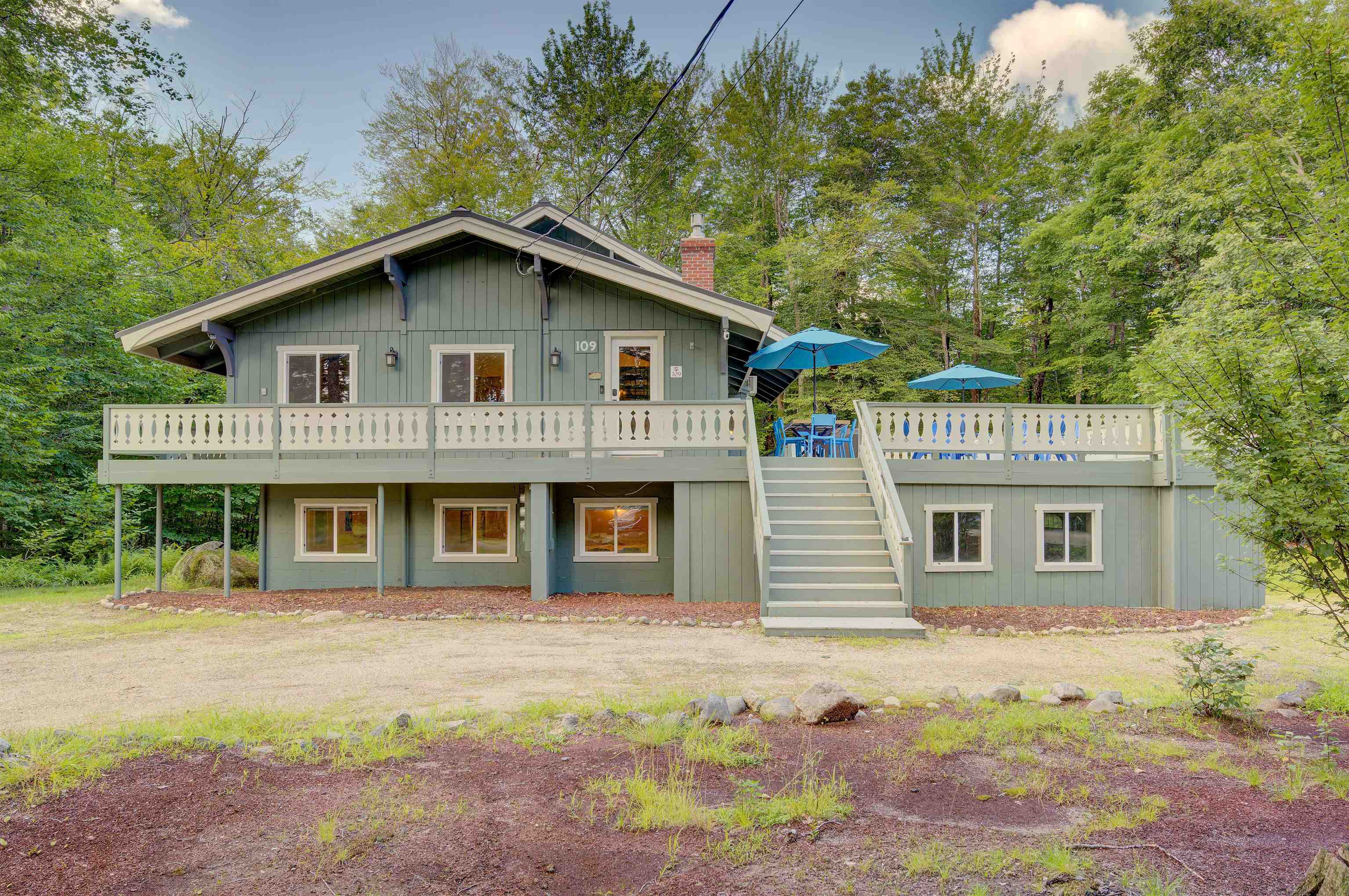 This oversized Eidelweiss Chalet has it all! Enjoy year-round quintessential NH living steps to sandy Thusis Beach on the peaceful shores of Big Pea Porridge Pond where in summer you can swim, fish, and boat (with storage on the beach racks), and in winter you can cross country ski, snowshoe, and ice fish. This house is beautifully updated and includes numerous bedrooms for all your family and friends! The main floor features a spacious living room with gas fireplace, open dining room, expansive modern kitchen, bedrooms, bathrooms, laundry, and a 700 square foot deck for outdoor entertaining. Upstairs is a large family room with gas fireplace that feels both connected to the main level and private. Downstairs has extensive room for guests with plenty of privacy. One half includes a mudroom, bedrooms, and bathroom. The other half is an apartment/in-law suite with bedrooms, living/game room, kitchen, and bathroom. The apartment has separate entrances from both the backyard and garage allowing it to be incorporated into the main home or rented as a separate space. Complemented by a two-car garage and large flat yard with firepit, this home truly offers more than most every other home in this wonderful neighborhood. Get to know your new neighbors at the numerous Eidelweiss community events, including cookouts and concerts on the beach, ice cream socials, and fall foliage walks. Enjoy this incredible house and all the activities the nearby White Mountains have to offer!