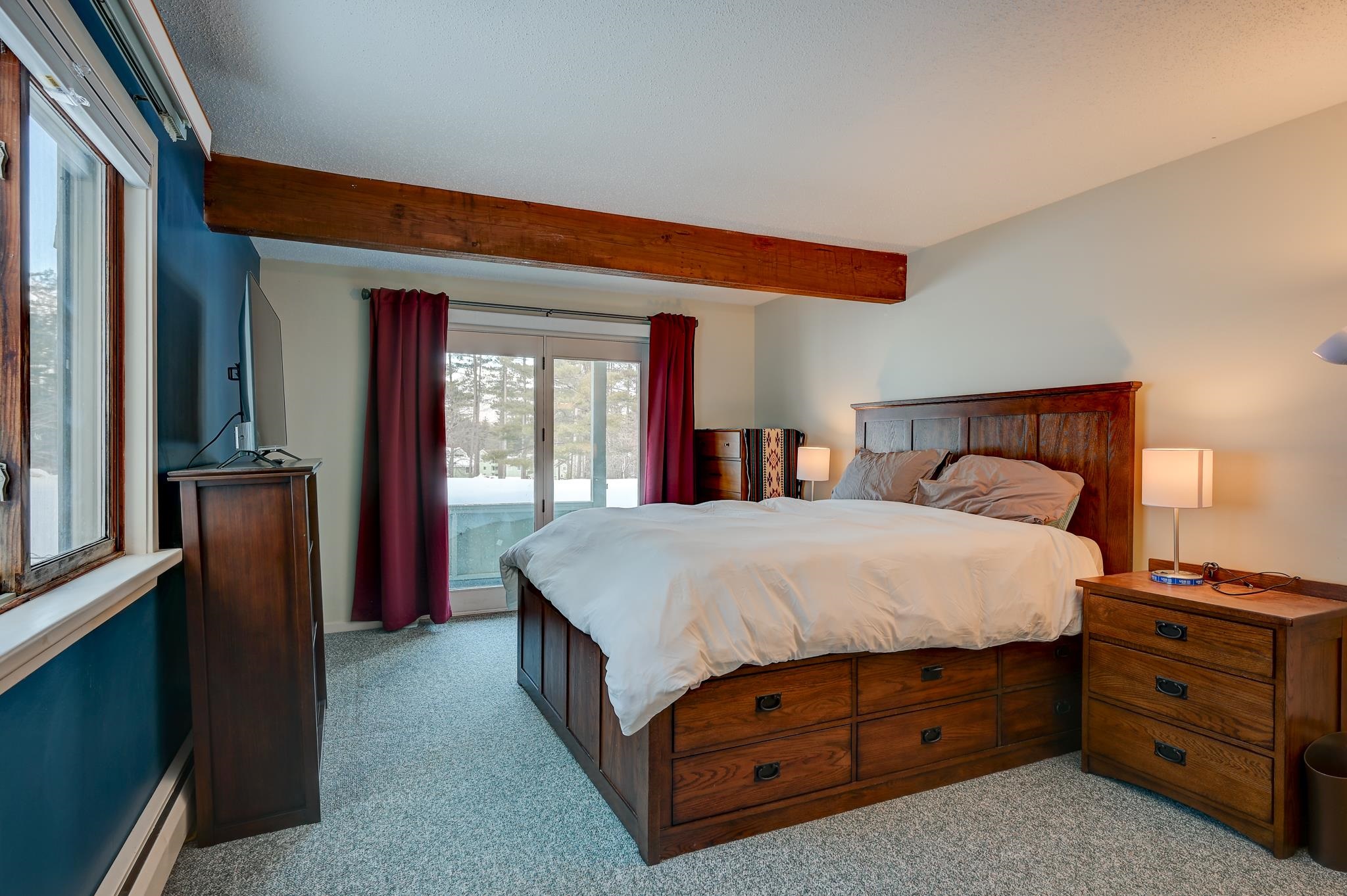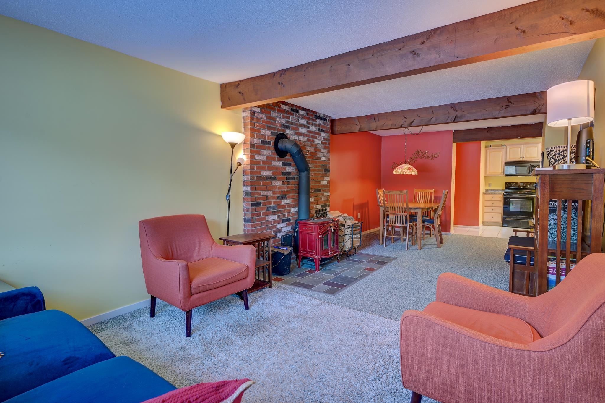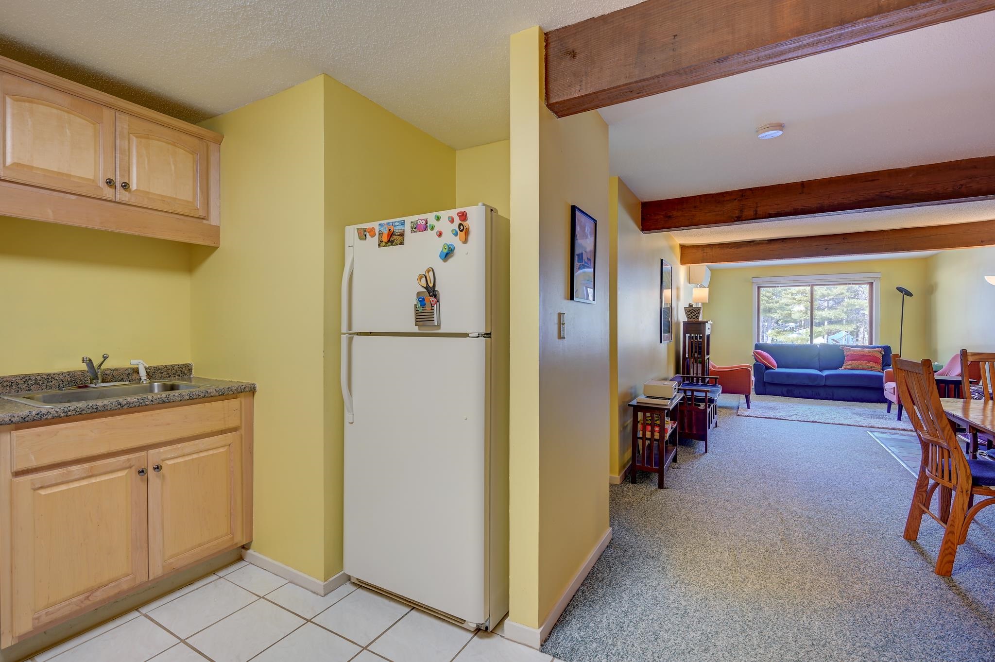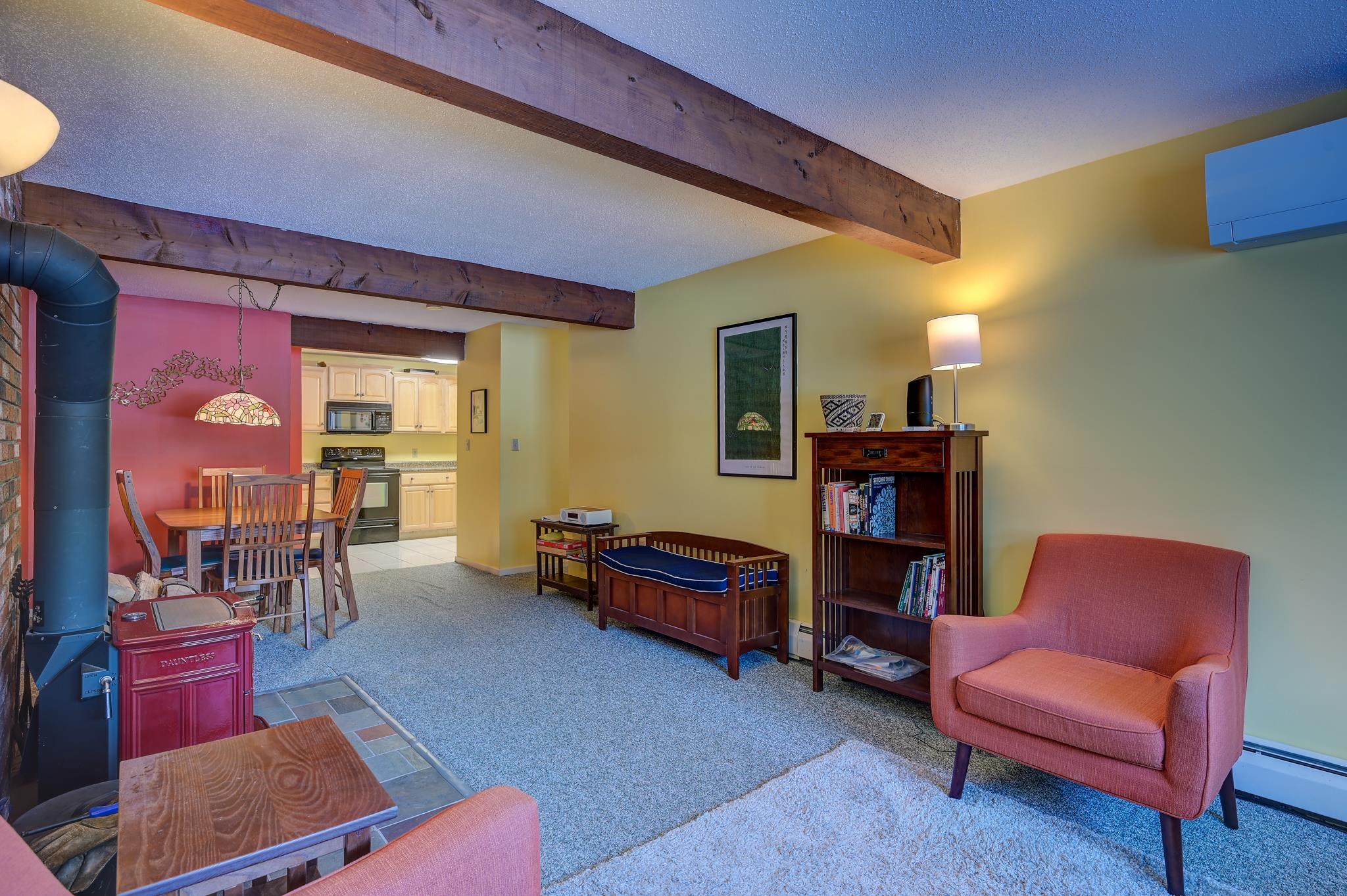 Nestled in one of the most private buildings at The Seasons at Attitash and just steps from the breathtaking White Mountain National Forest, this garden-level unit offers the perfect mountain escape. The unit is sold fully furnished and boasts a fully updated kitchen with modern cabinets, stylish countertops, and sleek tile flooring. In the open-concept dining and living area, a cozy Vermont Castings red-enameled wood stove sets a warm, inviting atmosphere, while cellular energy-saving shades in the windows enhance both comfort and energy efficiency. A standout feature of this home is the private back porch entrance, designed for unmatched convenience when bringing in groceries, firewood, or outdoor gear. This entrance also provides direct access to the front lawn, making grilling and outdoor activities a breeze. Additional conveniences include a high-efficiency heat pump that provides both air conditioning and heating, and a private secure storage area in the basement to accommodate your extra belongings. Residents also enjoy year-round amenities at The Seasons, such as an indoor pool, fitness center, hot tub, sauna, and more. Plus, internet and cable are included in the HOA, and owners interested in renting their units when they're not in use may take advantage of the on-site rental program. Conveniently located just one mile from Attitash Mountain and a short drive from all the best Mt Washington Valley has to offer, this property truly offers a refined mountain lifestyle.