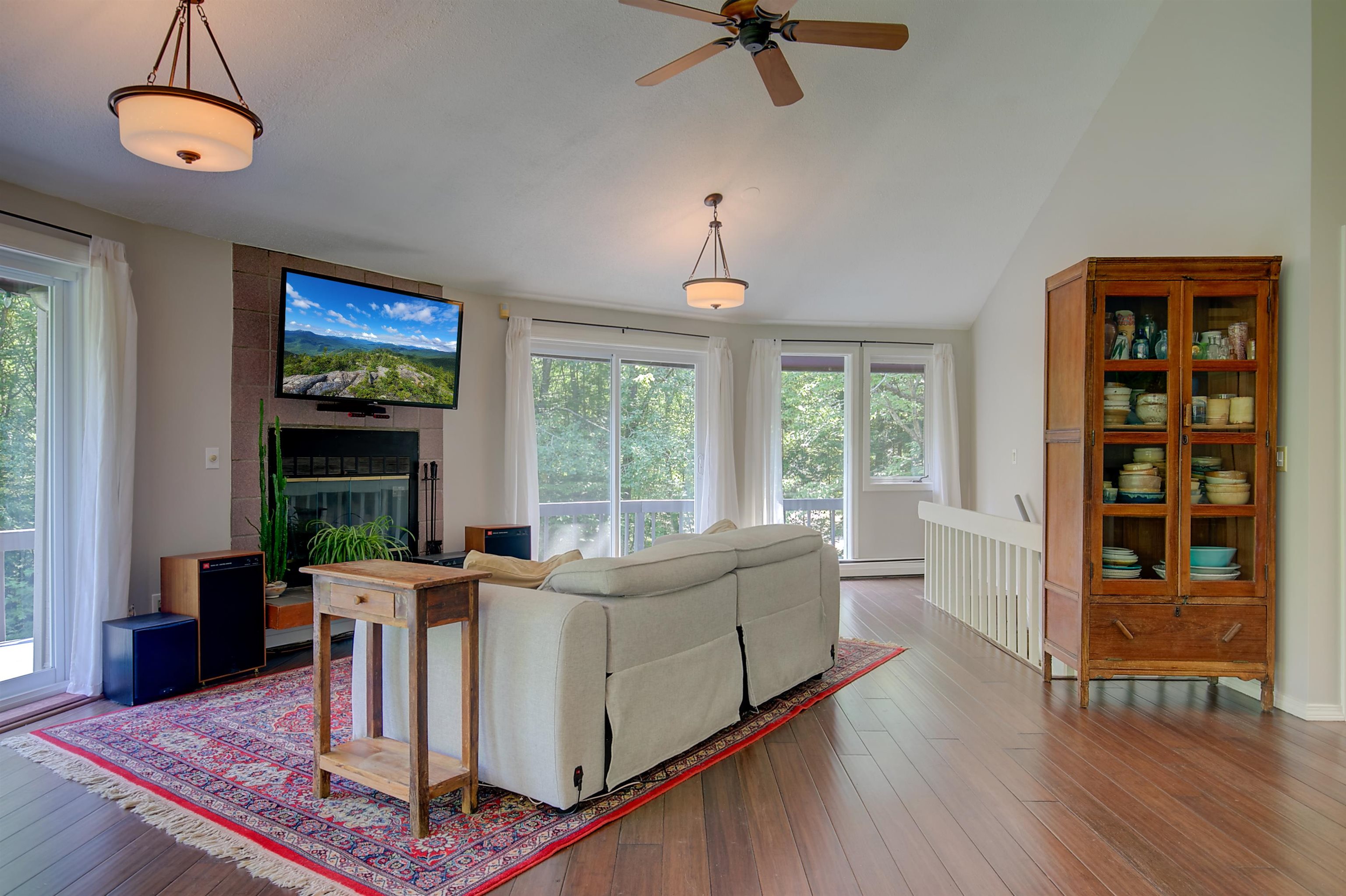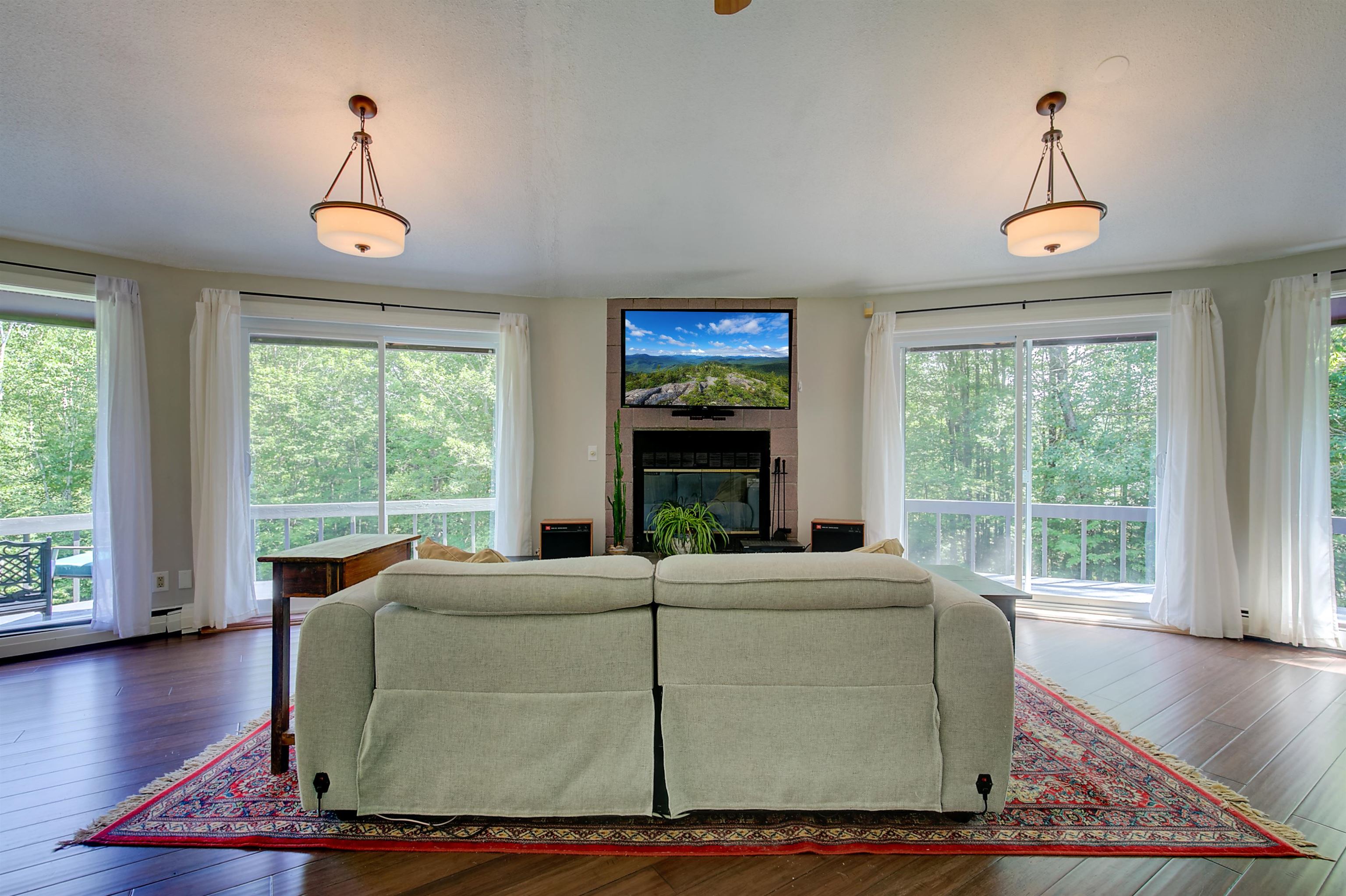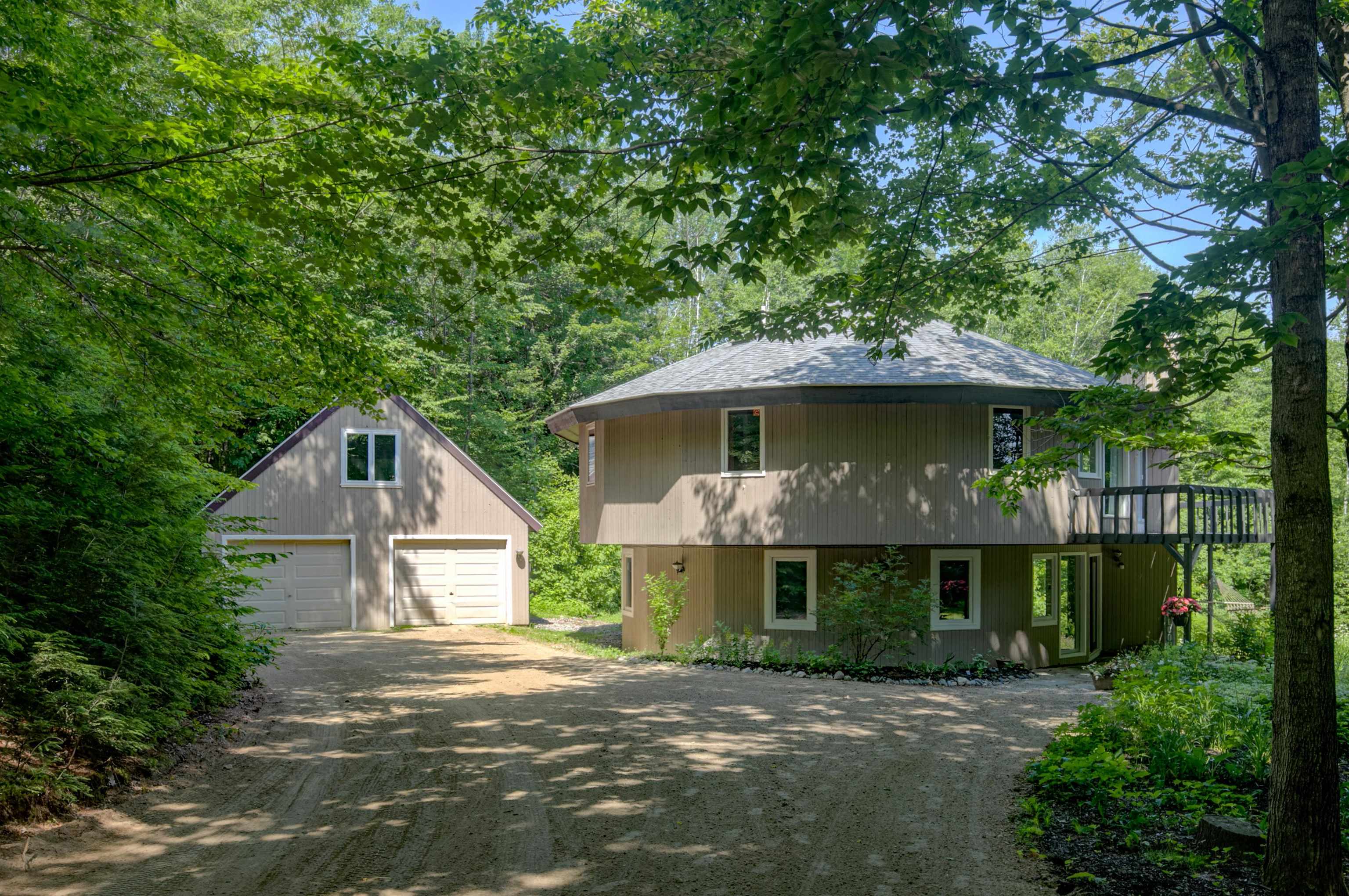 One-of-a-kind 4-bedroom, 3-bath home with lake rights, set on a private wooded lot in the sought-after Rockhouse Mountain community. This architecturally distinct, round 16-sided home has been lovingly maintained by the same family for nearly 30 years and features thoughtful updates throughout. Recent upgrades include wood floors and roofs on the house and garage. The open-concept interior features vaulted ceilings, abundant natural light, and a unique circular layout that creates a warm, flowing living space. Step outside to a 90-foot wraparound deck with seasonal mountain views--perfect for outdoor dining or relaxing in nature. The 2-car garage offers ample storage, and the unfinished second-story space presents an opportunity for future expansion. Additional highlights include a grassy yard, a fire pit, and simple, natural landscaping that blends with the wooded surroundings. Furthermore, there is an additional 1/2 acre lot of record that could also be available for purchase to protect your privacy or enhance your view. Enjoy access to a nearby lake, plus close proximity to North Conway's restaurants, shops, skiing, hiking trails, and the Saco River. This is a rare chance to own a truly distinctive home in the heart of the Mount Washington Valley--ideal as a primary residence, vacation home, or investment property.