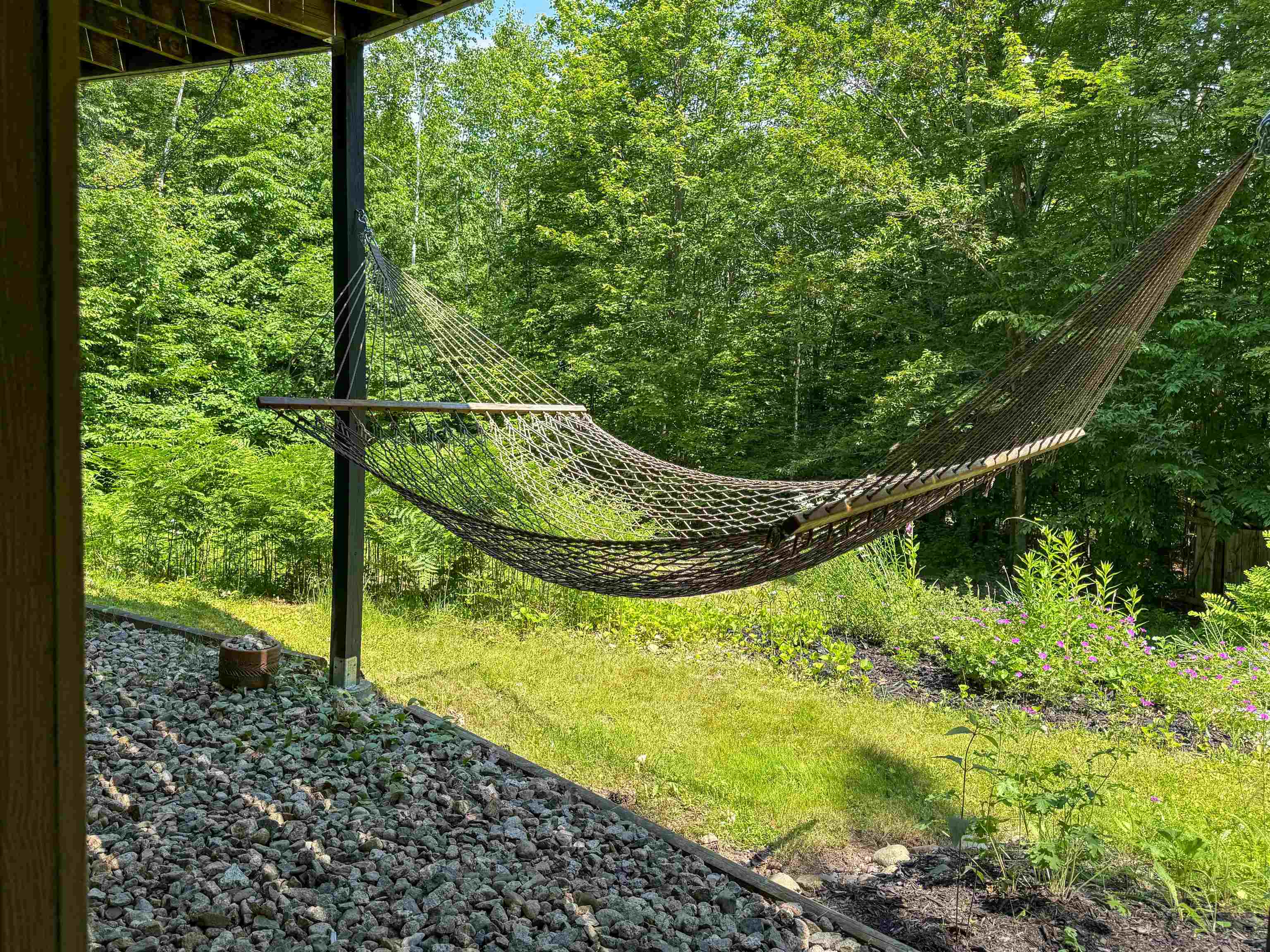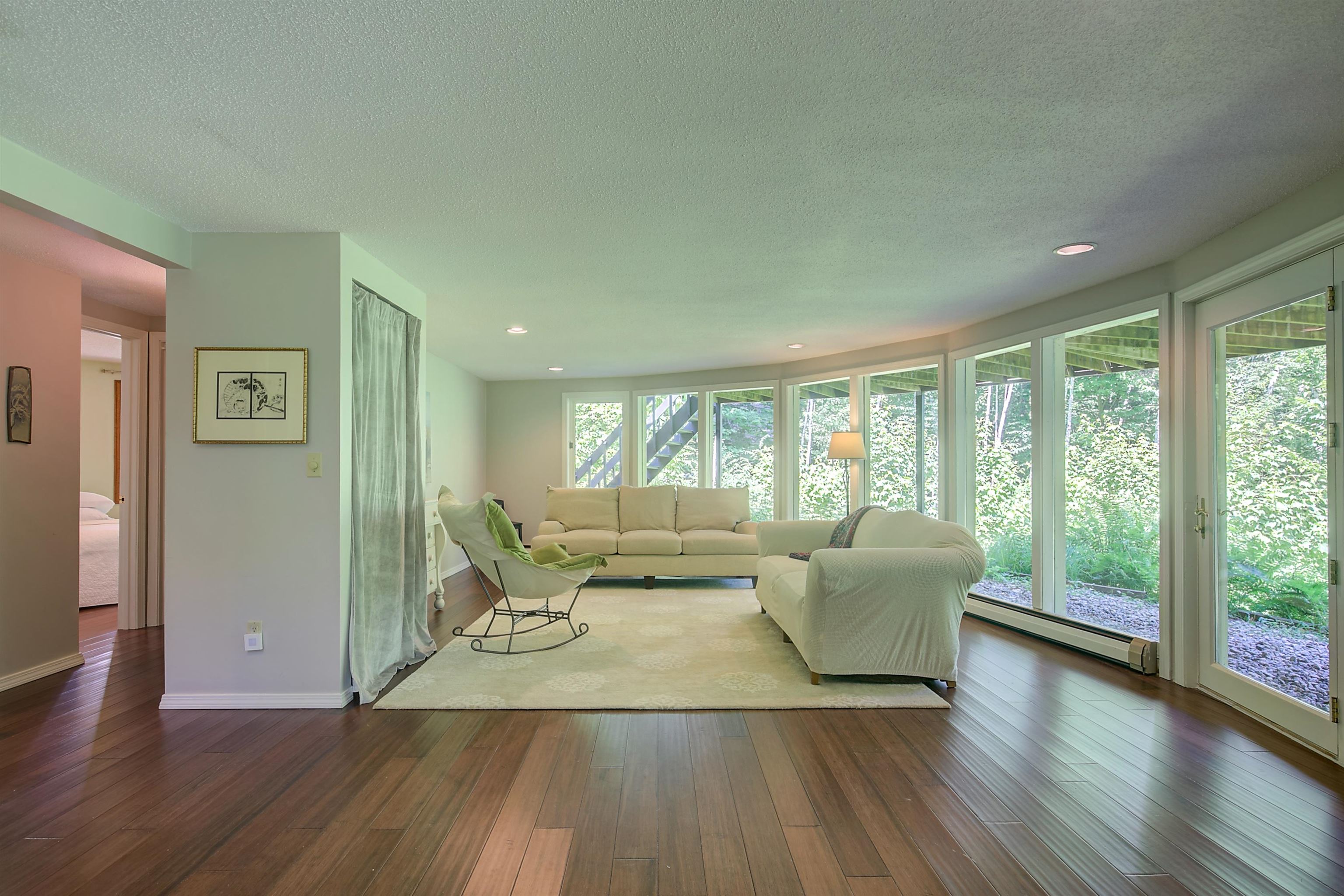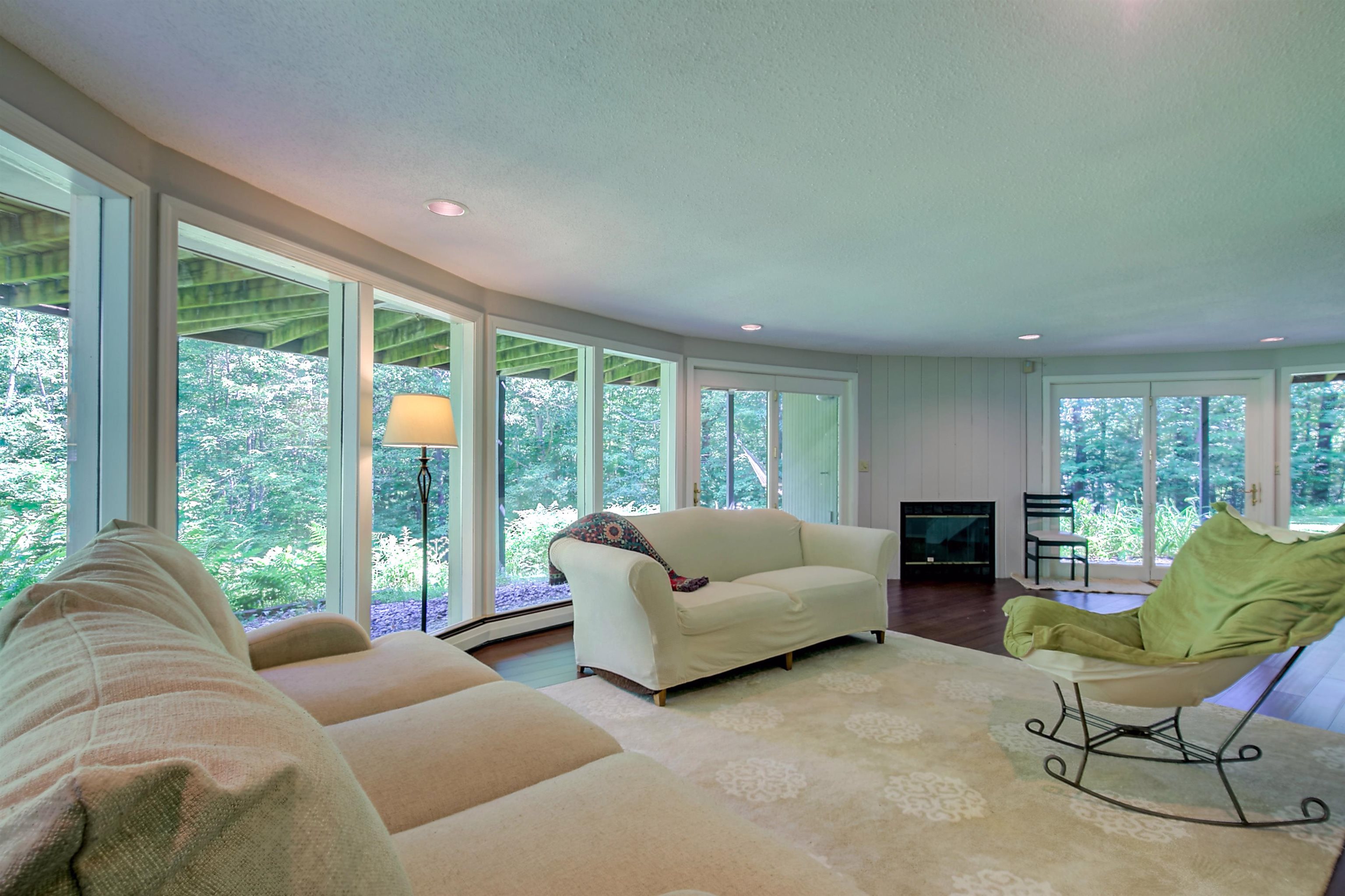 One-of-a-kind 4-bedroom, 3-bath home with lake rights, set on a private wooded lot in the sought-after Rockhouse Mountain community. This architecturally distinct, round 16-sided home has been lovingly maintained by the same family for nearly 30 years and features thoughtful updates throughout. Recent upgrades include wood floors and roofs on the house and garage. The open-concept interior features vaulted ceilings, abundant natural light, and a unique circular layout that creates a warm, flowing living space. Step outside to a 90-foot wraparound deck with seasonal mountain views--perfect for outdoor dining or relaxing in nature. The 2-car garage offers ample storage, and the unfinished second-story space presents an opportunity for future expansion. Additional highlights include a grassy yard, a fire pit, and simple, natural landscaping that blends with the wooded surroundings. Furthermore, there is an additional 1/2 acre lot of record that could also be available for purchase to protect your privacy or enhance your view. Enjoy access to a nearby lake, plus close proximity to North Conway's restaurants, shops, skiing, hiking trails, and the Saco River. This is a rare chance to own a truly distinctive home in the heart of the Mount Washington Valley--ideal as a primary residence, vacation home, or investment property.
