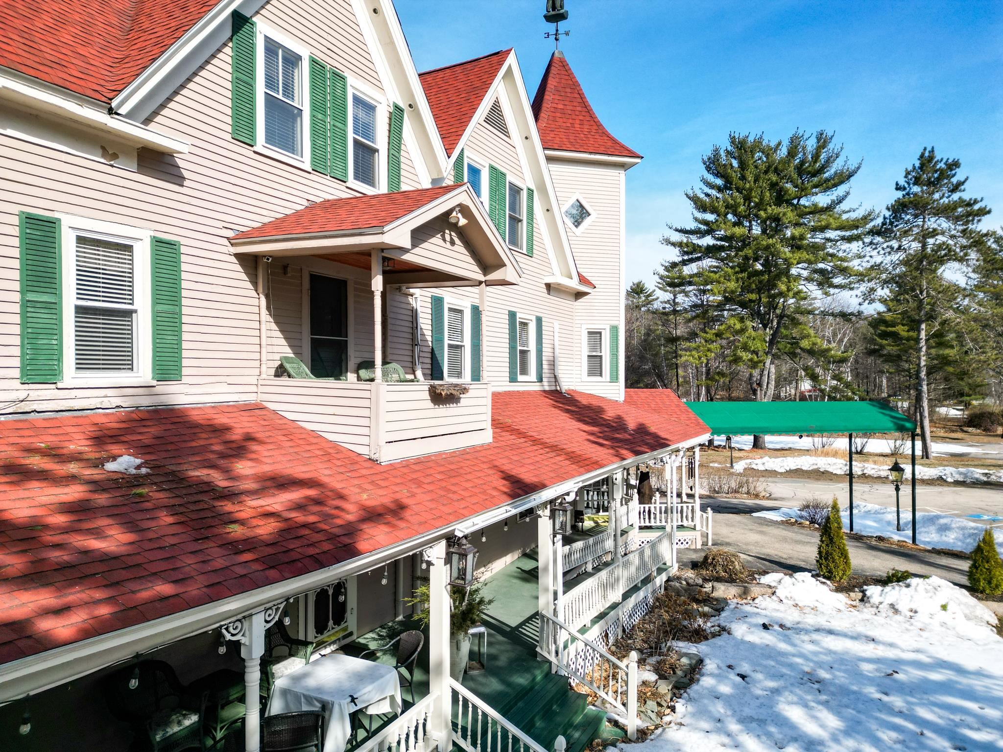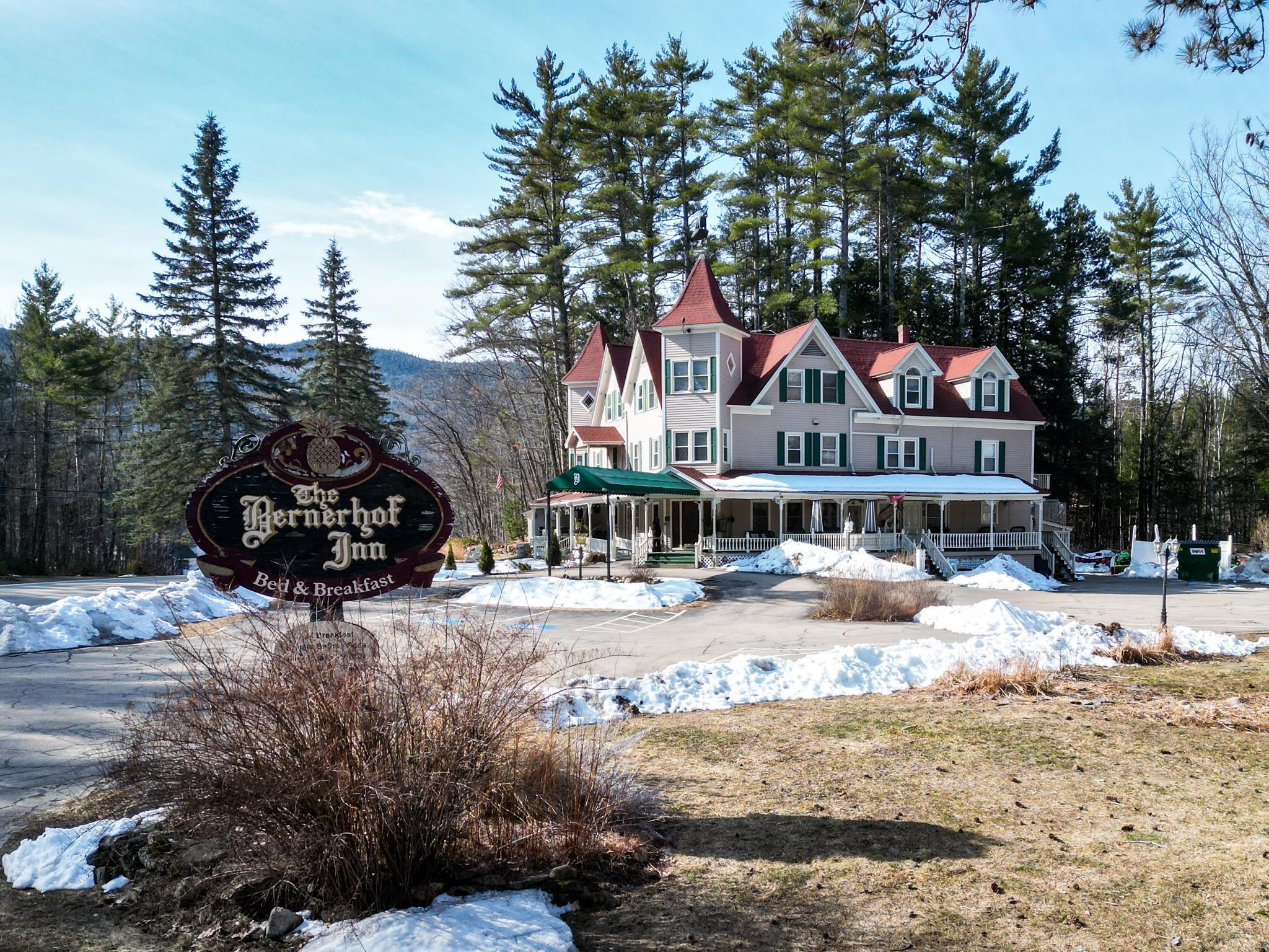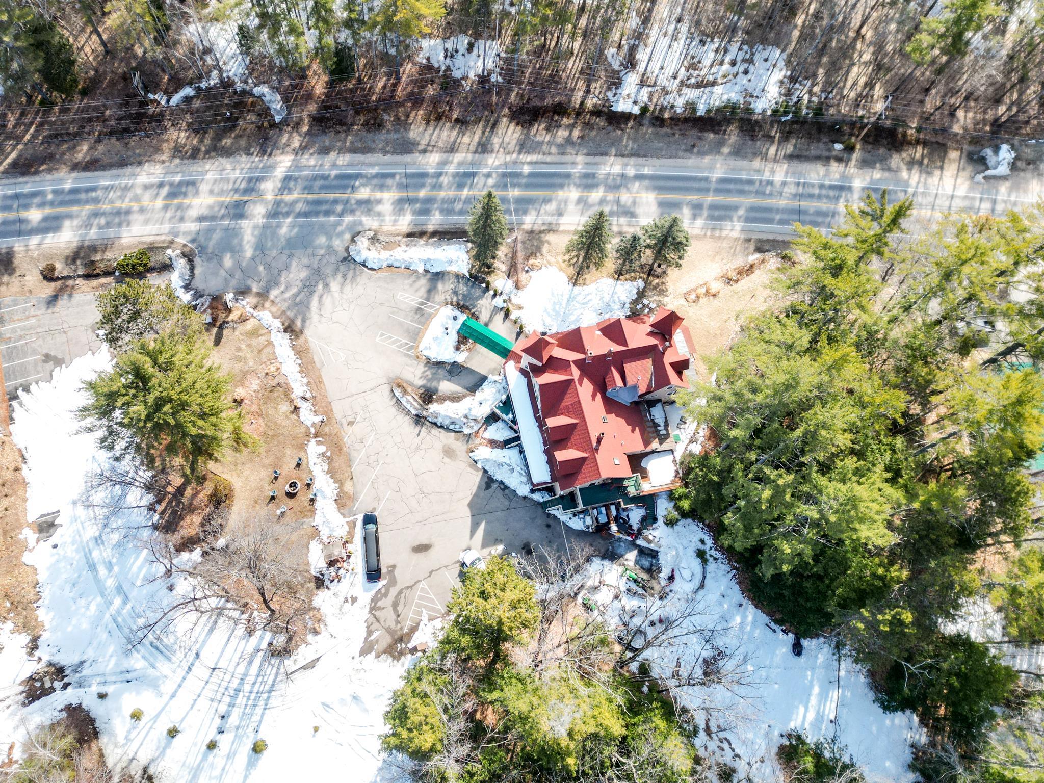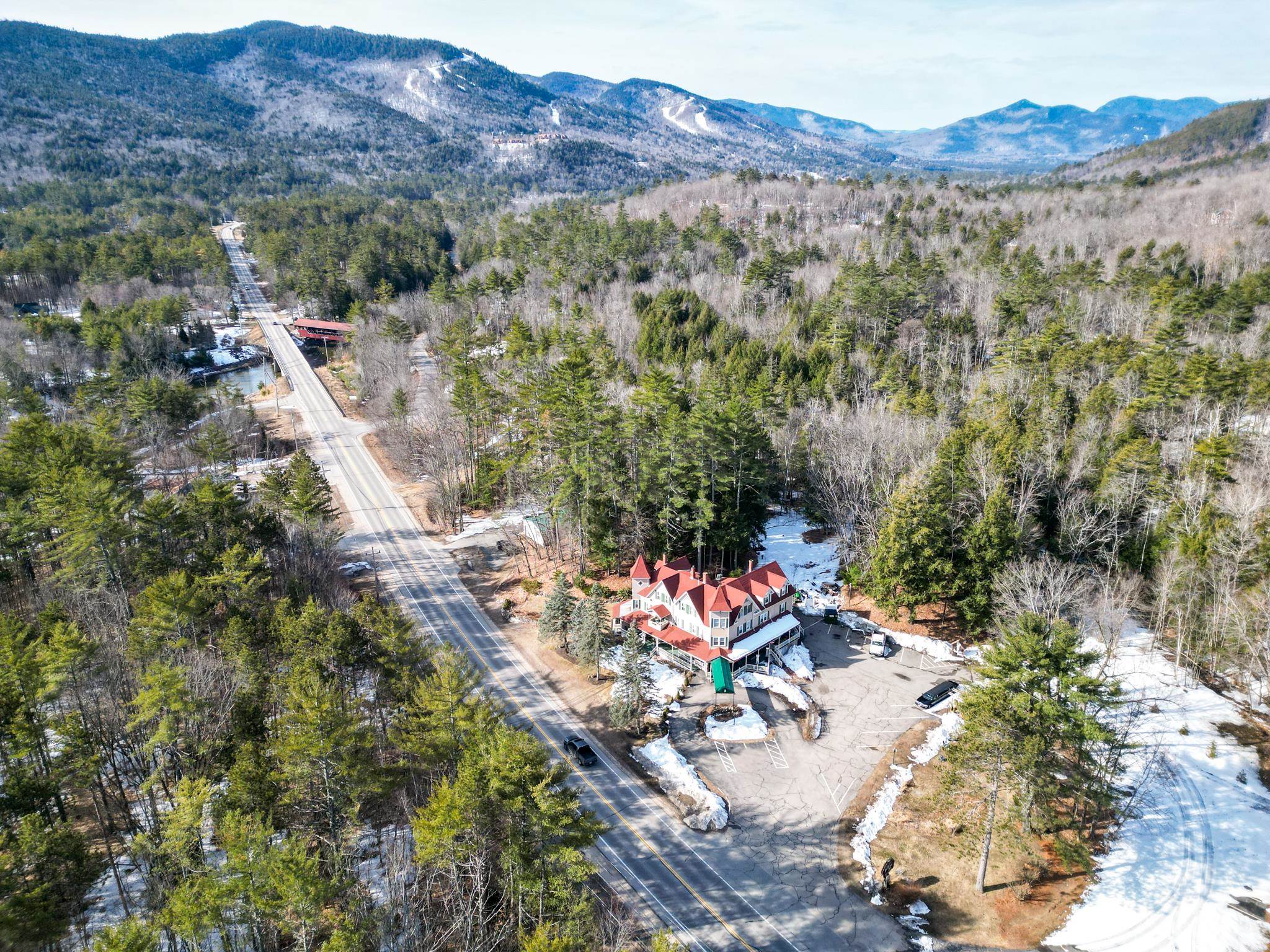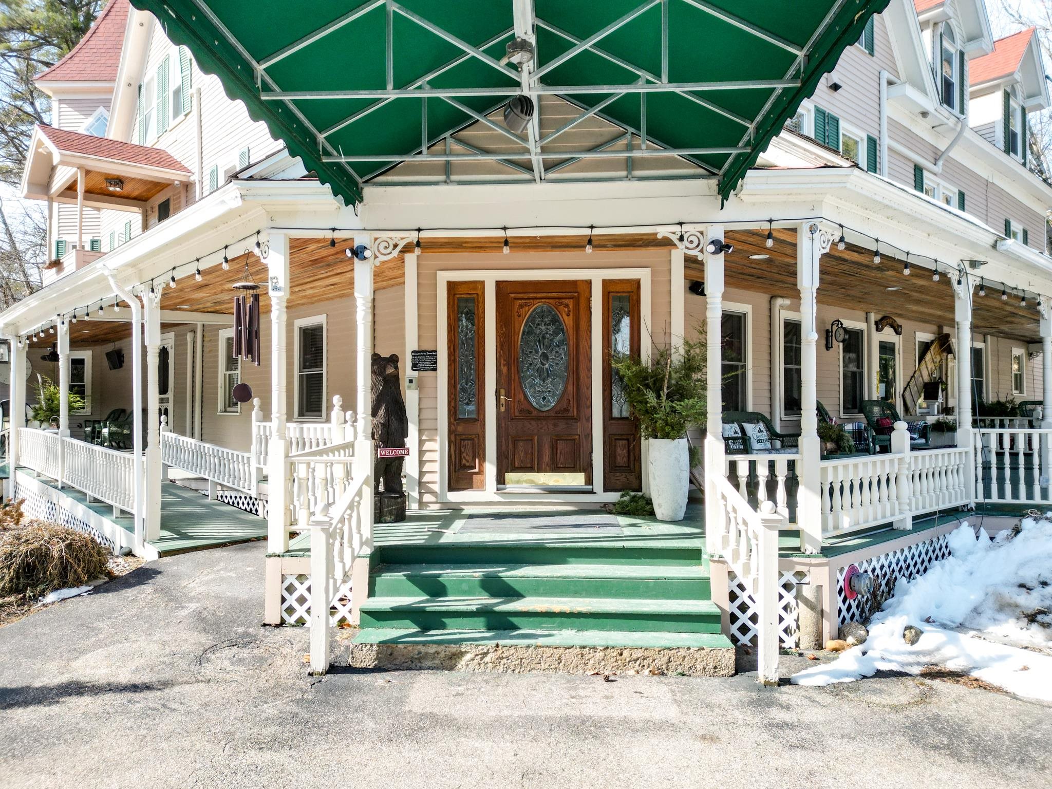 Prominent 2.5-story Victorian-era commercial property situated on 8.3 acres with exceptional frontage along US Route 302 in the heart of the Mount Washington Valley. Originally constructed in 1900, this 8,600 SF building underwent a comprehensive renovation in 2015 and features 12 bedrooms, 14.5 bathrooms, a two-bedroom owner's apartment, and a full basement totaling 2,484 SF of additional space. The building offers a gable and hip asphalt roof replaced in 2021, clapboard exterior with recent paint, hardwood and carpet flooring throughout, and drywall interior finishes. Climate control includes an oil-fired hot water heating system supplemented by 14 individually zoned mini-split HVAC units installed in 2017, providing 100% central air conditioning. The entire 7,933 SF living area is protected by a fire sprinkler system, and the property includes a fully equipped commercial kitchen walk-in with cold storage facility and a gas fireplace. Recent capital improvements include new mattresses (2022), updated smart TVs (2023), bathroom renovations, and fresh interior paint. A new septic system was engineered and installed in 2018 and the property is served by municipal water and features a paved driveway. The site is zoned town commercial on a level-to-rolling 8.3-acre parcel with delineated wetlands. The building includes a covered porch, outdoor grounds with gardens and walking paths, and dedicated parking. Located just 1.7 miles from Attitash Mountain Resort and Story Land, 7 miles from North Conway Village, and adjacent to the White Mountain National Forest, this property benefits from year-round tourist traffic in one of New England's premier four-season recreation corridors.