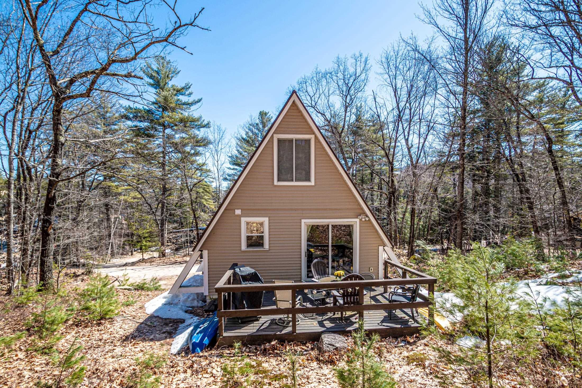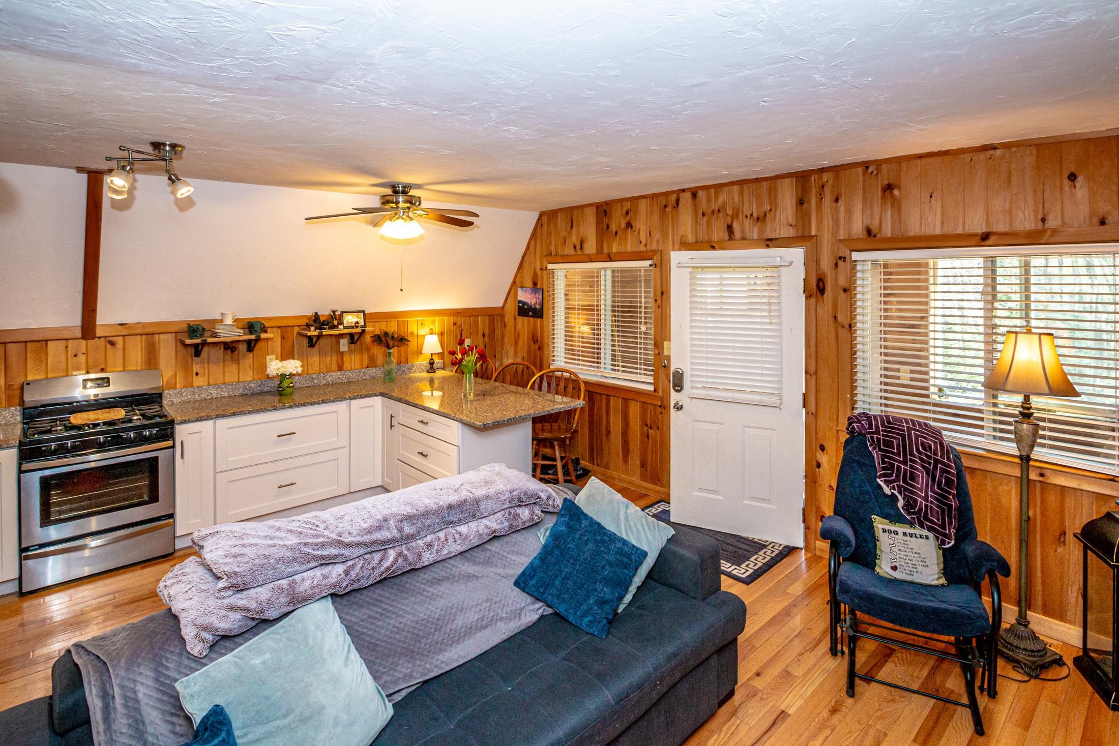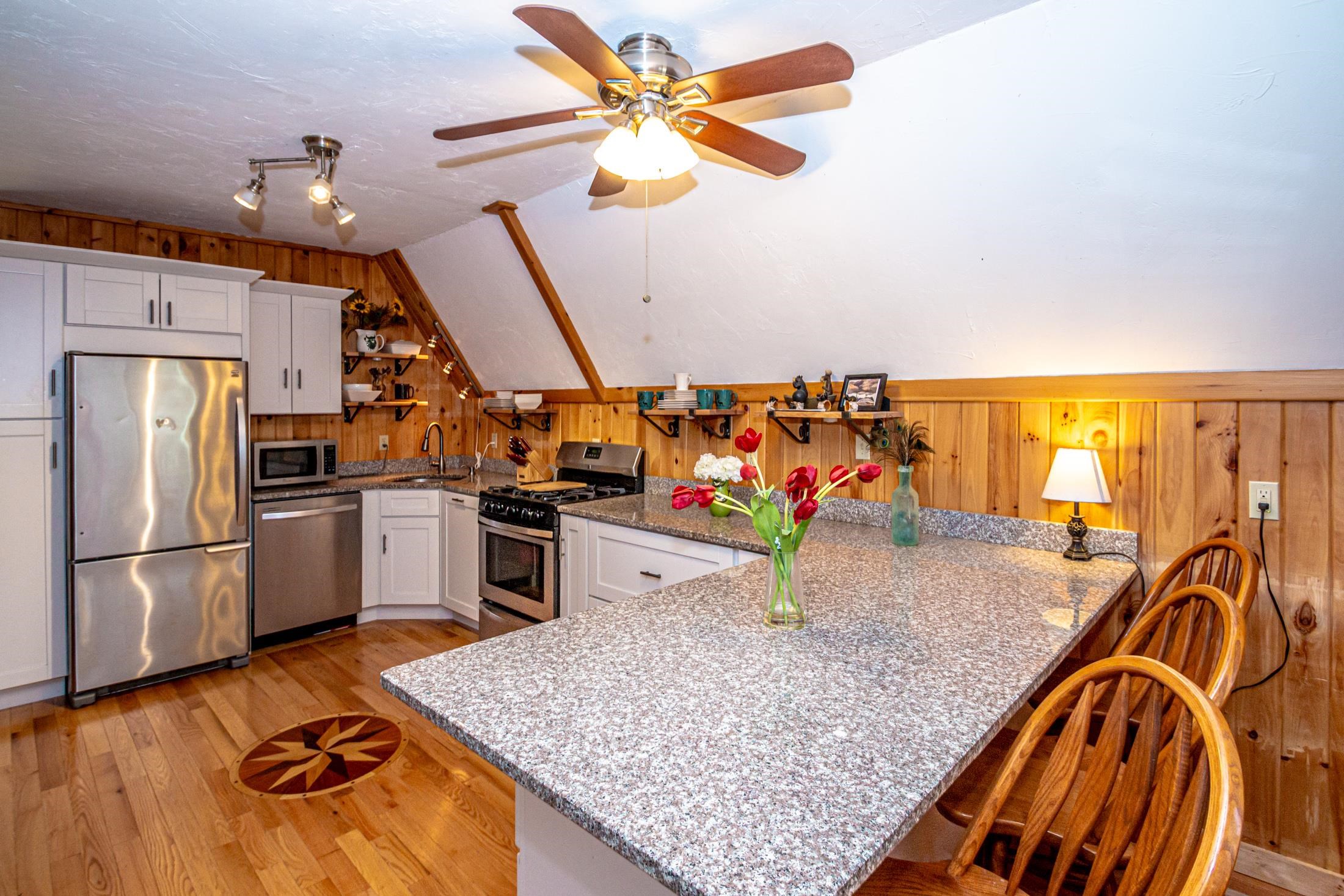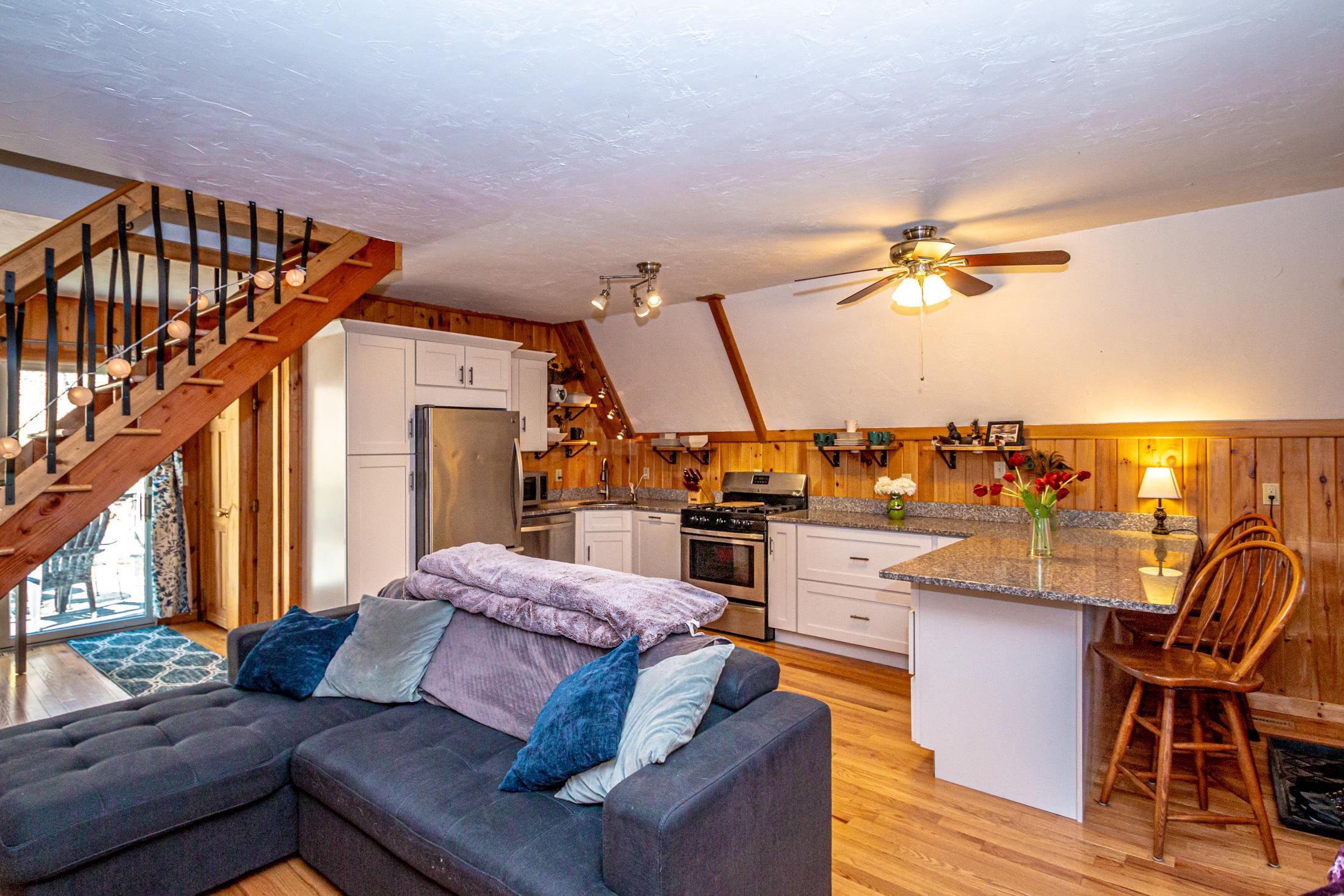 Adorable 2-bedroom house in Eidelweiss, just 1 minute walk to the shared beach on Little Pea Porridge Pond. This property has been lovingly cared for with recent updates to the kitchen and bath. The enclosed front porch can double as a mud room where you can kick off your shoes or stow your gear before entering. Inside you'll see a very efficient use of space in this cozy open concept home. There is hardwood flooring on both levels, with artistic wood inlay designs and a newly tiled bath. The well-designed kitchen has granite counters, quality cabinets and stainless appliances. The living room, full bath and den areas round out the main floor with the2 bedrooms upstairs. There are sliders out to the back deck, there is a fire pit area, plus under the front porch there is access to the basement with locked storage. This is a turnkey property being sold fully furnished down to the dishes! Location is great as you get access to the 3 ponds in Eidelweiss, along with beach and boating access to Silver Lake, close to the mountains for skiing and hiking, rivers for kayaking, plus shopping and restaurants of Mt Washington Valley.