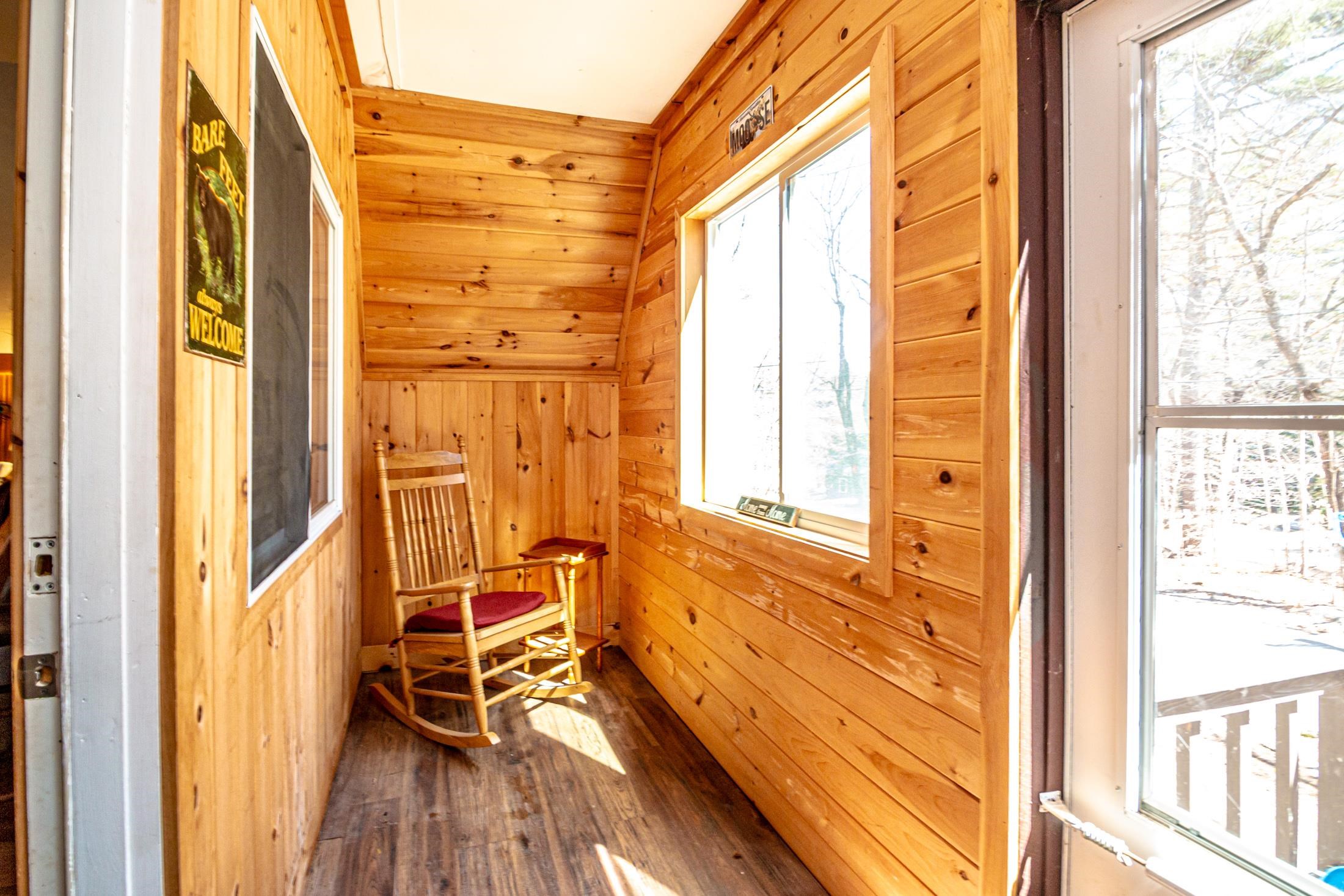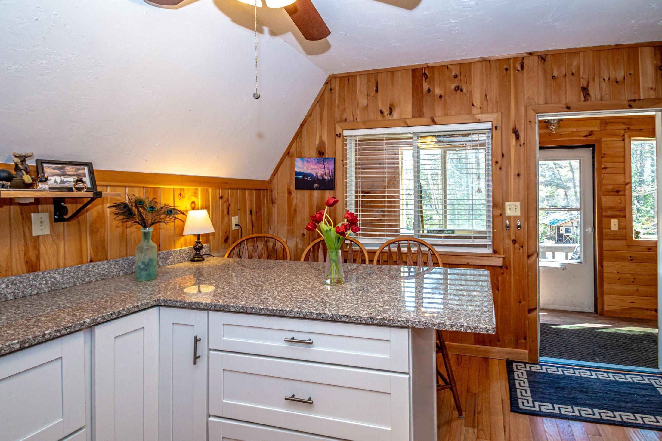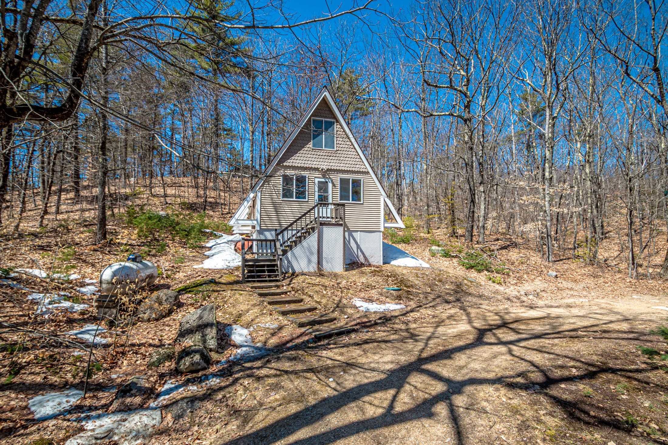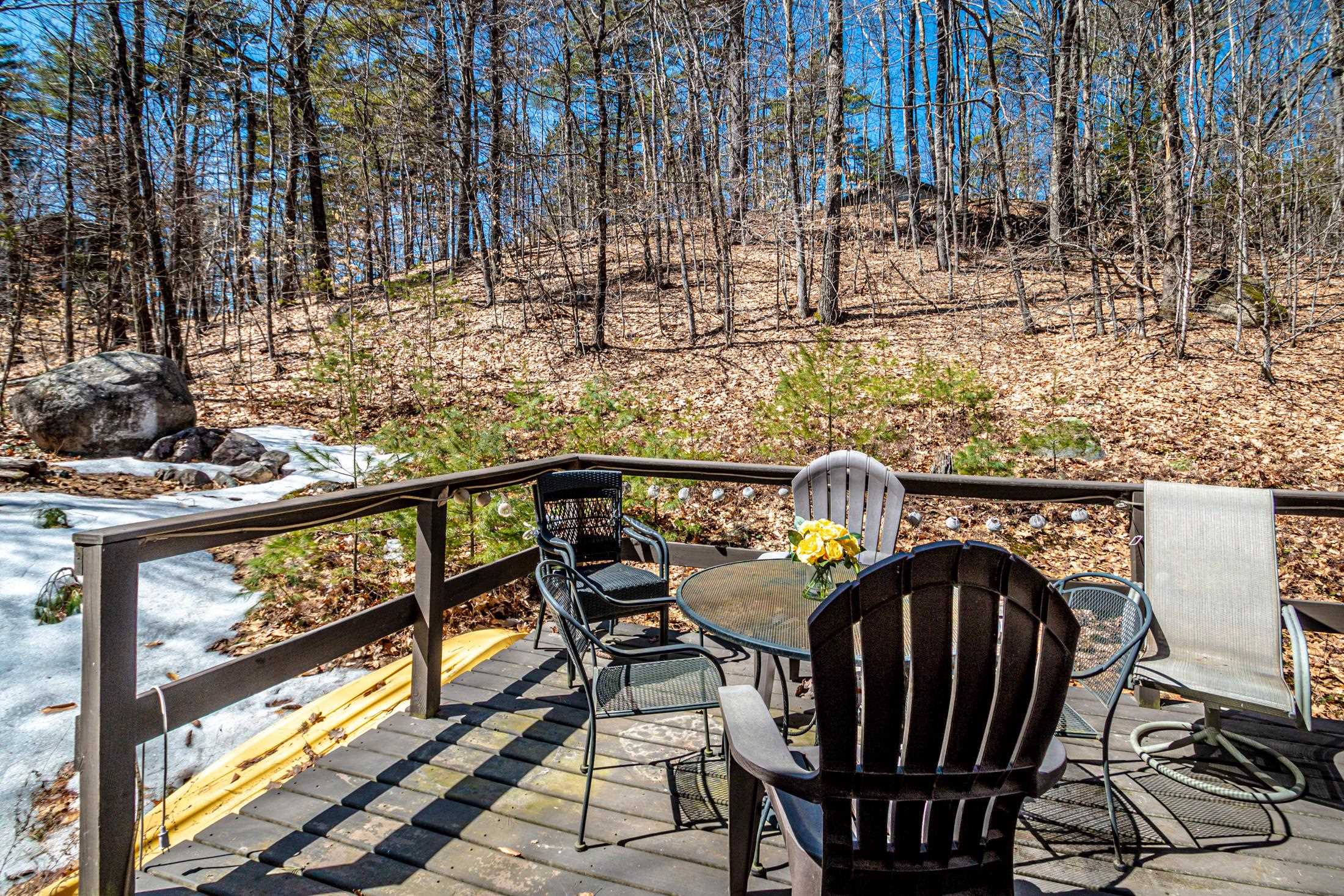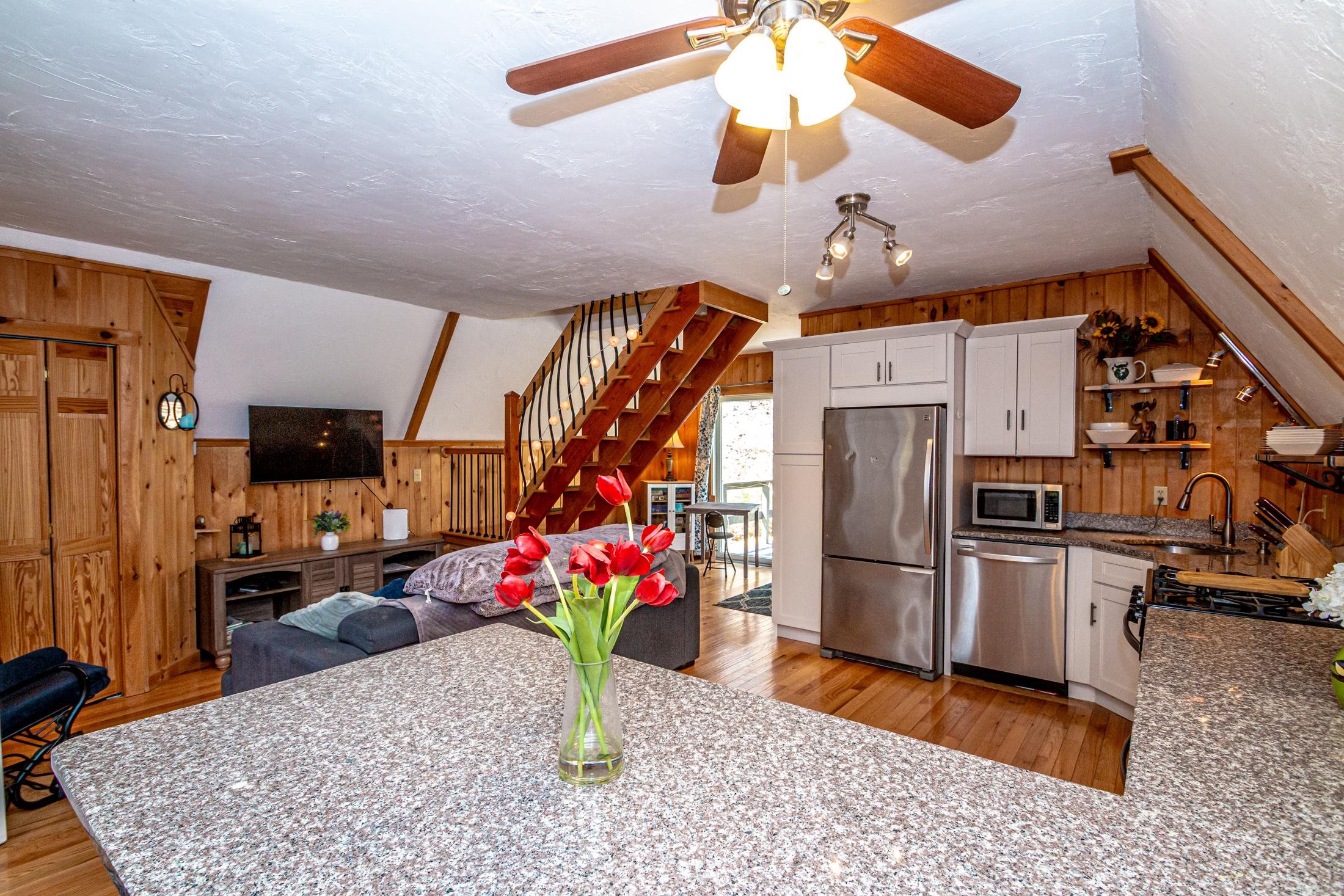 Adorable 2-bedroom house in Eidelweiss, just 1 minute walk to the shared beach on Little Pea Porridge Pond. This property has been lovingly cared for with recent updates to the kitchen and bath. The enclosed front porch can double as a mud room where you can kick off your shoes or stow your gear before entering. Inside you'll see a very efficient use of space in this cozy open concept home. There is hardwood flooring on both levels, with artistic wood inlay designs and a newly tiled bath. The well-designed kitchen has granite counters, quality cabinets and stainless appliances. The living room, full bath and den areas round out the main floor with the2 bedrooms upstairs. There are sliders out to the back deck, there is a fire pit area, plus under the front porch there is access to the basement with locked storage. This is a turnkey property being sold fully furnished down to the dishes! Location is great as you get access to the 3 ponds in Eidelweiss, along with beach and boating access to Silver Lake, close to the mountains for skiing and hiking, rivers for kayaking, plus shopping and restaurants of Mt Washington Valley.