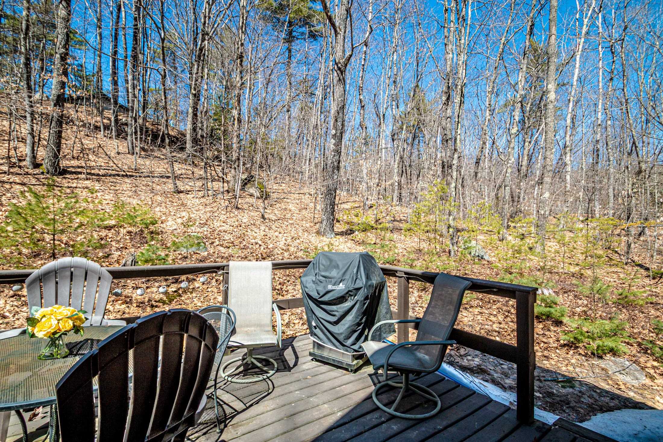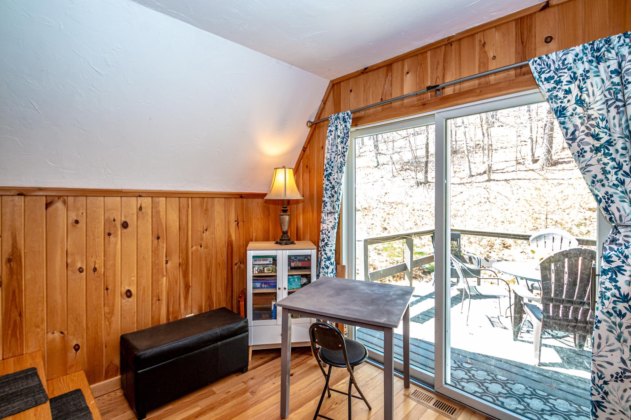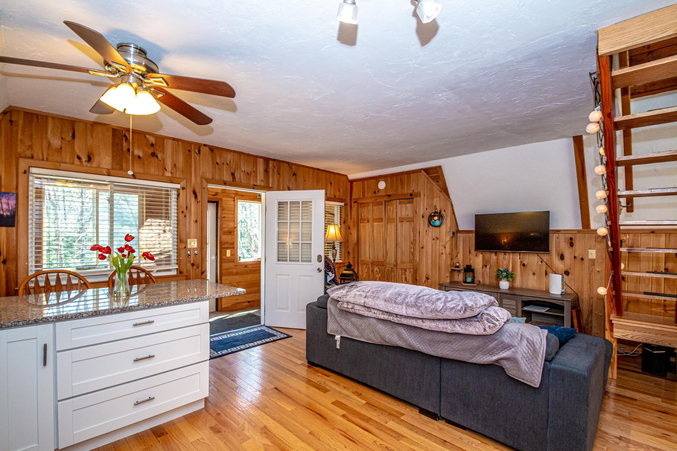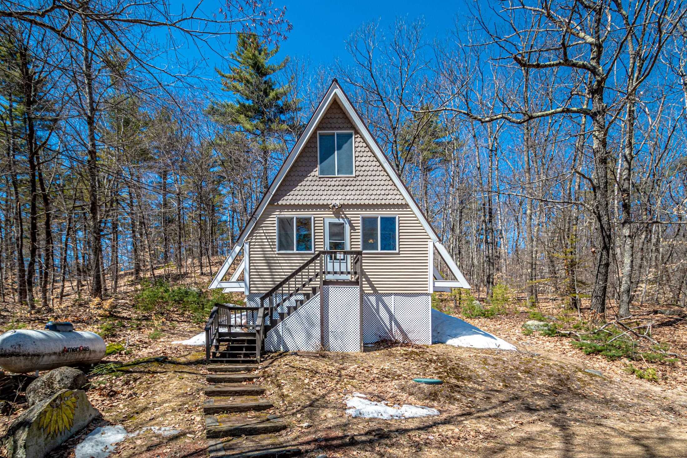 Adorable 2-bedroom house in Eidelweiss, just 1 minute walk to the shared beach on Little Pea Porridge Pond. This property has been lovingly cared for with recent updates to the kitchen and bath. The enclosed front porch can double as a mud room where you can kick off your shoes or stow your gear before entering. Inside you'll see a very efficient use of space in this cozy open concept home. There is hardwood flooring on both levels, with artistic wood inlay designs and a newly tiled bath. The well-designed kitchen has granite counters, quality cabinets and stainless appliances. The living room, full bath and den areas round out the main floor with the2 bedrooms upstairs. There are sliders out to the back deck, there is a fire pit area, plus under the front porch there is access to the basement with locked storage. This is a turnkey property being sold fully furnished down to the dishes! Location is great as you get access to the 3 ponds in Eidelweiss, along with beach and boating access to Silver Lake, close to the mountains for skiing and hiking, rivers for kayaking, plus shopping and restaurants of Mt Washington Valley.