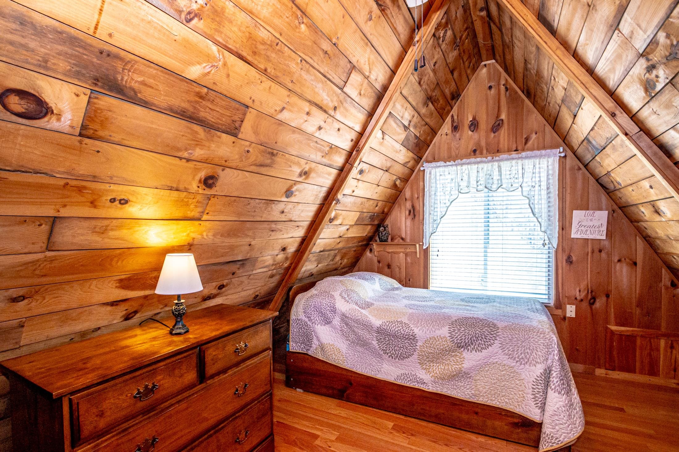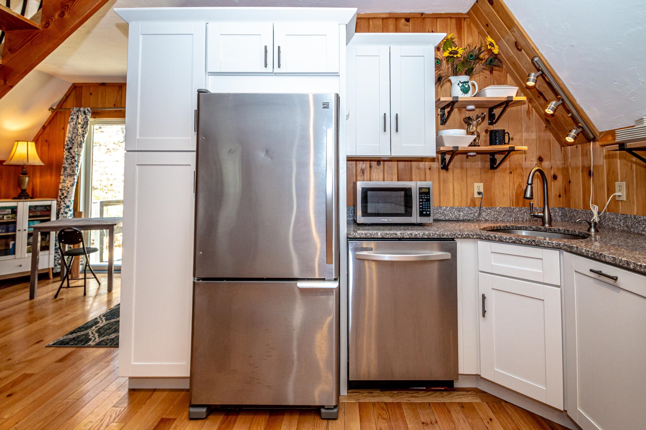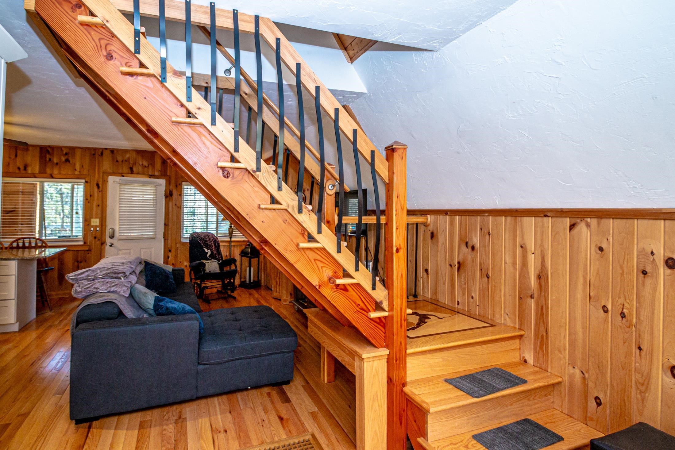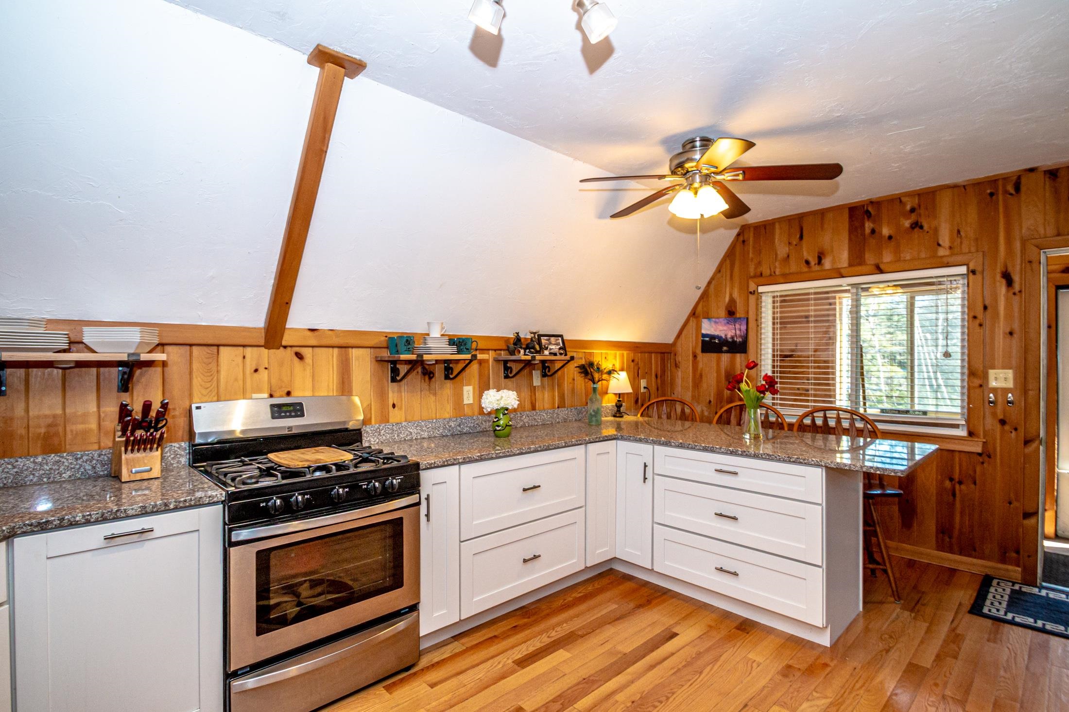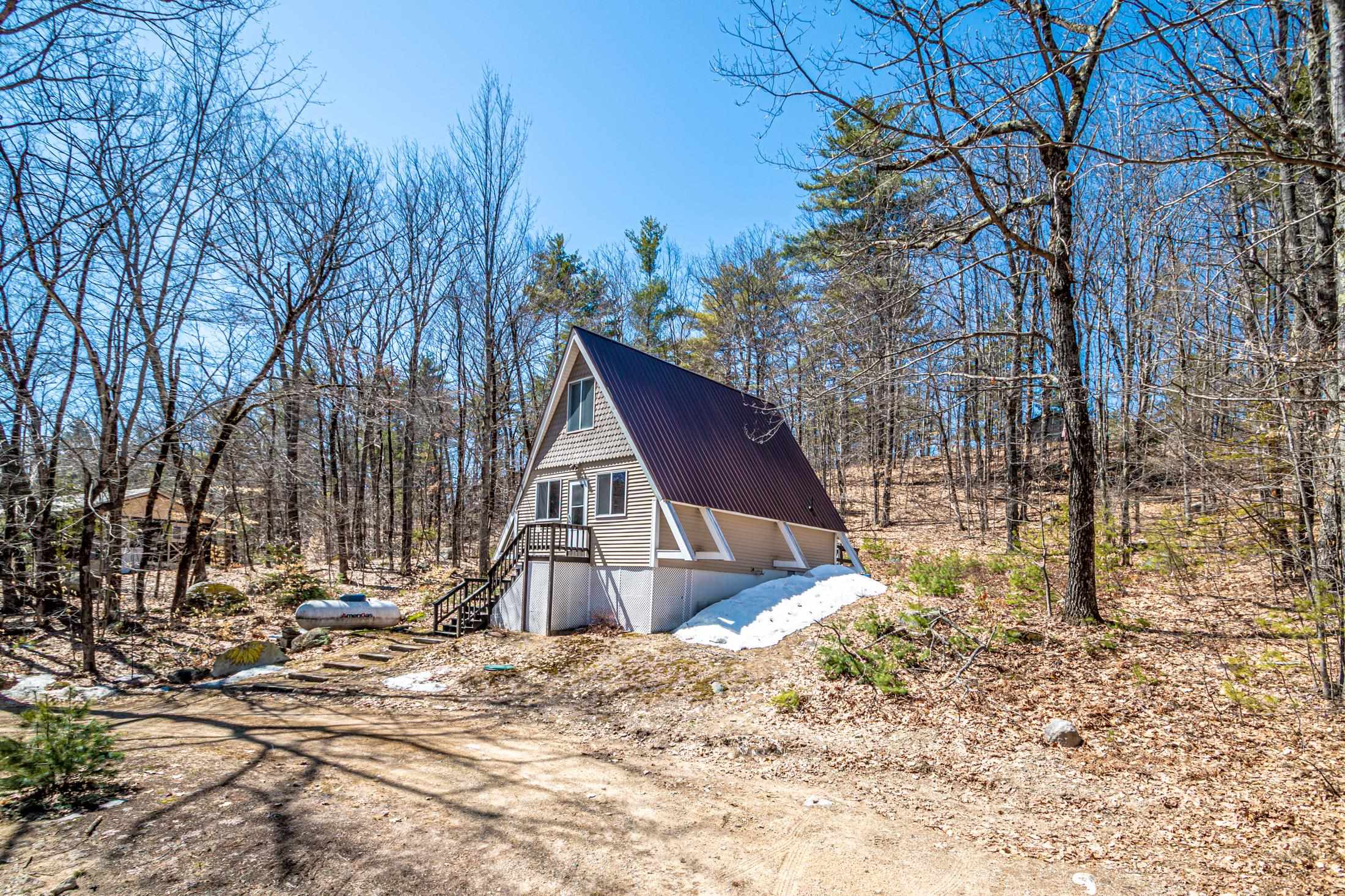 Adorable 2-bedroom house in Eidelweiss, just 1 minute walk to the shared beach on Little Pea Porridge Pond. This property has been lovingly cared for with recent updates to the kitchen and bath. The enclosed front porch can double as a mud room where you can kick off your shoes or stow your gear before entering. Inside you'll see a very efficient use of space in this cozy open concept home. There is hardwood flooring on both levels, with artistic wood inlay designs and a newly tiled bath. The well-designed kitchen has granite counters, quality cabinets and stainless appliances. The living room, full bath and den areas round out the main floor with the2 bedrooms upstairs. There are sliders out to the back deck, there is a fire pit area, plus under the front porch there is access to the basement with locked storage. This is a turnkey property being sold fully furnished down to the dishes! Location is great as you get access to the 3 ponds in Eidelweiss, along with beach and boating access to Silver Lake, close to the mountains for skiing and hiking, rivers for kayaking, plus shopping and restaurants of Mt Washington Valley.