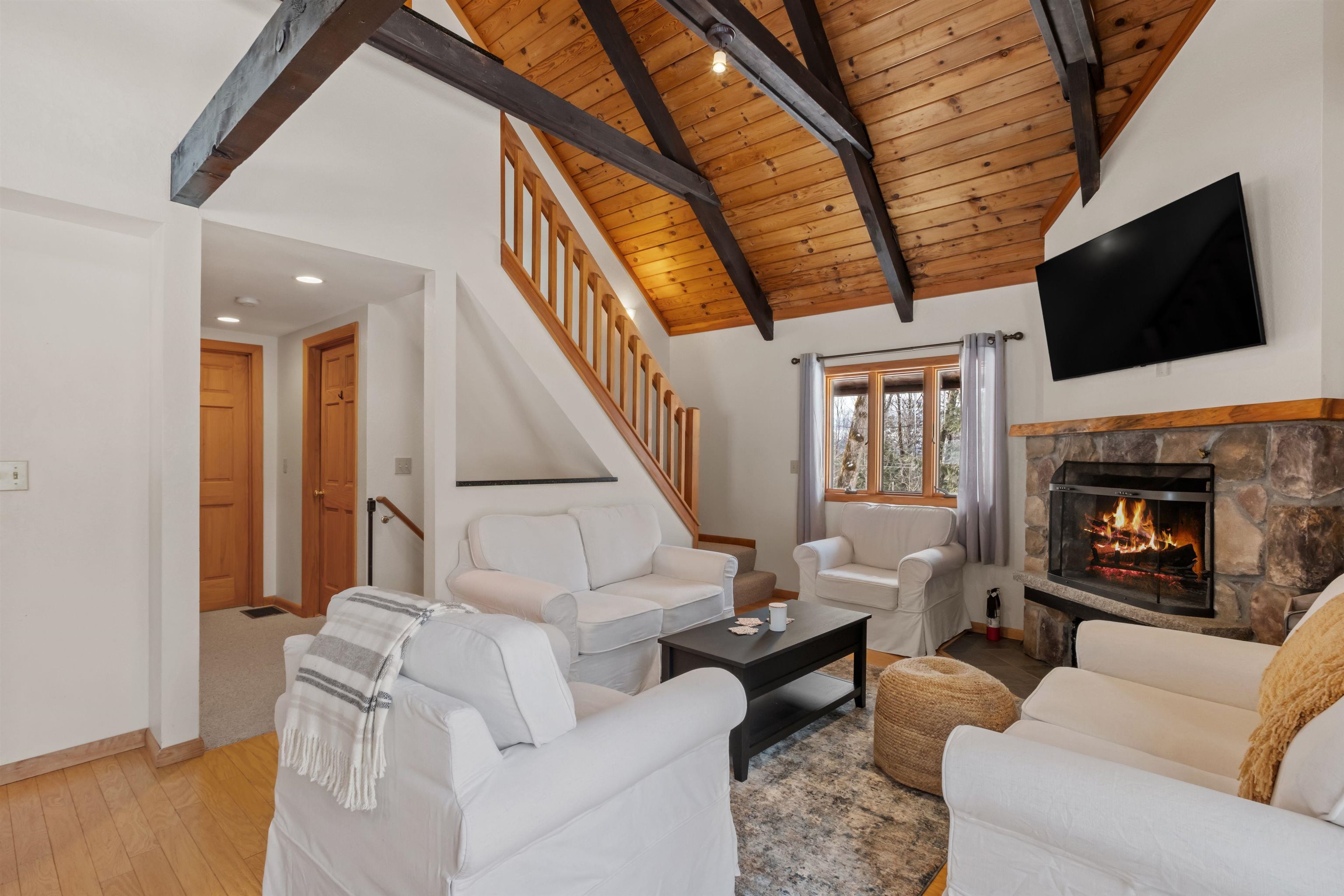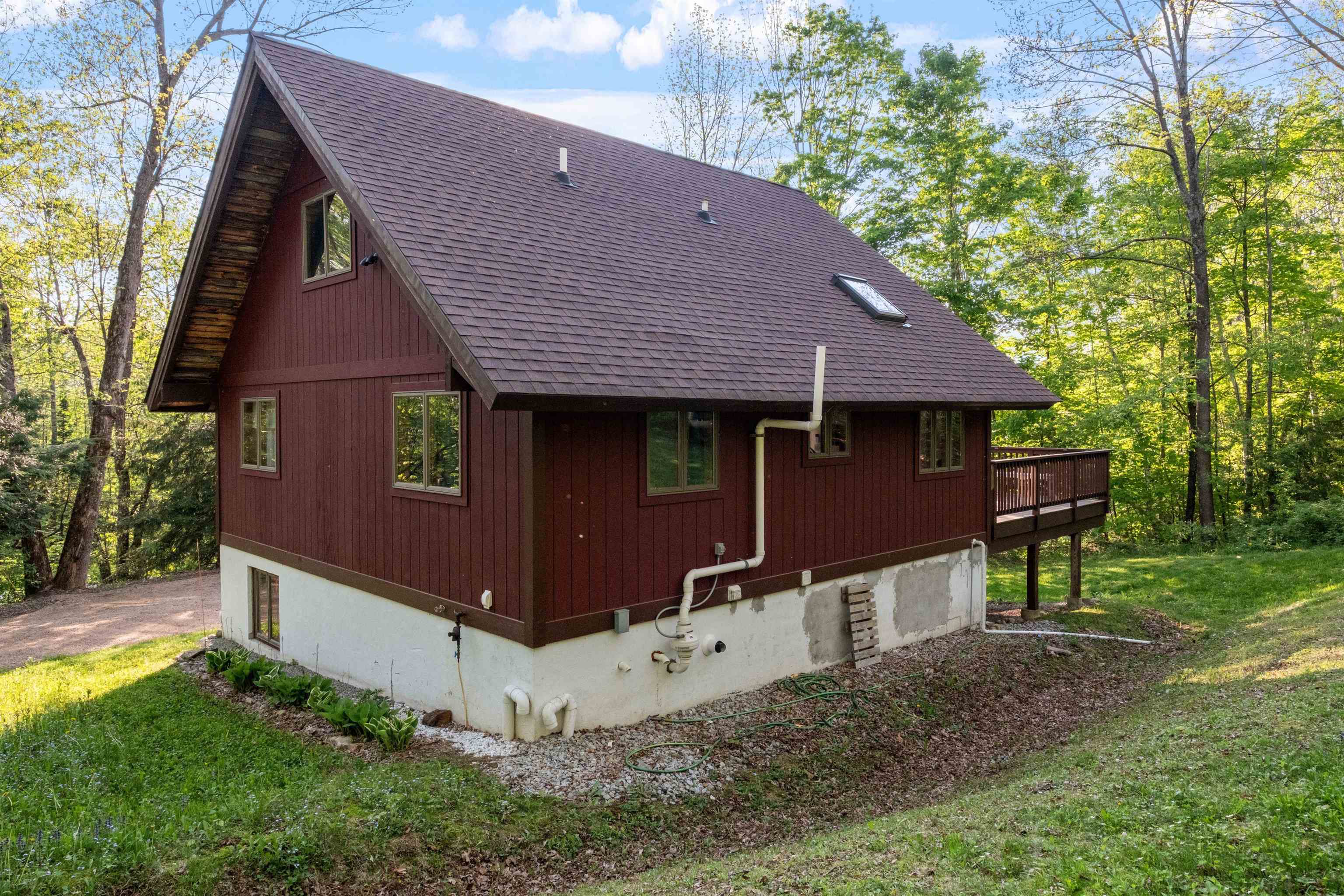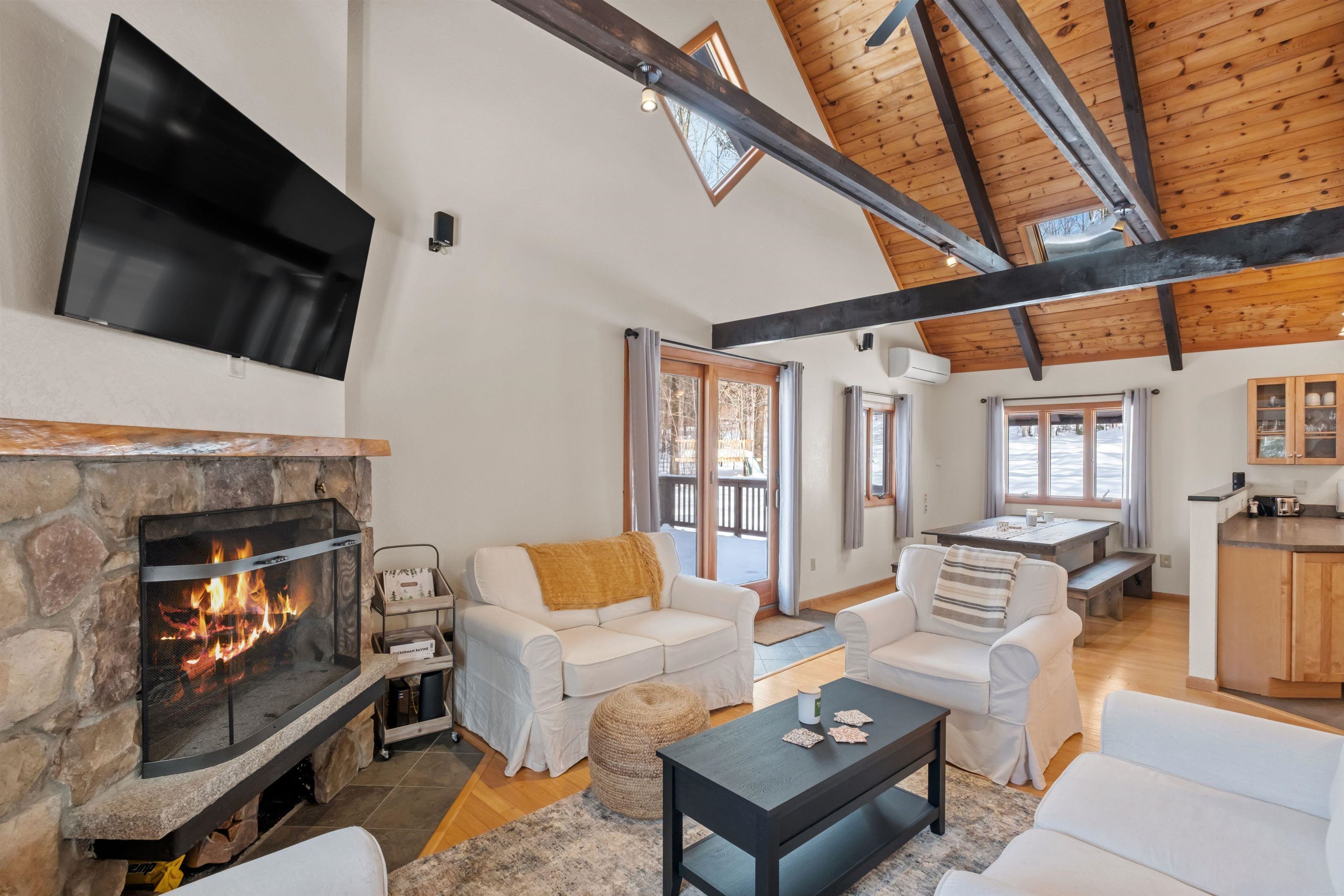 Your dream mountain getaway awaits! This beautiful Jackson chalet is just minutes from skiing, hiking, golf, restaurants, and more, yet still feels like a peaceful retreat from the hustle and bustle of everyday life. Enter into the lower level where there's a convenient mudroom/storage space for boots, gear, and more. There's also a spacious playroom/second living area on the lower level, perfect for large groups or families looking to spread out, plus a bonus room and a full bath. Head upstairs into the main living level and you'll be awed by the cathedral ceilings with exposed beams and beautiful stone fireplace in the open space. Skylights keep the space bright, as do the glass sliders leading out to the huge deck where you may enjoy dining al fresco, or perhaps a relaxing nightcap while enjoying the incredible stargazing the mountains have to offer. Whip up delicious meals in the impressive kitchen, open to the living room, with its natural wood cabinets and ample counter space. Two nicely sized bedrooms are also located on the main level, with a shared 3/4 bath. Heading up one more level is the gorgeous primary suite with a full bath including a separate shower and jetted tub. Outside the yard is grassy and sprawling, with a convenient detached shed for even more storage. Just five minutes to Black Mountain ski area or downtown Jackson Village for golf, shopping, and dining. Don't let this mountain escape pass you by! Sold furnished.