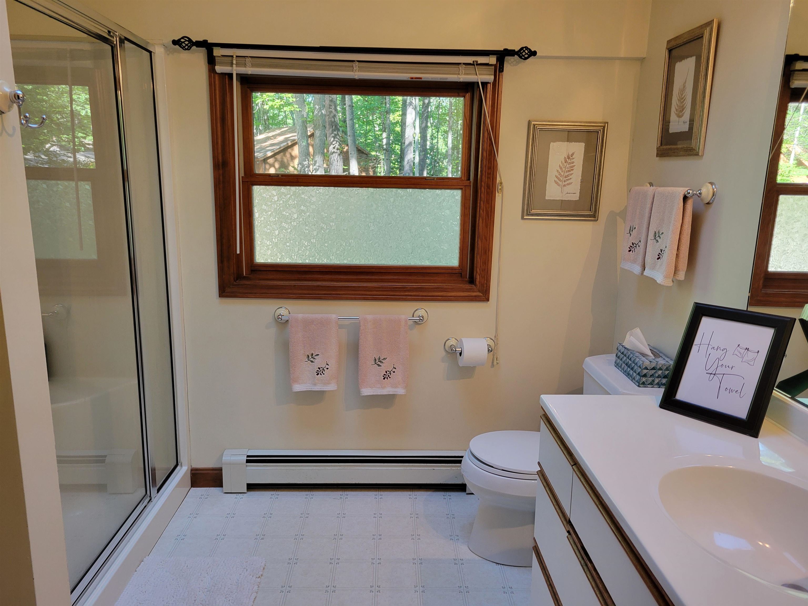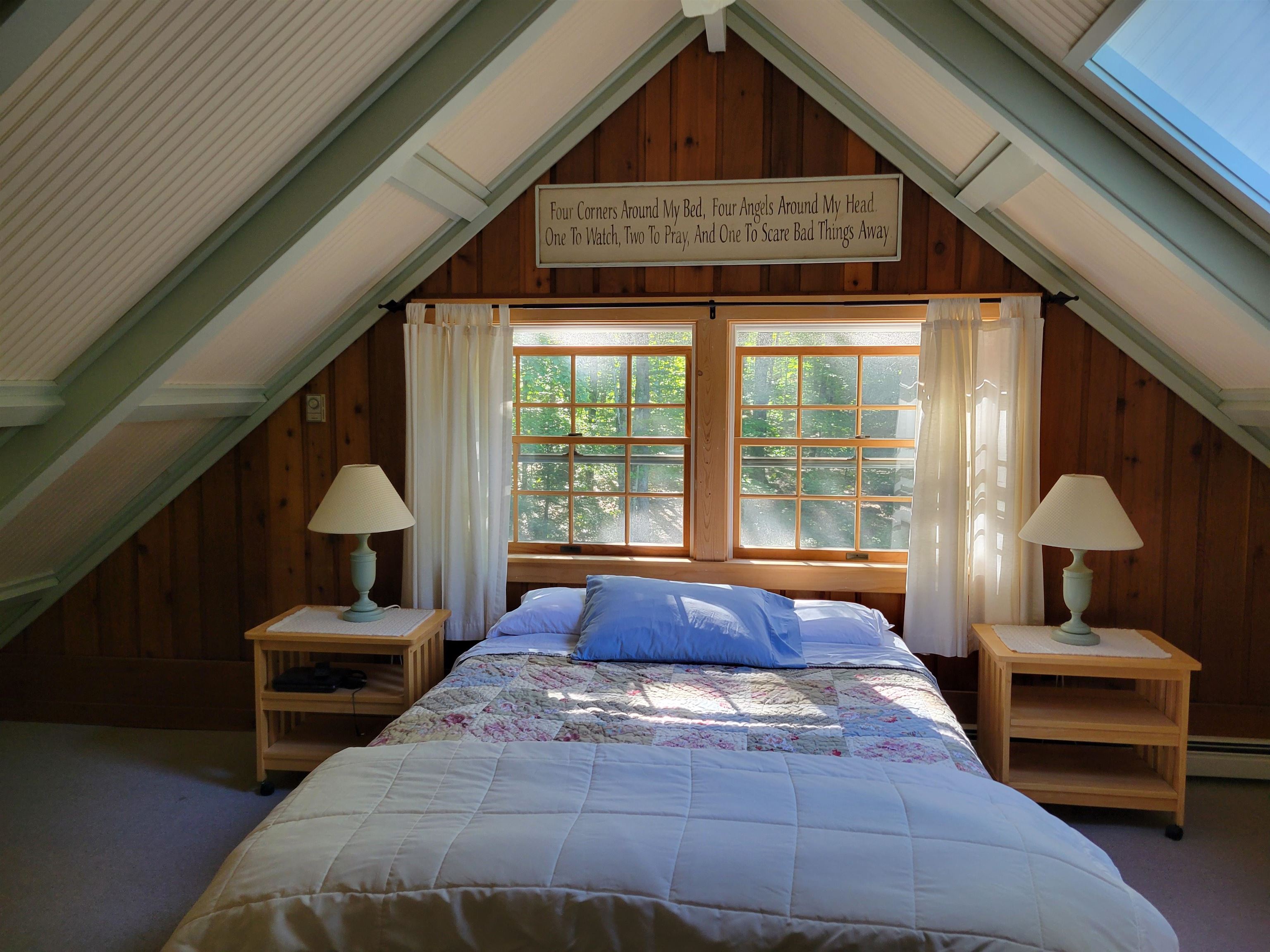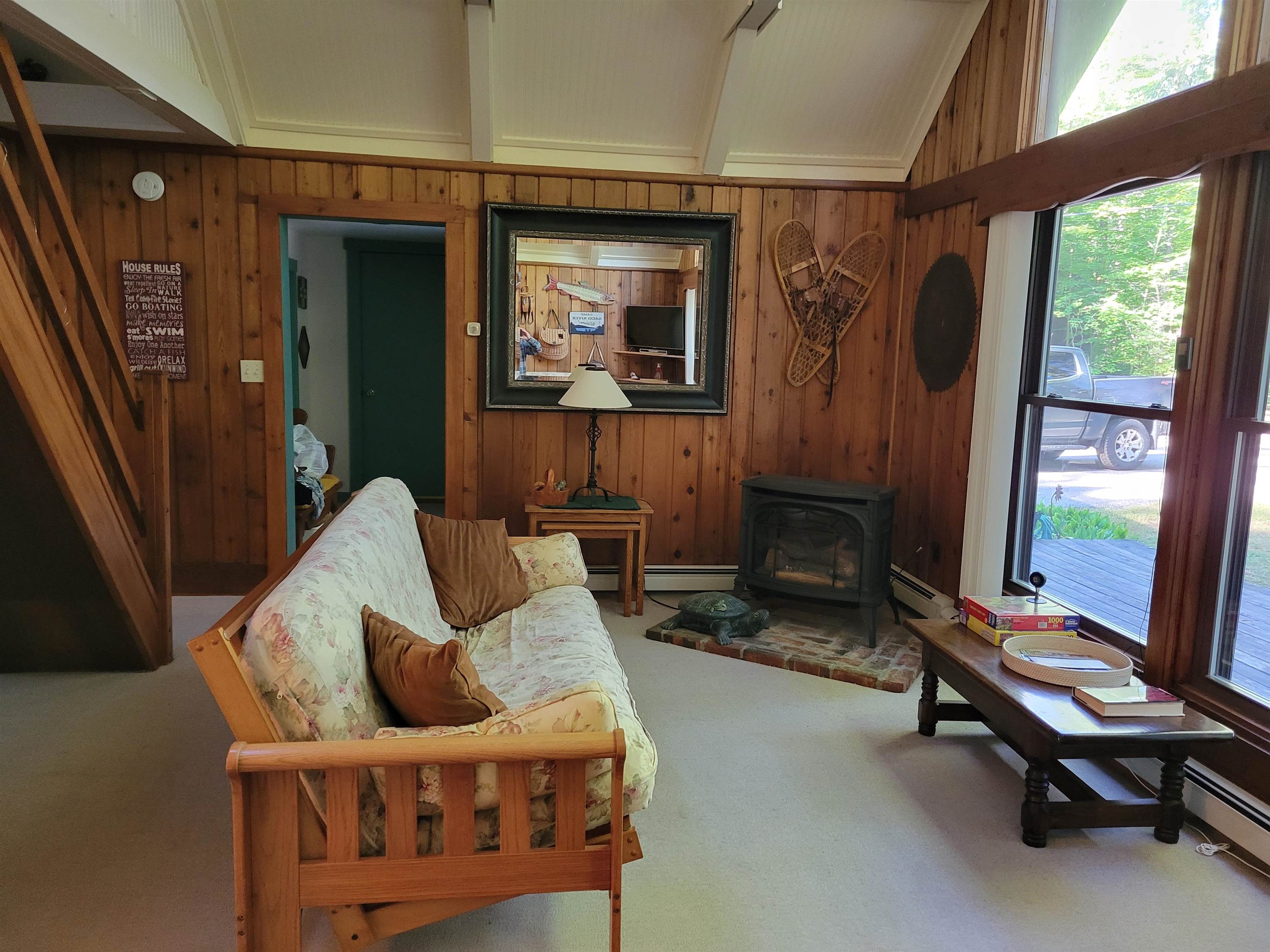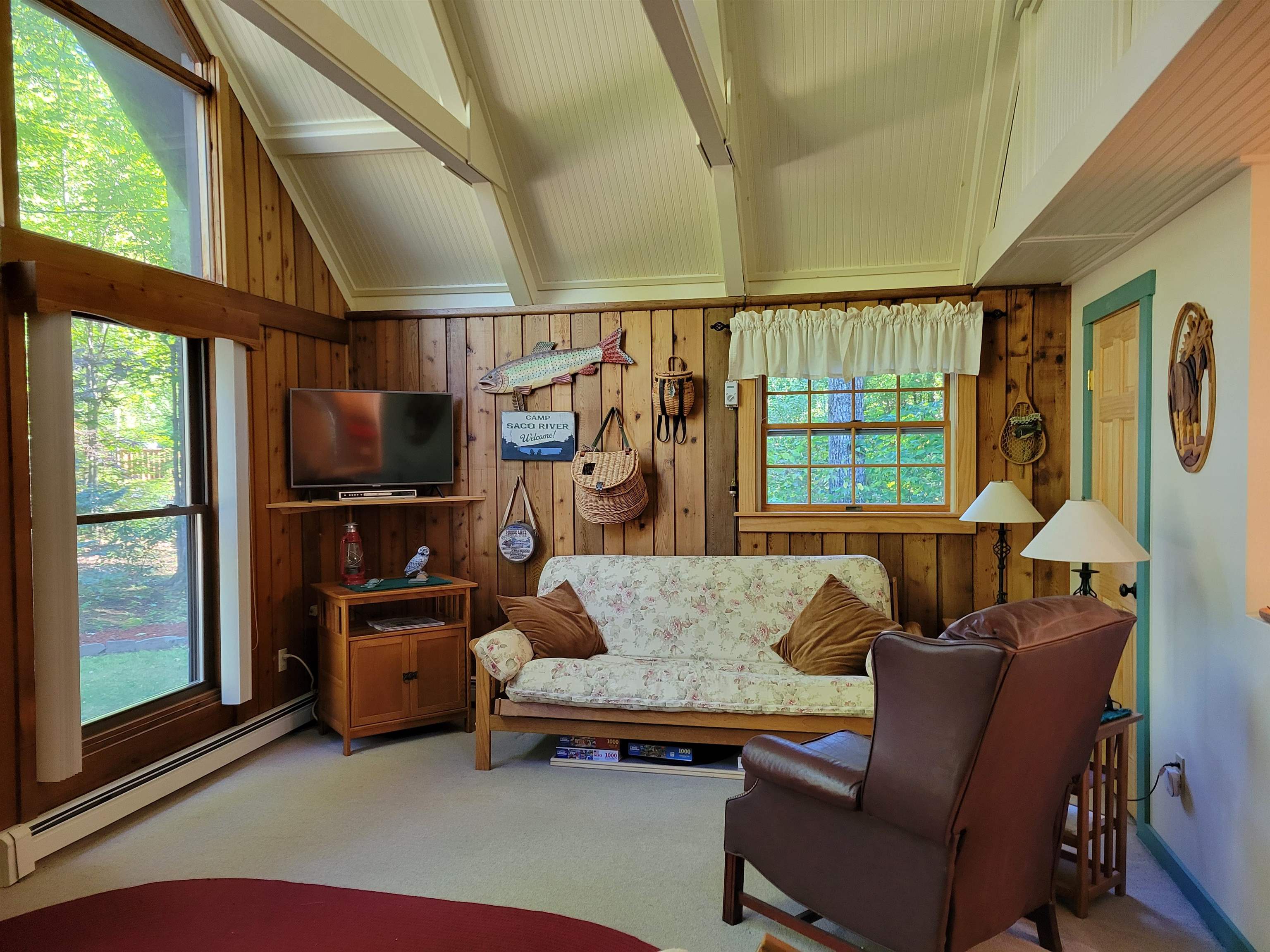 An awesome spot on the Saco River is just 200 yards away to the community owned land on the river. Great area for kayaking, canoeing, swimming, and fishing. Chalet style home with an attached garage, paved driveway, landscaped yard, with a 10 minute drive to North Conway with skiing, golfing, shopping,and restaurants. Two bedrooms plus a loft. Propane fired parlor stove in the large living room. The master bedroom has a newly installed walk in tiled shower. Short drive to the Mt.Washington Valley hiking trails.