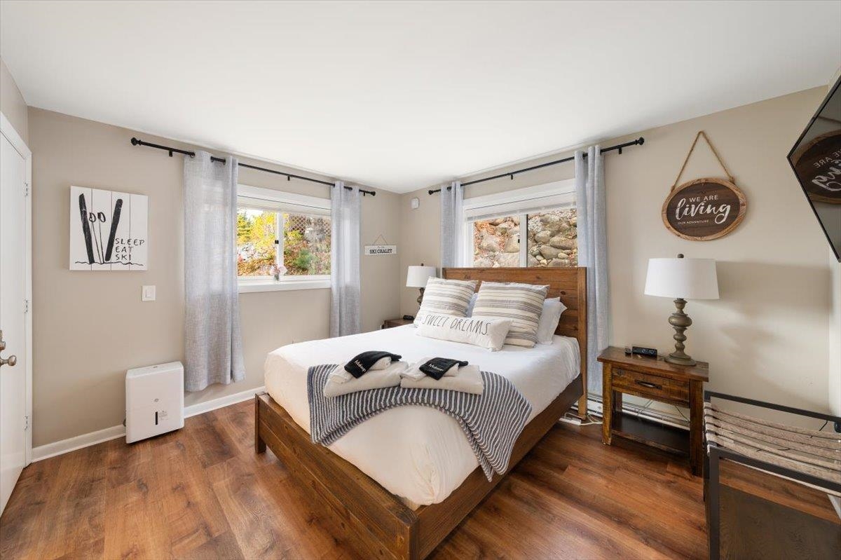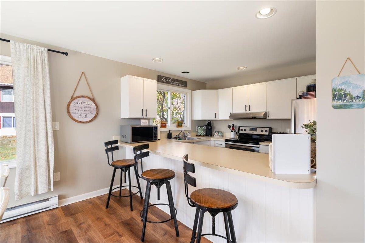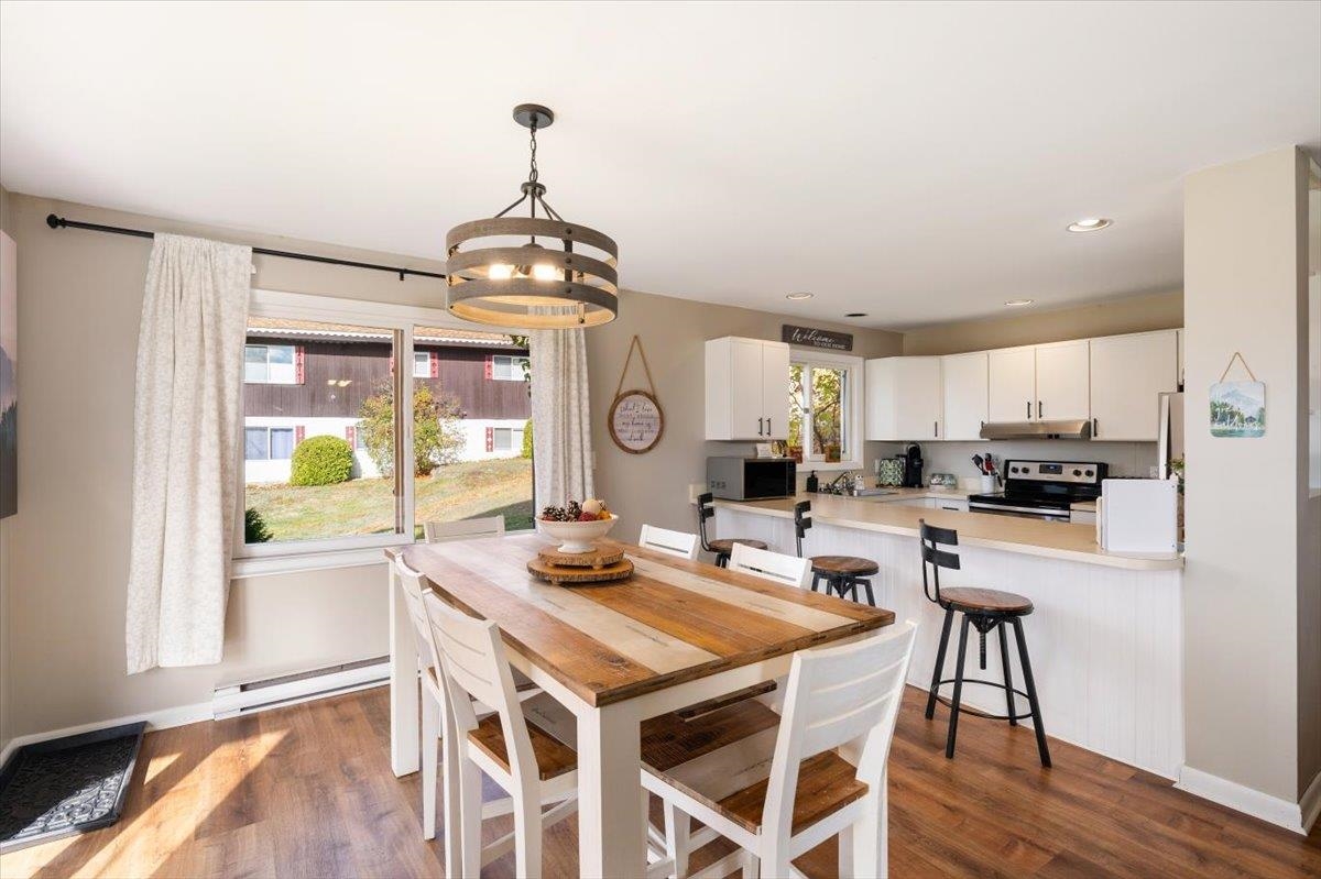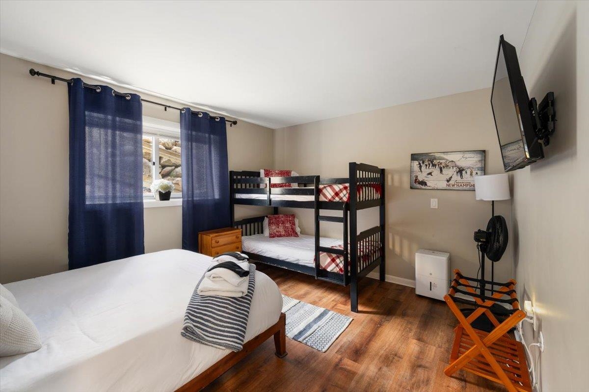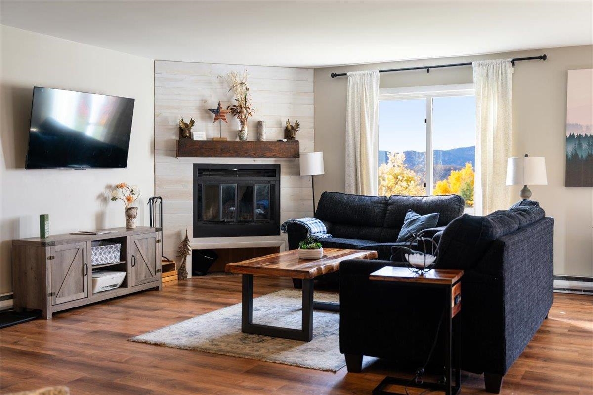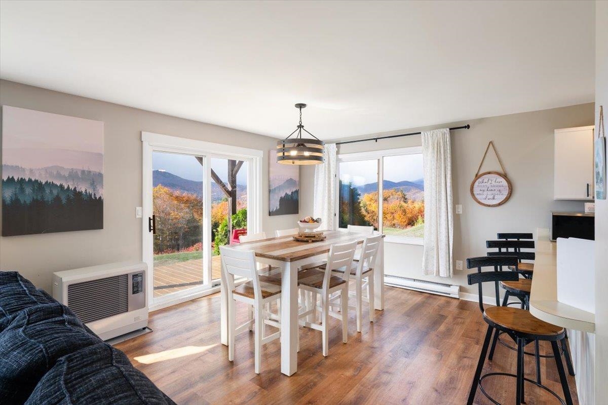 Affectionately known as "Chalet in the Sky" - Enjoy sweeping White Mountain views from this professionally updated 2-bedroom, 2-bath chalet ideally located minutes from Story Land, Attitash, and North Conway. This spacious mountainside condo offers an open-concept living area with large windows, a cozy fireplace, and deck access for year-round enjoyment. The kitchen features modern appliances, a breakfast peninsula, and seating for family gatherings. Comfortable sleeping for up to 8 with two queen bedrooms, a bunk bed, and a sleeper sofa. This turn key unit with proven STR history is perfect for year-round living, a vacation getaway, or an investment property in the heart of the Mount Washington Valley.
